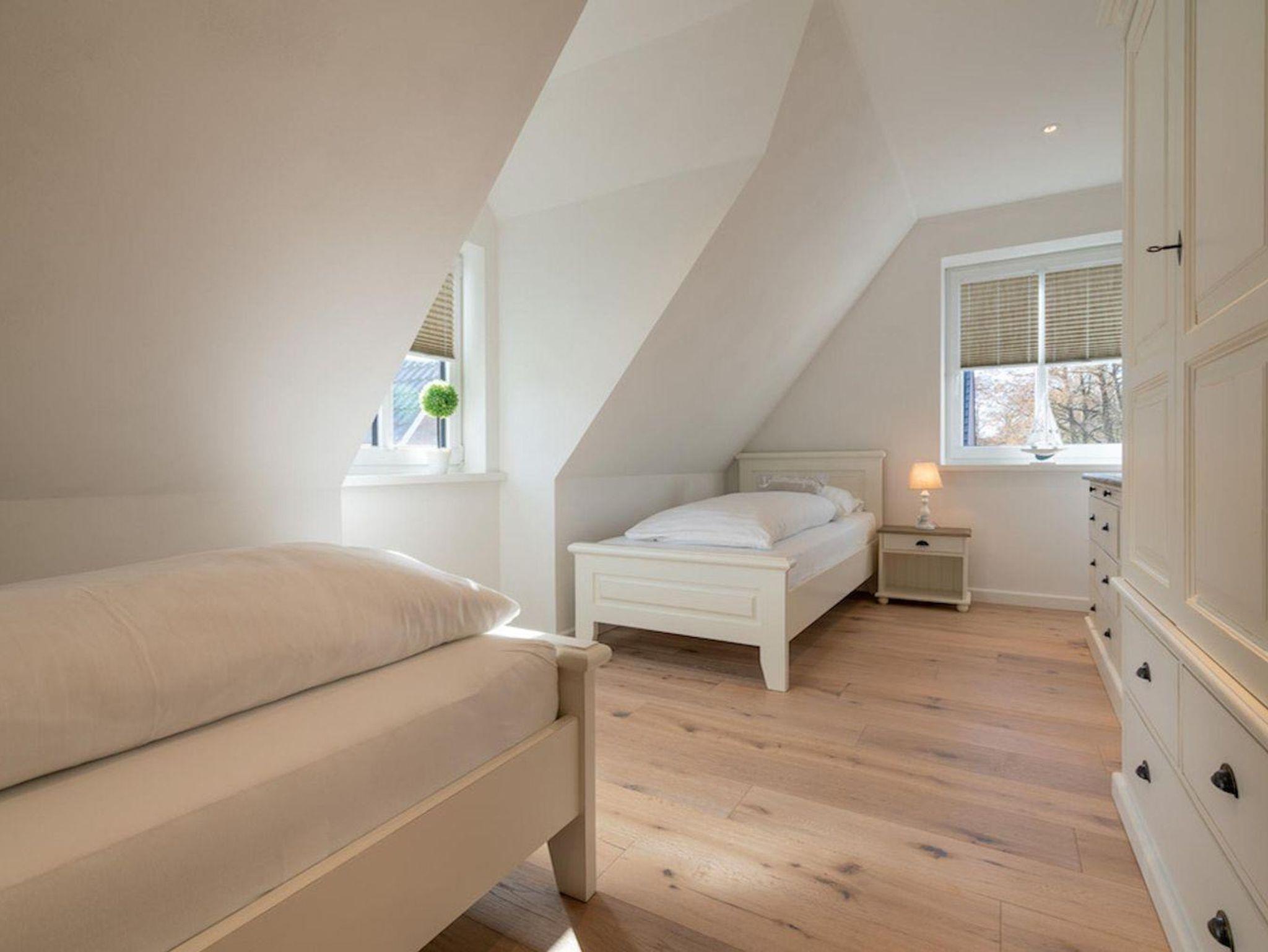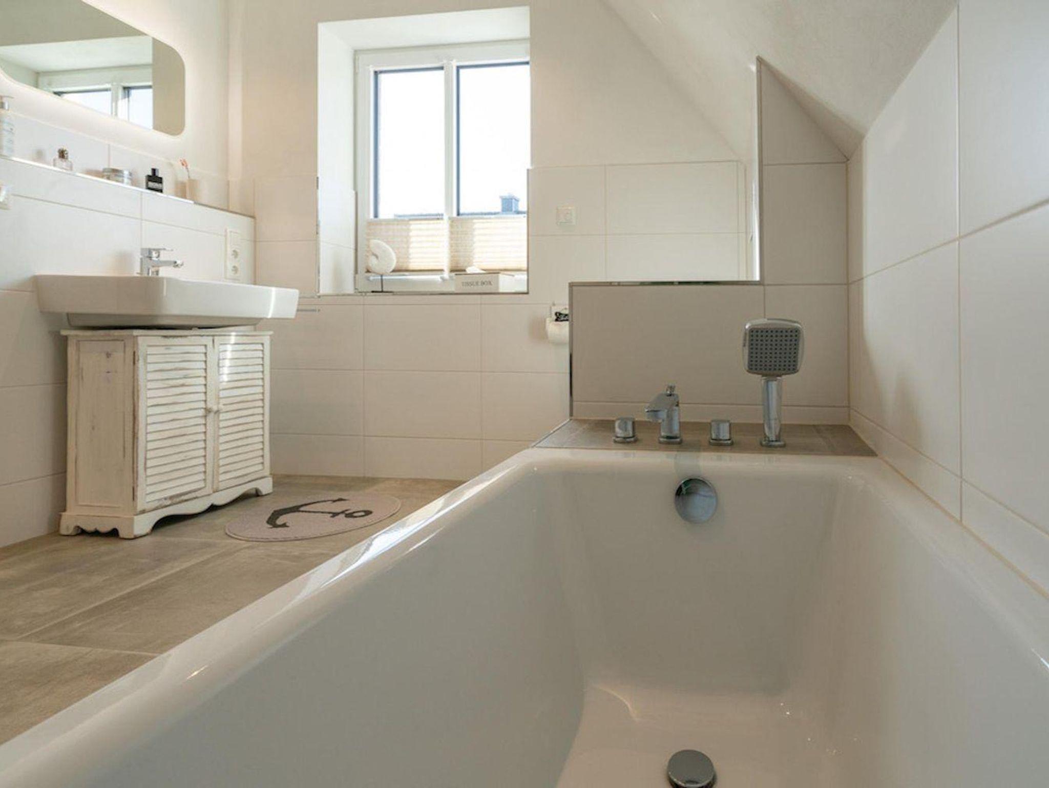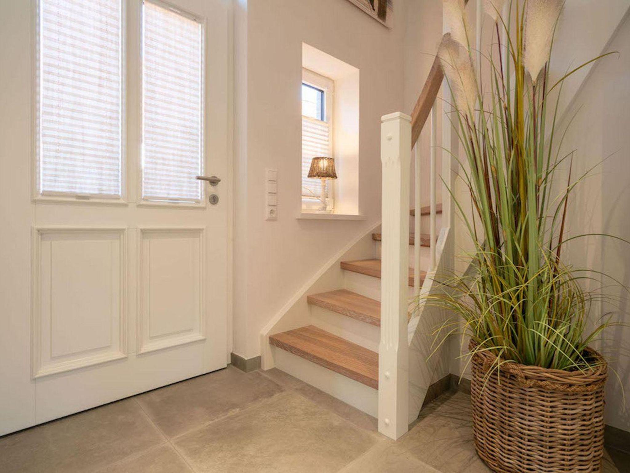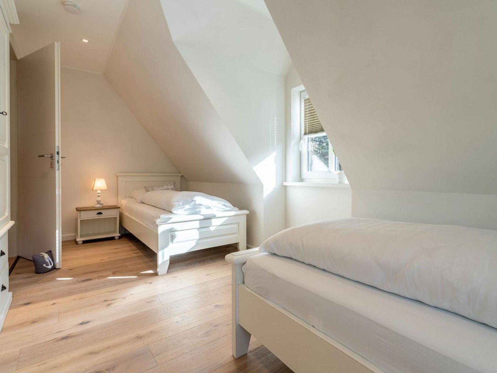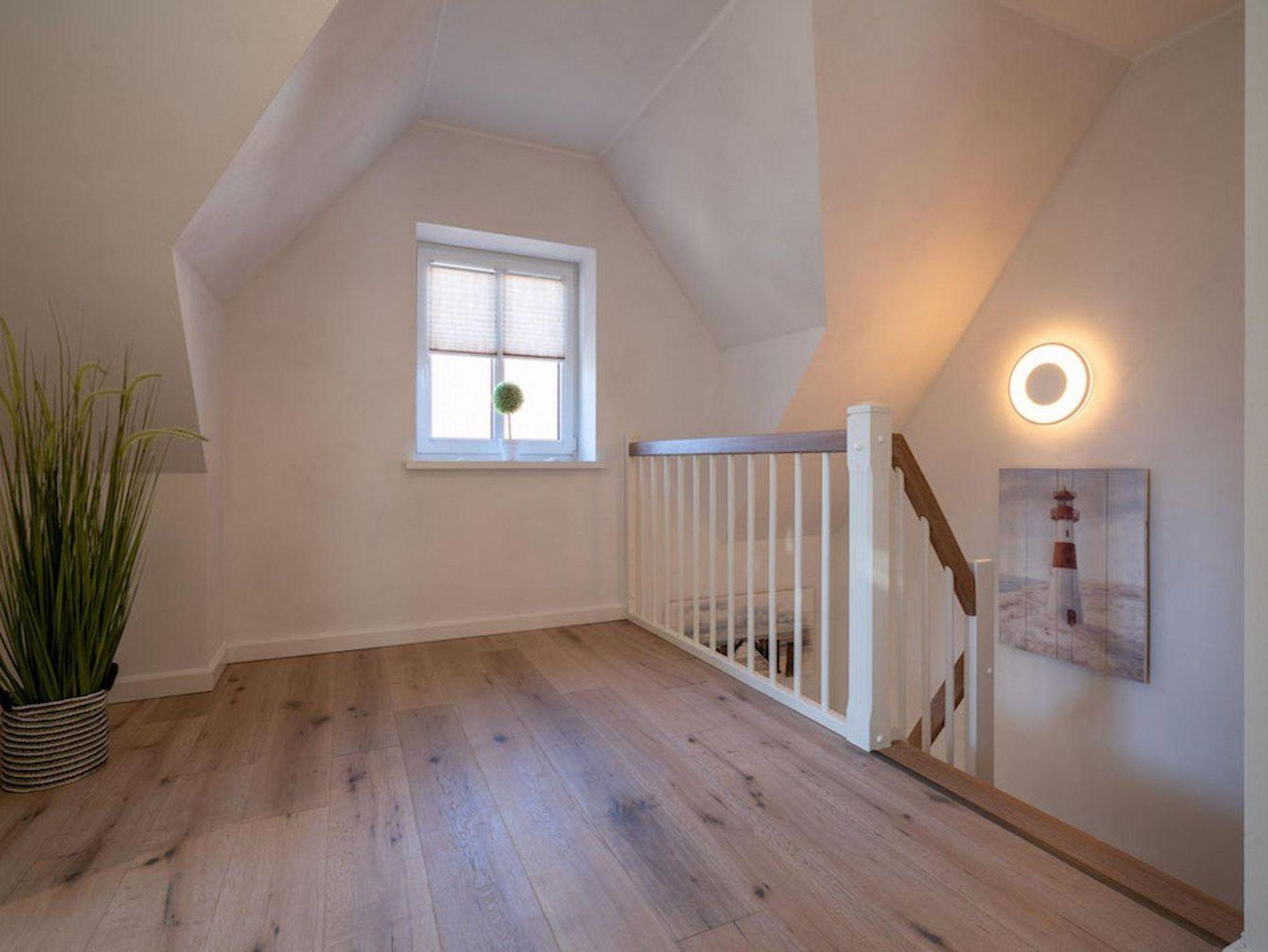 Im Empfangsgereicht ist ein Flur mit Garderobe, von hier aus gelangt man in das Obergeschoss. Hier befindet sich ein Schlafzimmer mit einem Doppelbett und ein Doppelschlafzimmer mit 2 Einzelbetten. Große Fenster sorgen für viel Licht, in diesem Haus kann der Sonnenauf- bzw. untergang genossen werden. Außerdem ist im Obergeschoss ein weiteres Vollbad mit Dusche und Badewanne, sowie ein geräumiger Flur.