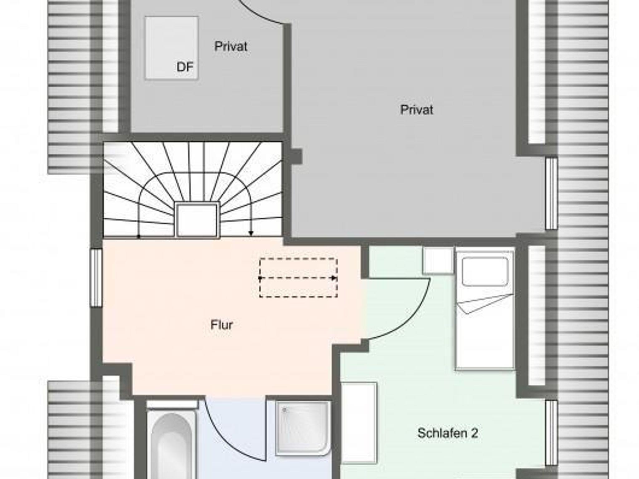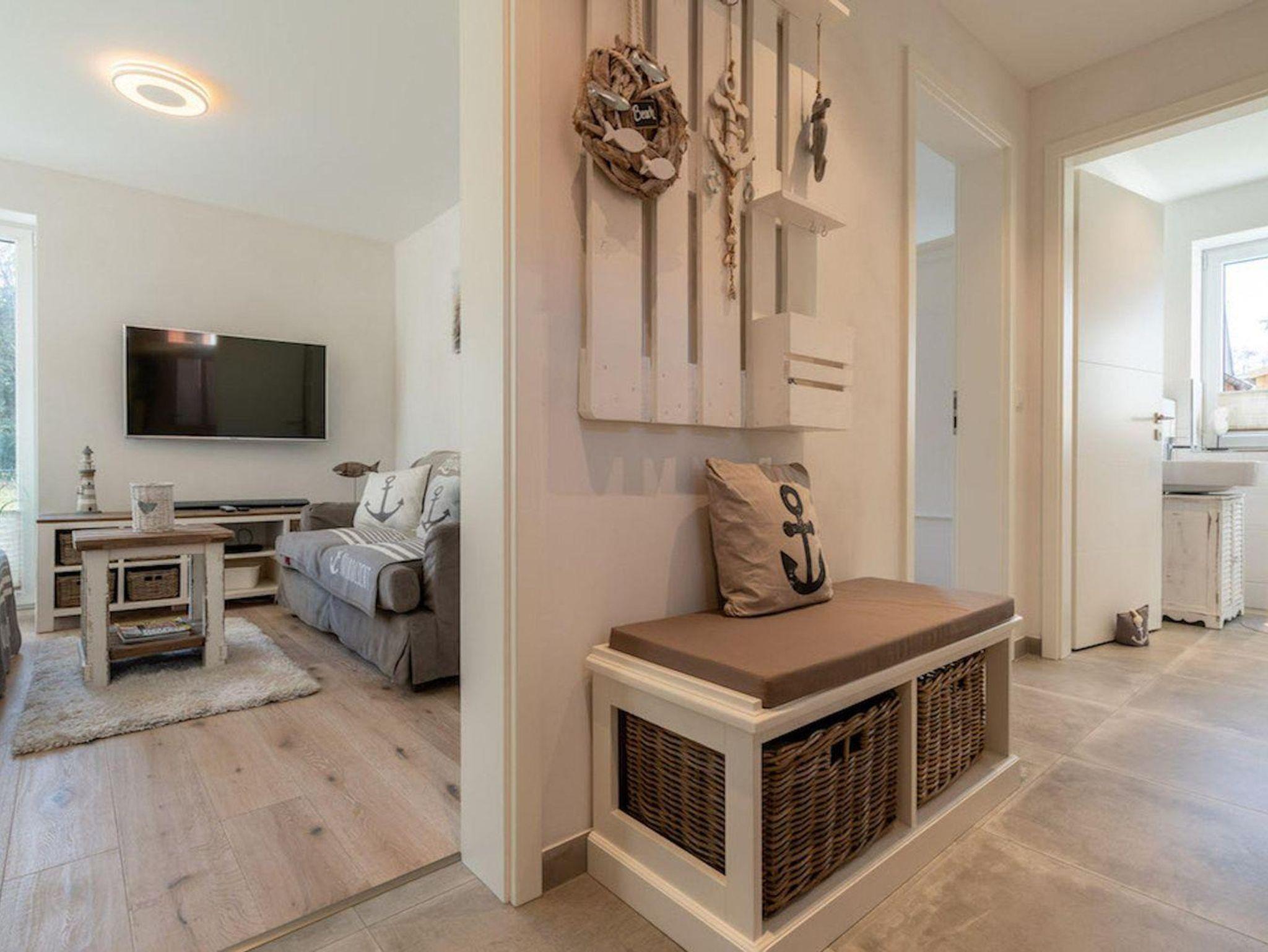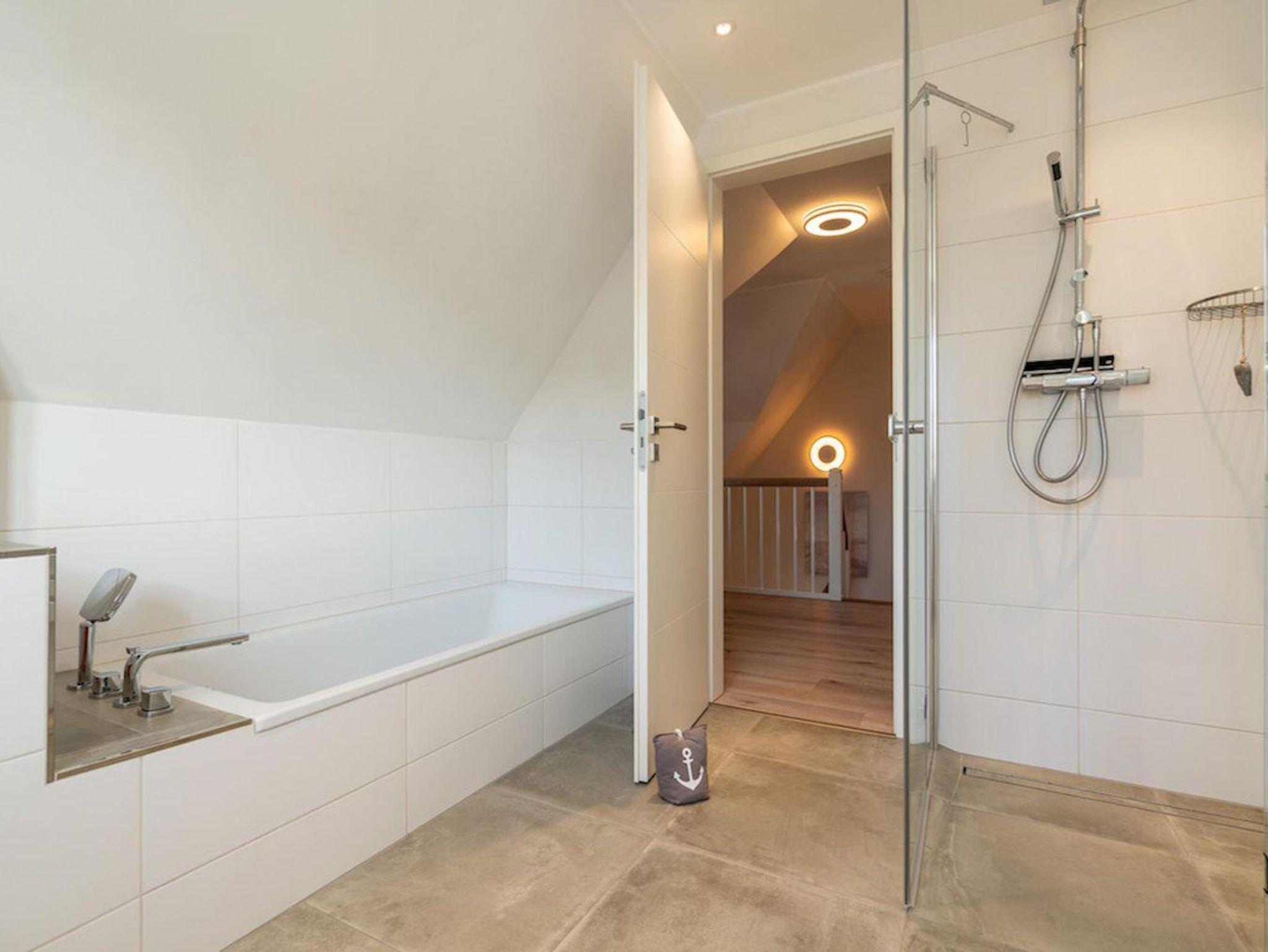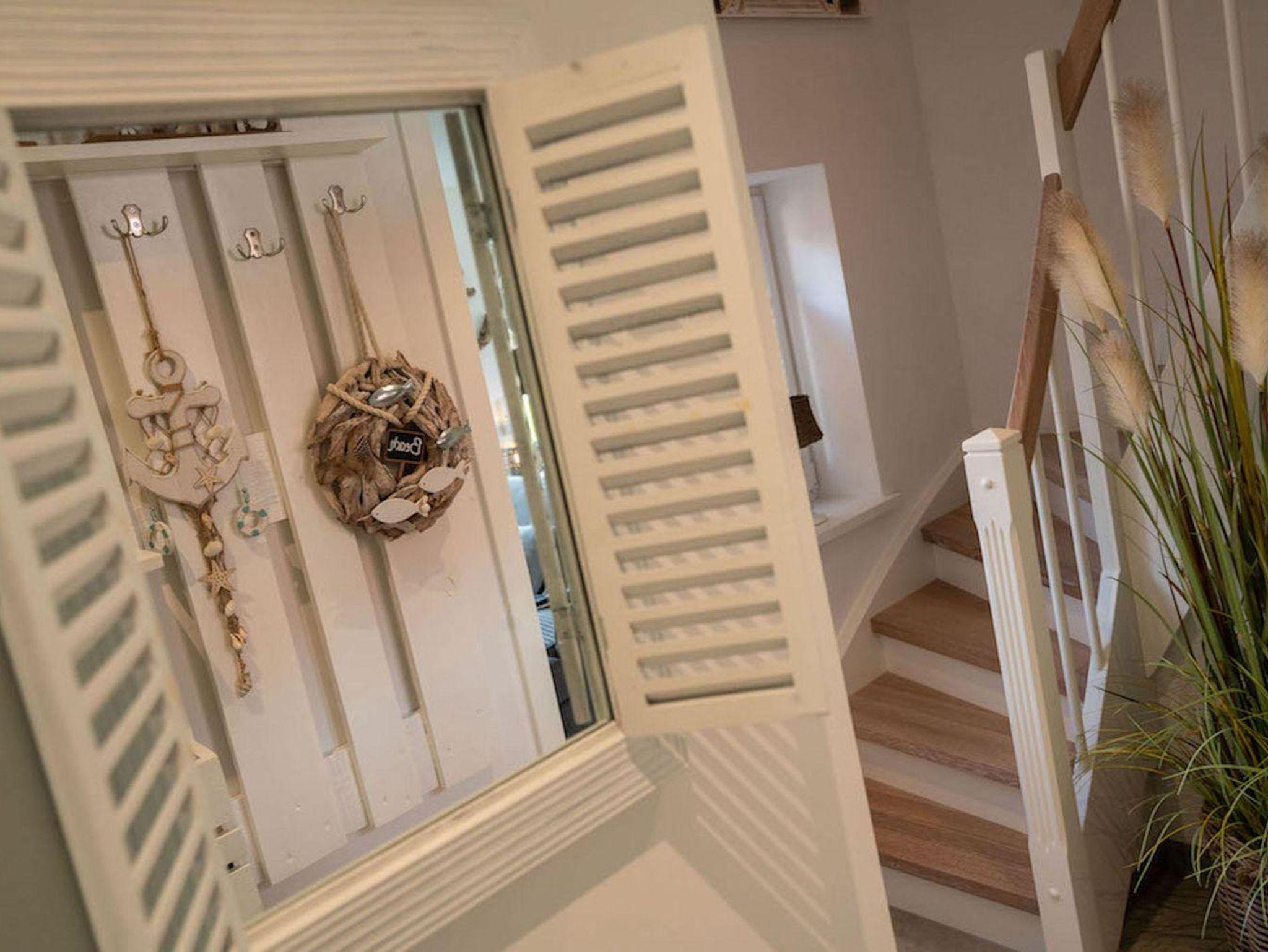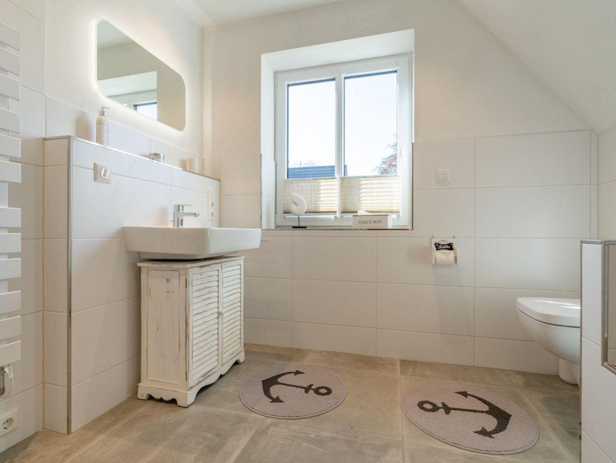 Im Empfangsgereicht ist ein Flur mit Garderobe, von hier aus gelangt man in das Obergeschoss. Hier befindet sich ein Schlafzimmer mit einem Doppelbett und ein Doppelschlafzimmer mit 2 Einzelbetten. Große Fenster sorgen für viel Licht, in diesem Haus kann der Sonnenauf- bzw. untergang genossen werden. Außerdem ist im Obergeschoss ein weiteres Vollbad mit Dusche und Badewanne, sowie ein geräumiger Flur.