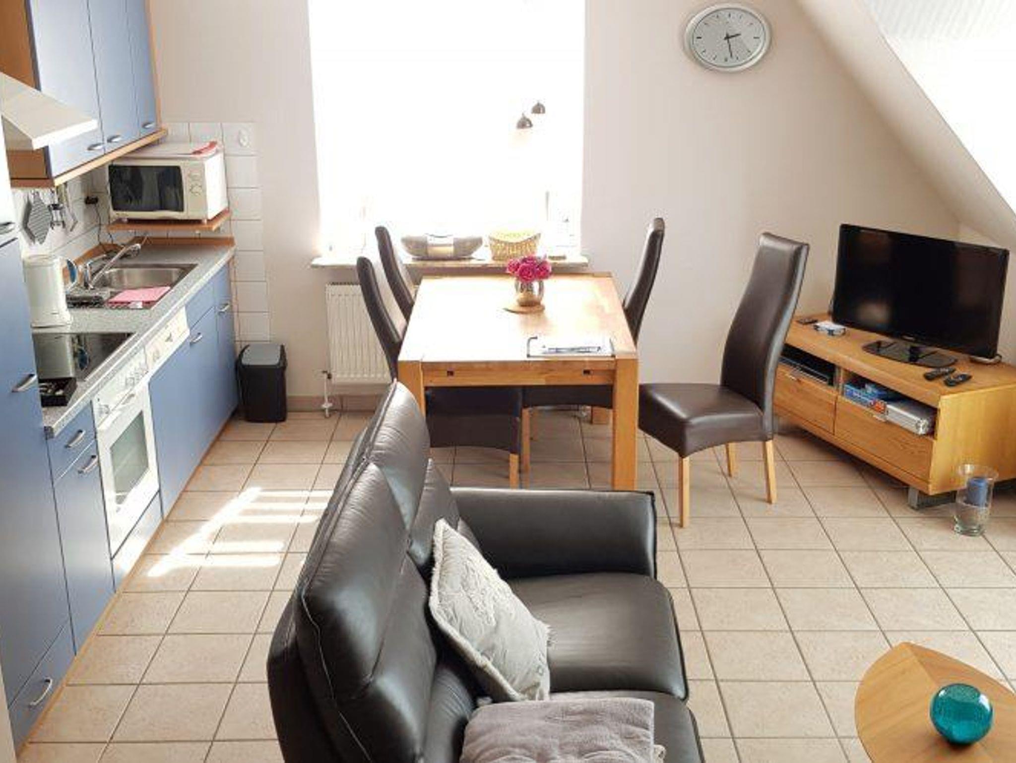 Wohn-Essraum mit zwei Sofas, SAT-TV, offene Küche mit Ceranfeld ,Backofen, Mikrowelle, Kaffeefiltermaschine (Kapselmaschine gehört nicht zur Ausstattung), Kühlschrank mit Gefrierfach, Geschirrspülmaschine, Essbereich.