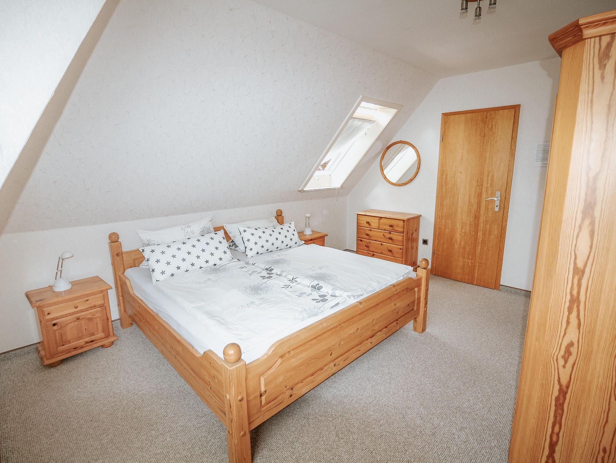 Schafzimmer mit Doppelbett und einem Bad mit Badewanne, Dusche und WC