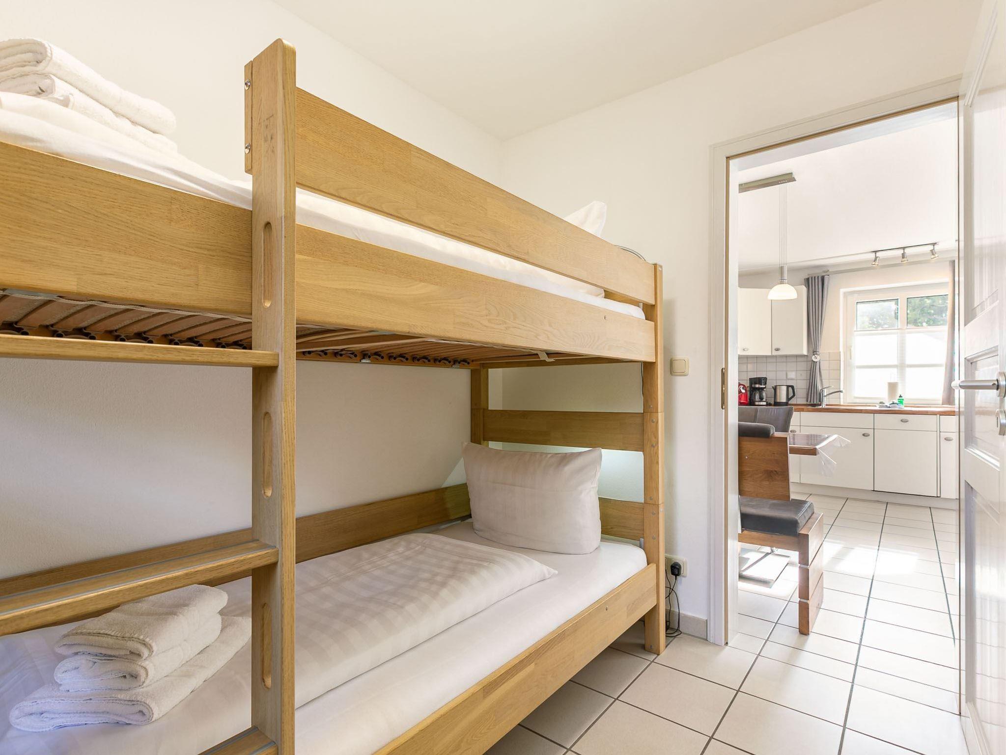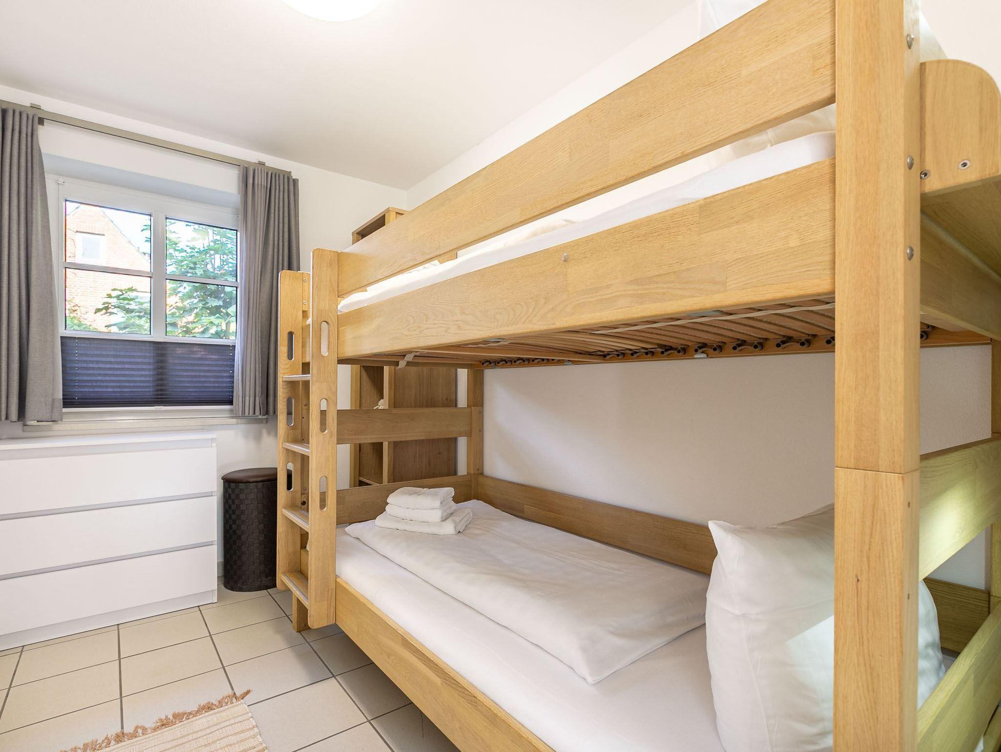 Separates Kinderzimmer mit 2 Etagen-Einzelbetten (je 90x200cm), Einbau-Kleiderschrank, Kommode und Spielregal. Das Fenster hat Fliegengitter.