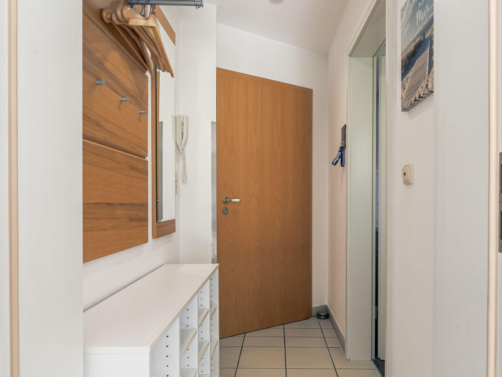 Flur mit Garderobe und Spiegel im Eingangsbereich. Kleiner Abstellraum für Koffer und Haushaltsgeräte im Wohnzimmer. Fußbodenheizung für besondere Behaglichkeit.