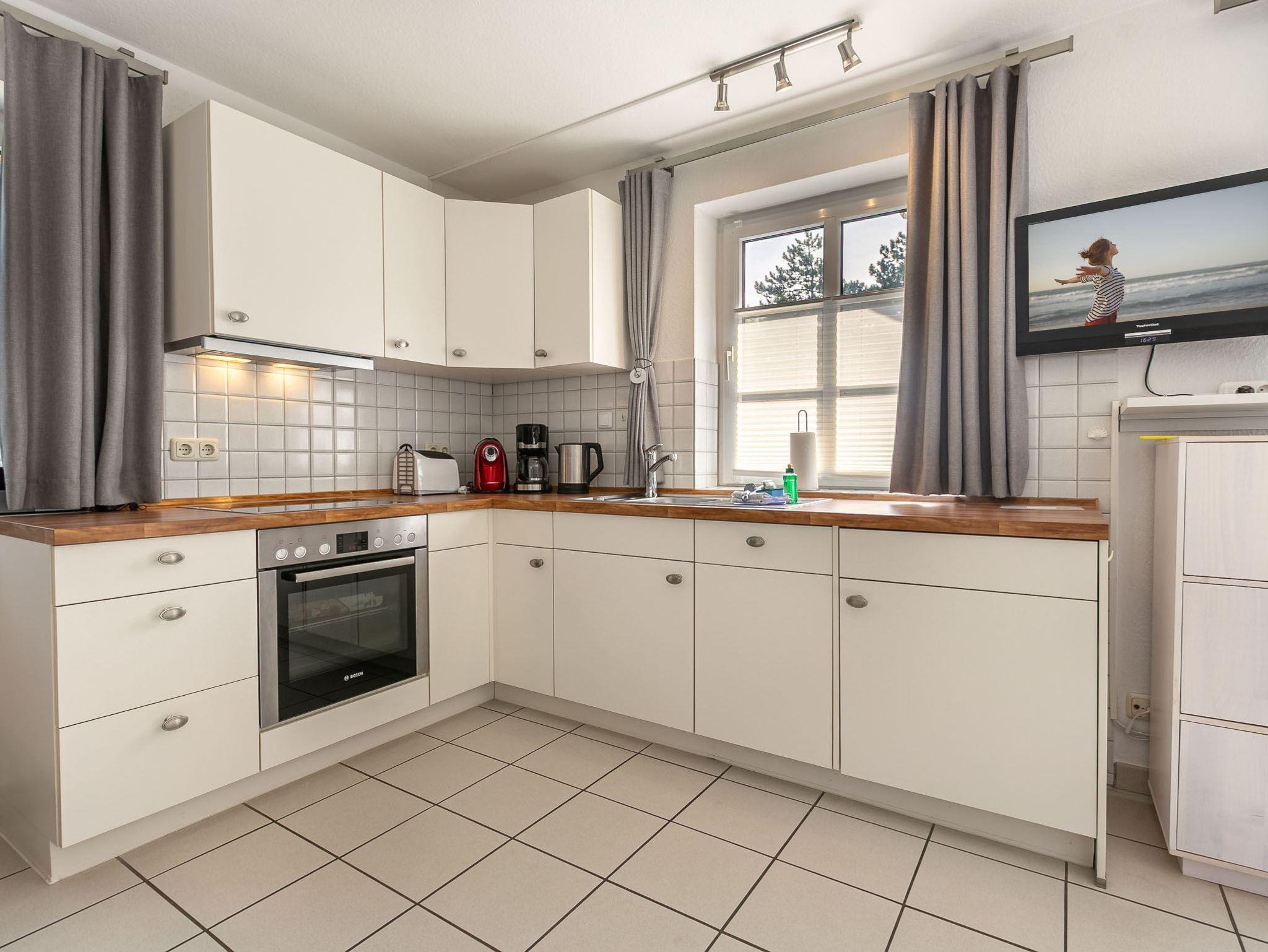 Wohnzimmer mit Doppelbett (2x 90x200cm), großem Sofa mit Ottomane, TV (Kabel) und Esstisch mit gepolsterter Sitzbank und 2 Stühlen. Direkter Zugang zur sonnigen Garten-Terrasse nach Südwesten mit Gartenmöbeln und Sonnenliege. Offene Küche mit Backofen, Geschirrspüler, Kühlschrank mit Gefrierfach und Tchibo Caffissimo Kapsel-Kaffeemaschine.