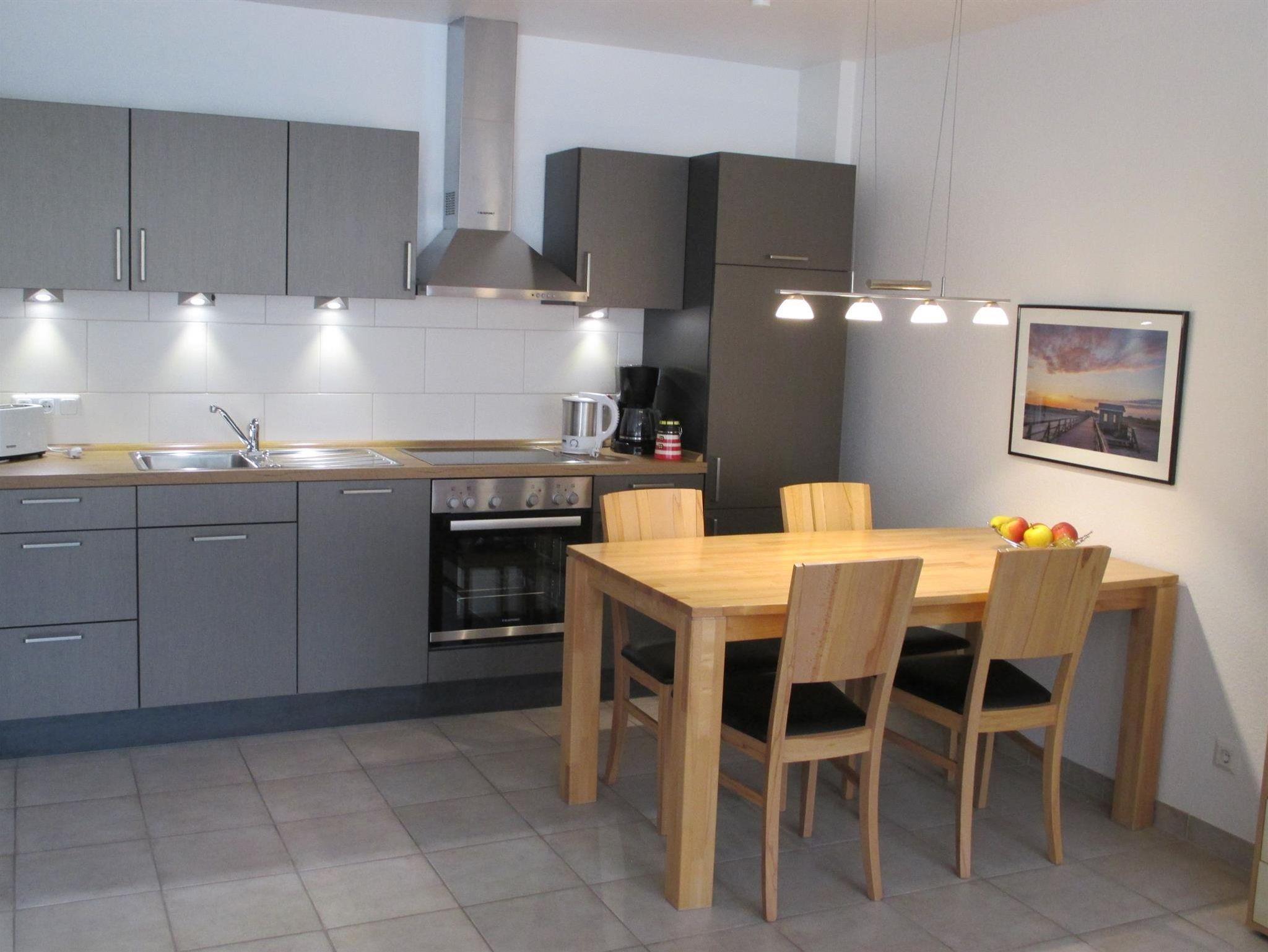 Volleingerichtete neue Einbauküchenzeile (Geschirrspüler) mit Eßecke. Neu ausgestattetes Schlafzimmer mit einem Doppelbett (160x200) mit hochwertigem Lattenrost und 2 Taschenfederkernmatratzen (80x200), Duschbad/WC. Kostenfreier Internetanschluss vorhanden.