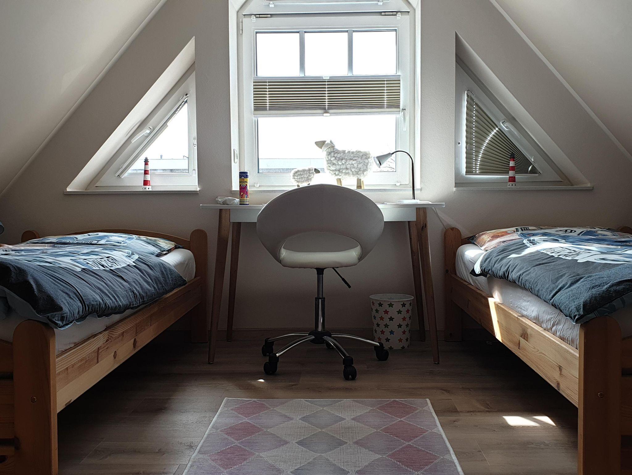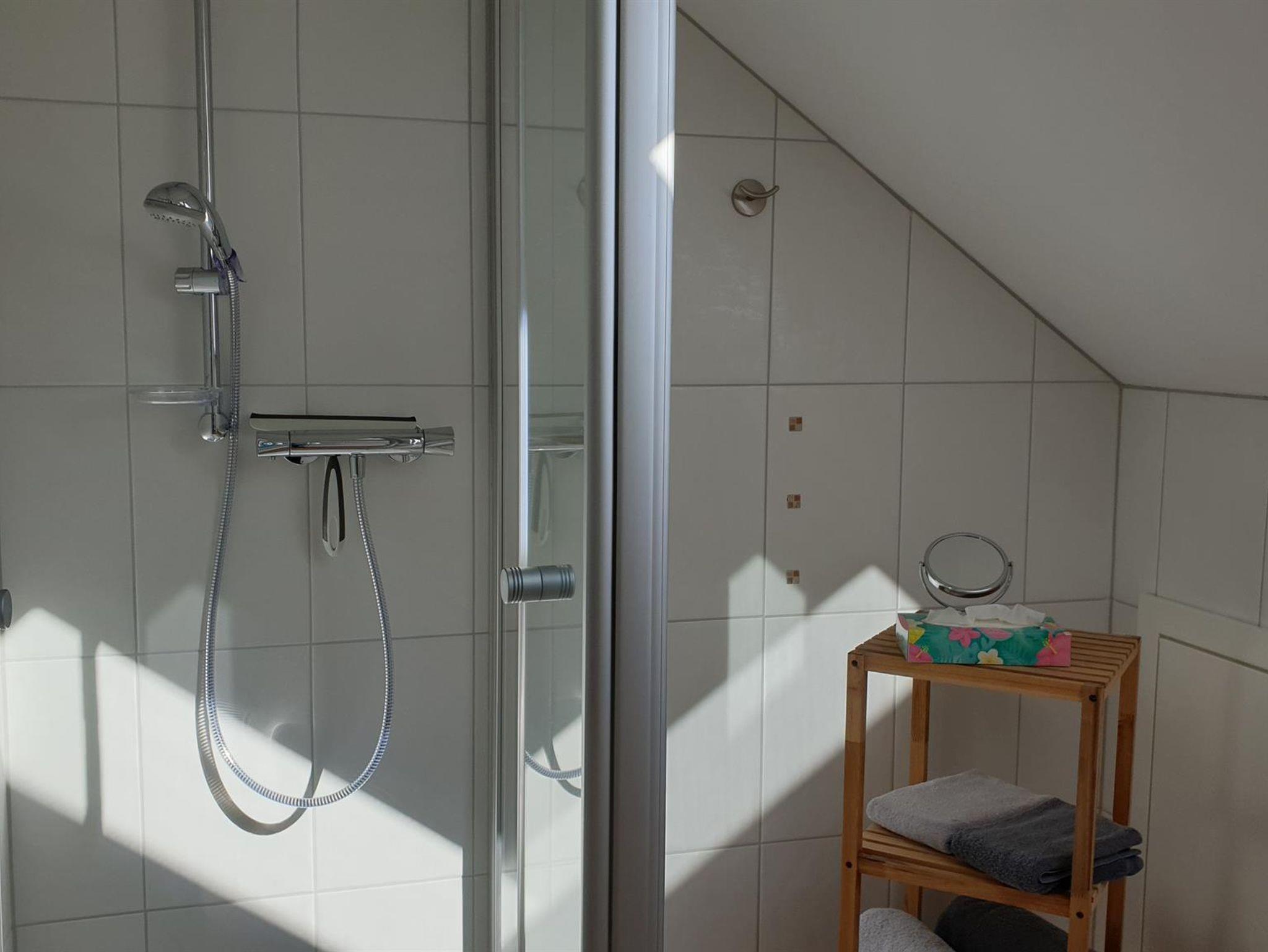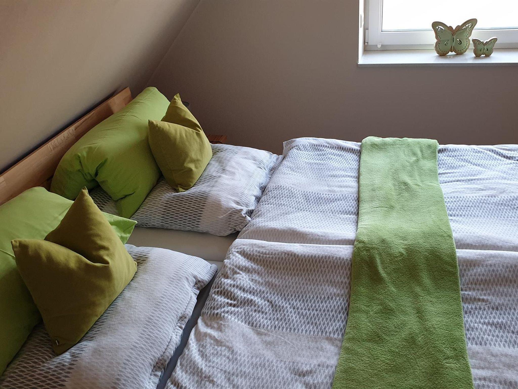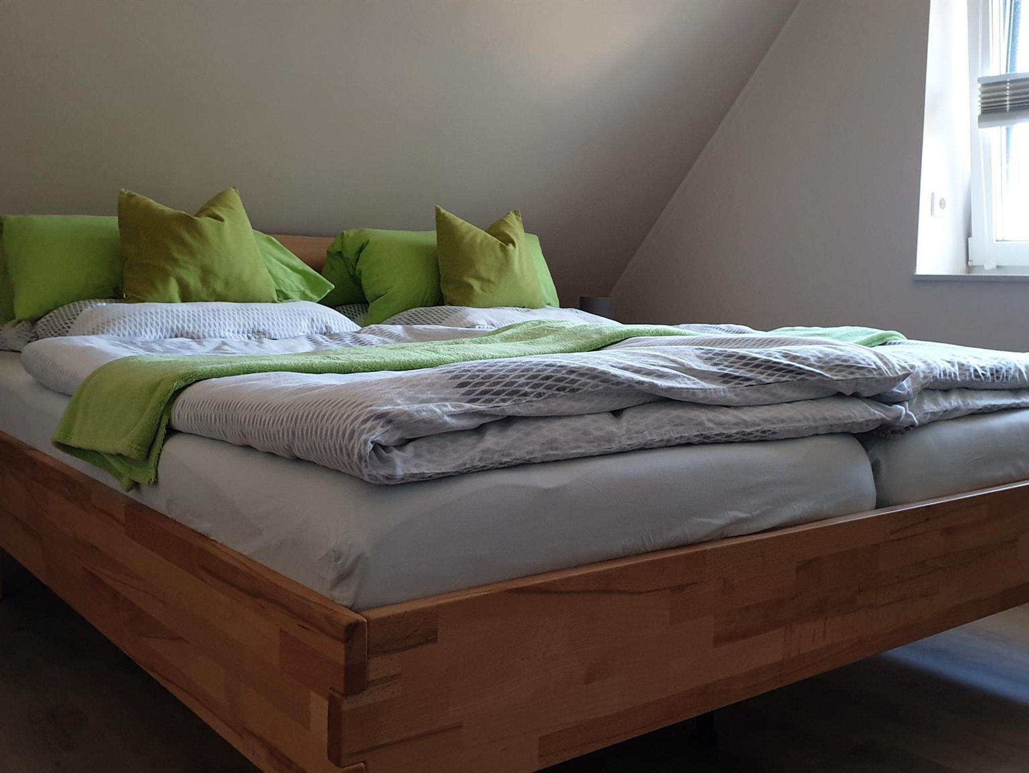 Großzügig, hell und freundlich - das beschreibt diese Wohnungen für 4 Personen am besten. Ideal für die Familie oder für zwei Paare, da jedes Schlafzimmer ein eigenes Badezimmer hat. Appartement im Obergeschoss, ca. 72 m², gemütlich und hell eingerichtet mit 4 Sternen ausgezeichnet. Wohnzimmer mit gemütlichen Sitzmöbeln, TV, CD-Player, WLAN-Internet. Schlafzimmer mit Doppelbett (180x200), zweites Schlafzimmer im Dachgeschoss mit zwei Einzelbetten (90x200). Jedes Schlafzimmer mit eigenem Duschbad / WC, ausgestattet mit Föhn. Einbauküche mit Ceranfeld, Backofen, Geschirrspüler, Mikrowelle, Kaffeemaschine und Toaster. Balkon mit Möbeln. PKW-Stellplatz vor dem Haus, Nichtraucher, keine Haustiere. Die Erstausstattung von Bettwäsche und Handtücher ist inclusive. Es gibt die Möglichkeit im Haus Wäsche zu waschen. Nach Absprache und gegen Gebühr!