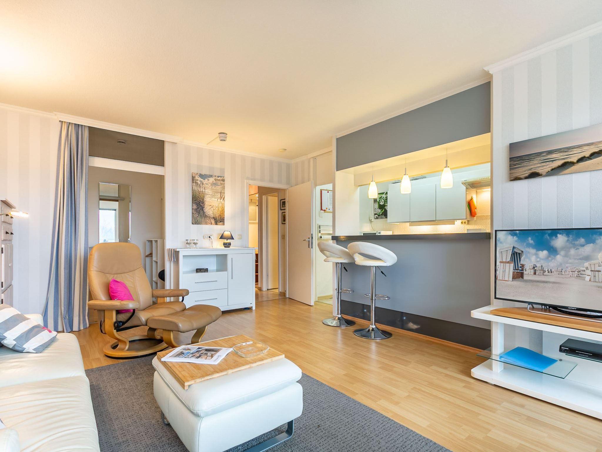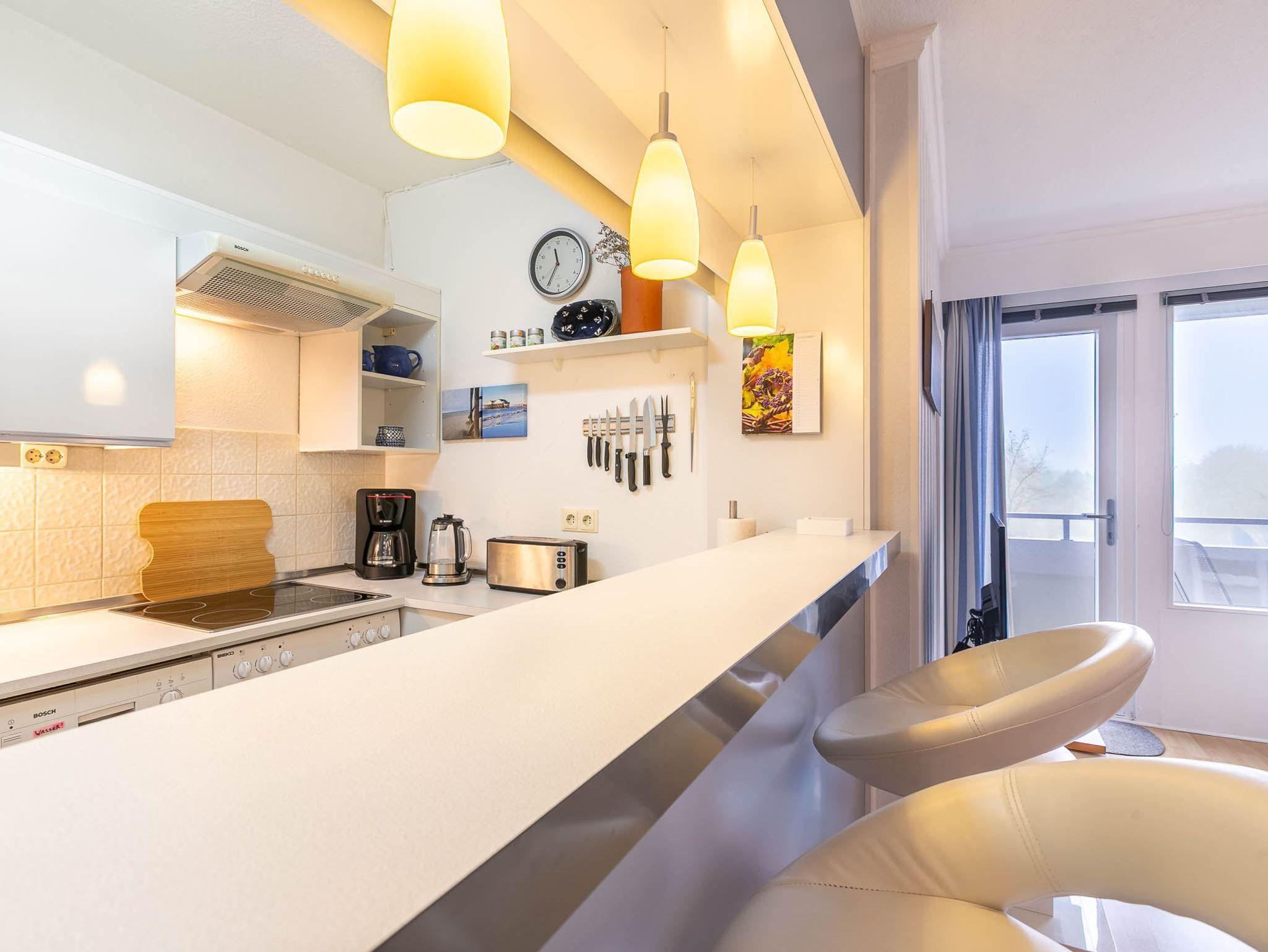 Wohnzimmer mit gemütlichem Sofa, einem sehr bequemen Ruhesessel, TV (Sat) mit DVD-Player und ausklappbarem Esstisch für 2-3 Personen. Direkter Zugang zum breiten, möblierten Balkon nach Westen mit Blick auf den Tennisplatz und Dünengürtel. Halboffene Küche mit Backofen, Mikrowelle, Geschirrspüler und Kühlschrank mit Gefrierfach. Die Küche ist durch einen praktischen Tresen mit zwei Hochstühlen vom Wohnzimmer abgeteilt.