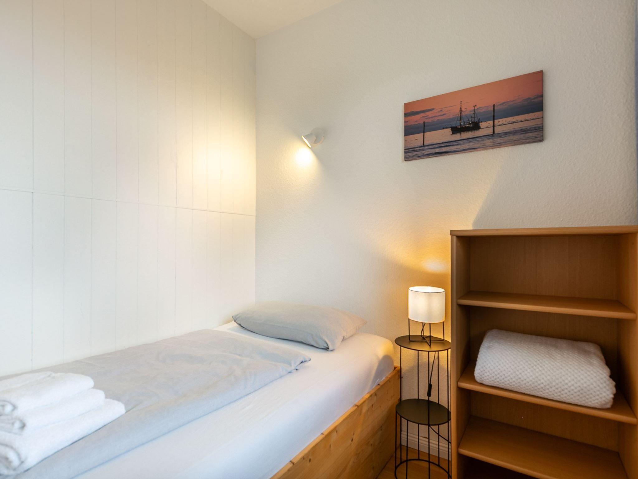 2. Schlafzimmer mit Einzelbett (100x200cm), Regalschrank und Blick auf den Tennisplatz.