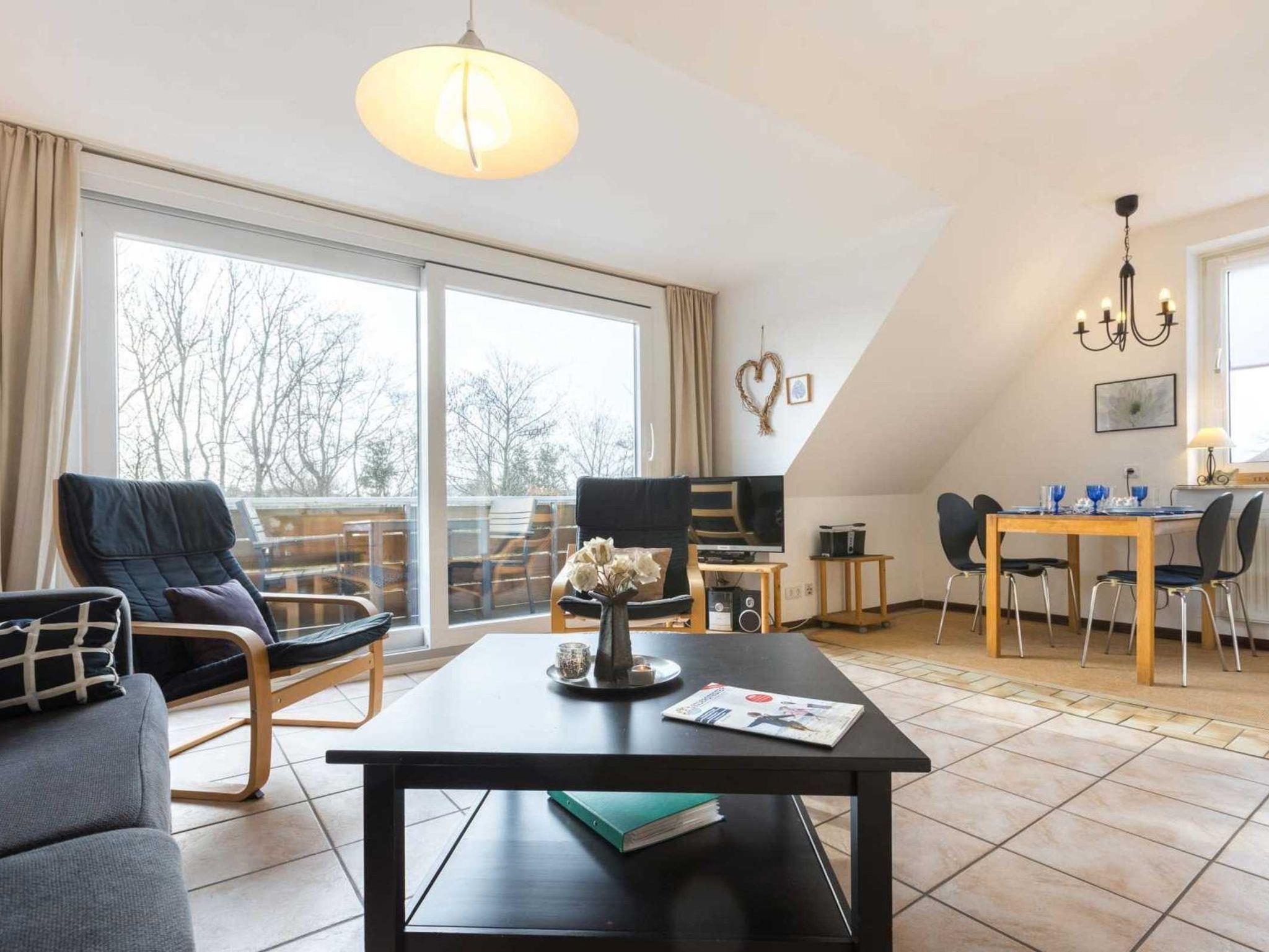 Wohnzimmer mit Sofa, 2 Sesseln, TV (Sat) mit BluRay-Player, Stereo-Kompaktanlage, Büchern und Esstisch für 4 Personen. Offene Küche mit Geschirrspüler, Tischbackofen und Kühlschrank mit Gefrierfach. Direkter Zugang zum möblierten Balkon nach Süden mit Blick in den grünen Garten.