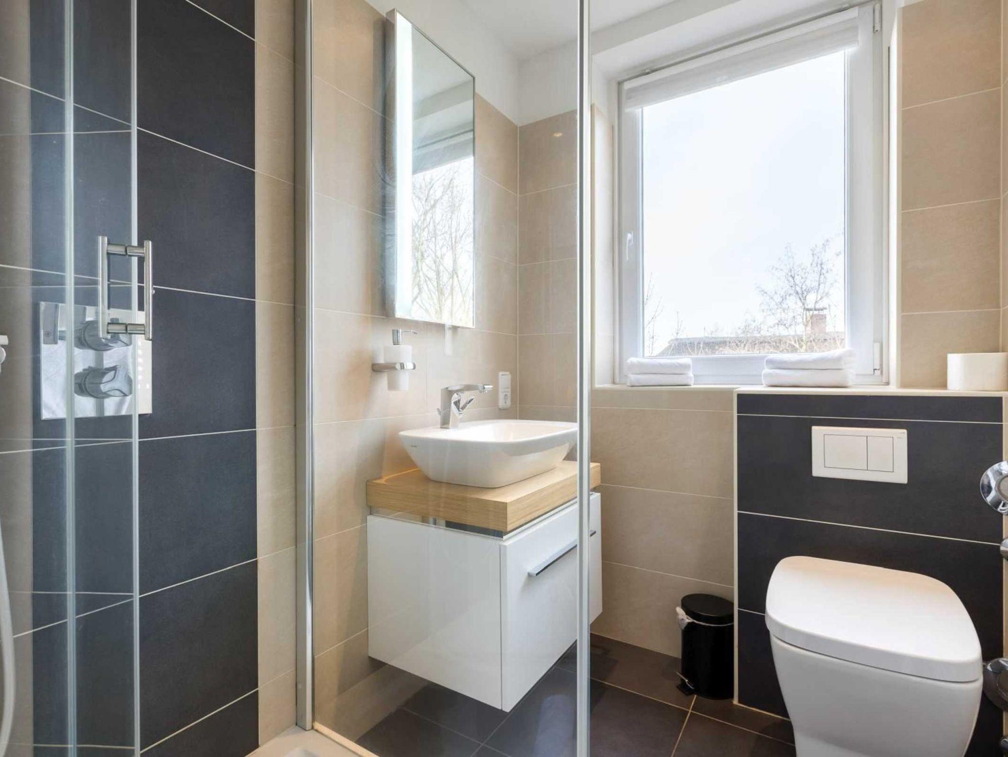 Modernes Badezimmer (Duschbad) mit Dusche, WC, Tageslicht und Föhn.