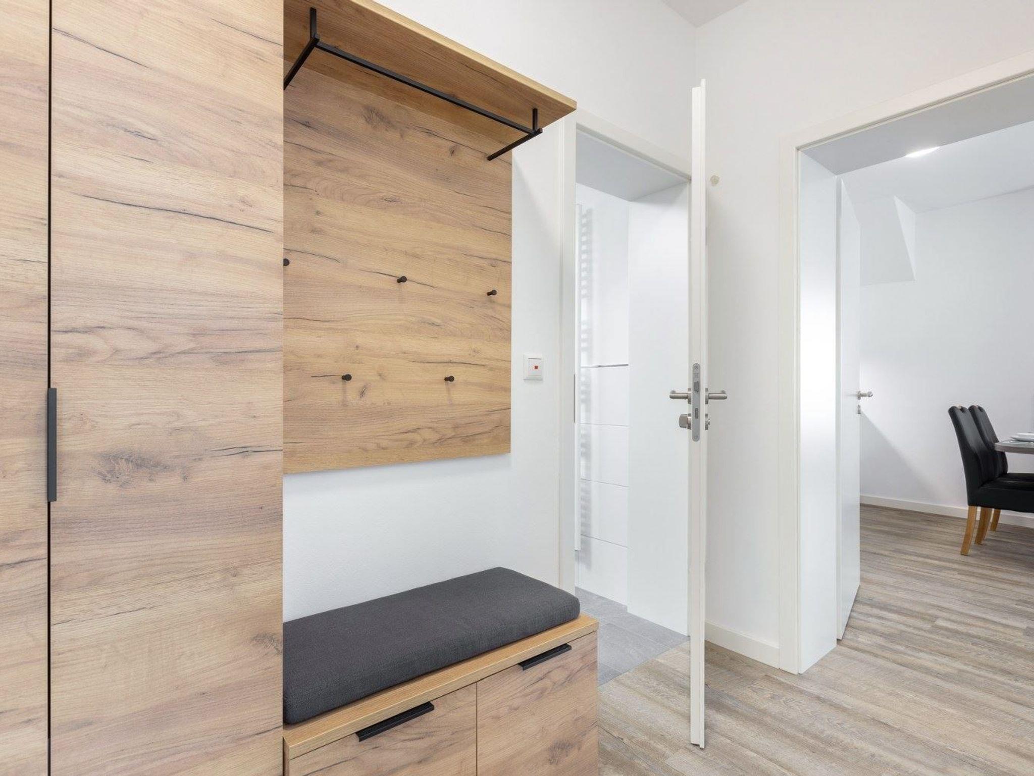 Flur mit Garderobe, Schuhbank und Haushaltsschrank im Eingangsbereich.