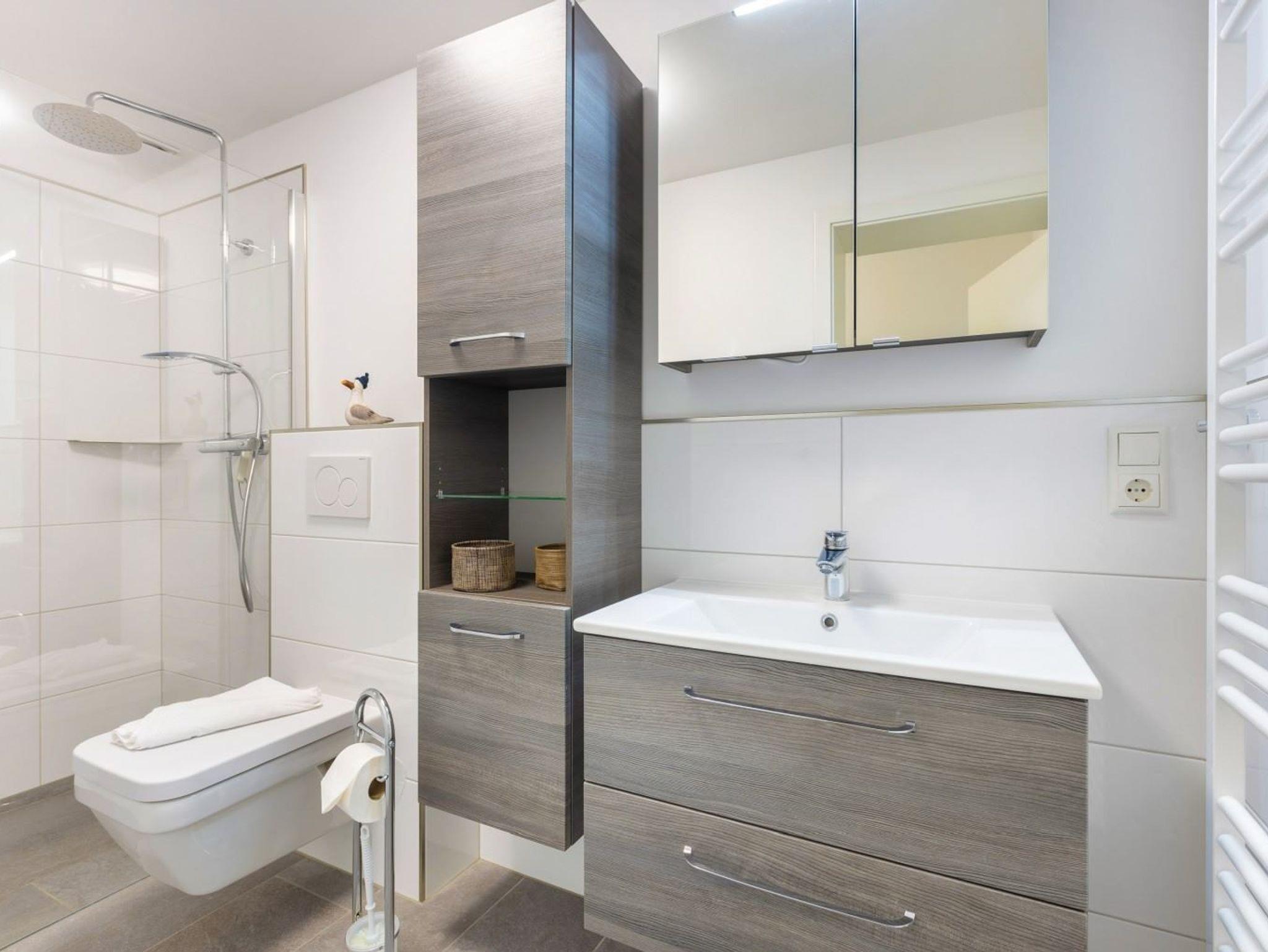 Badezimmer (Duschbad) mit ebenerdiger Regen-Dusche, WC, Handtuchwärmer und Föhn.