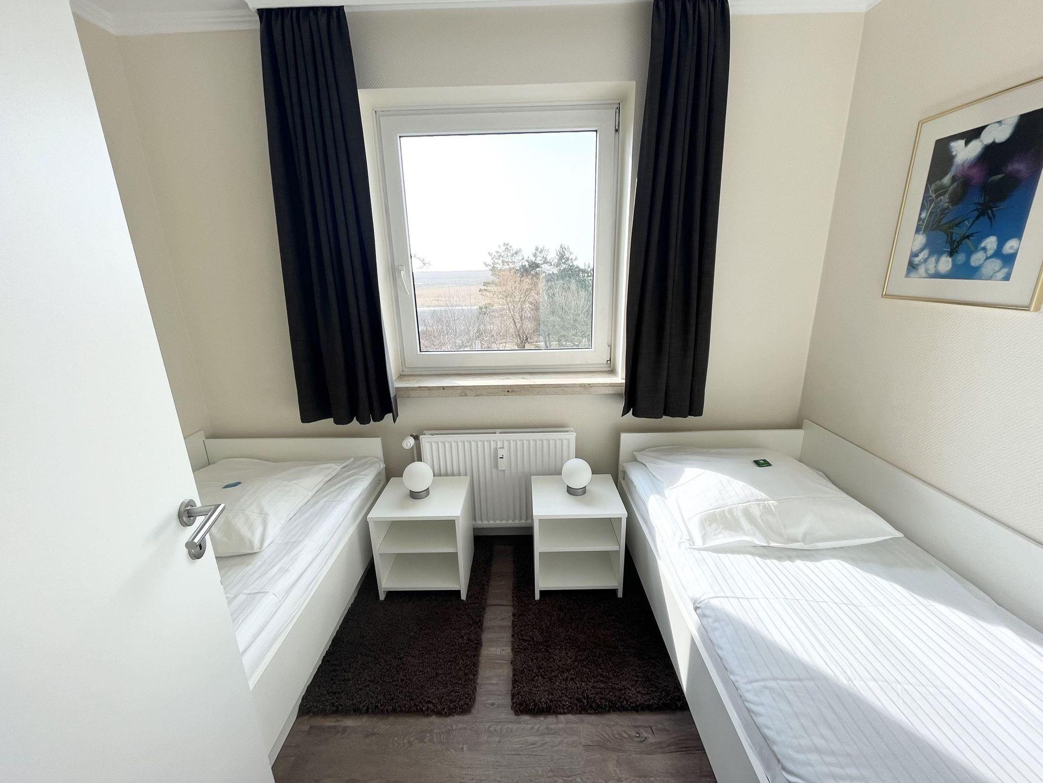 Schlafraum mit 2 Einzelbetten (je Bett 190 x 90), Wohnraum, Laminat-Fußboden, Essecke, Küchenzeile mit Mikrowelle, Dusche/WC, Kabel-TV, Durchwahltelefon, Balkon, PKW-Platz-Nr. 48, Aufzug und Fahrradkeller.