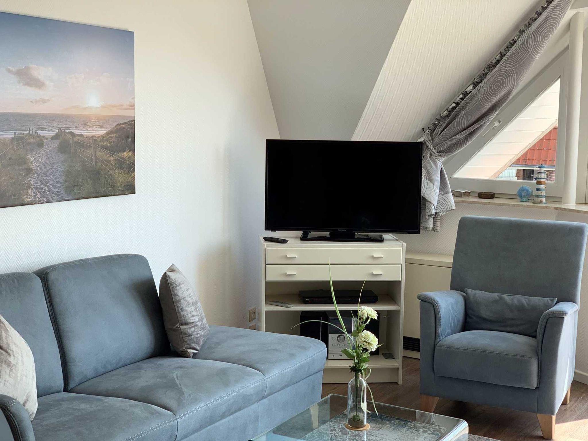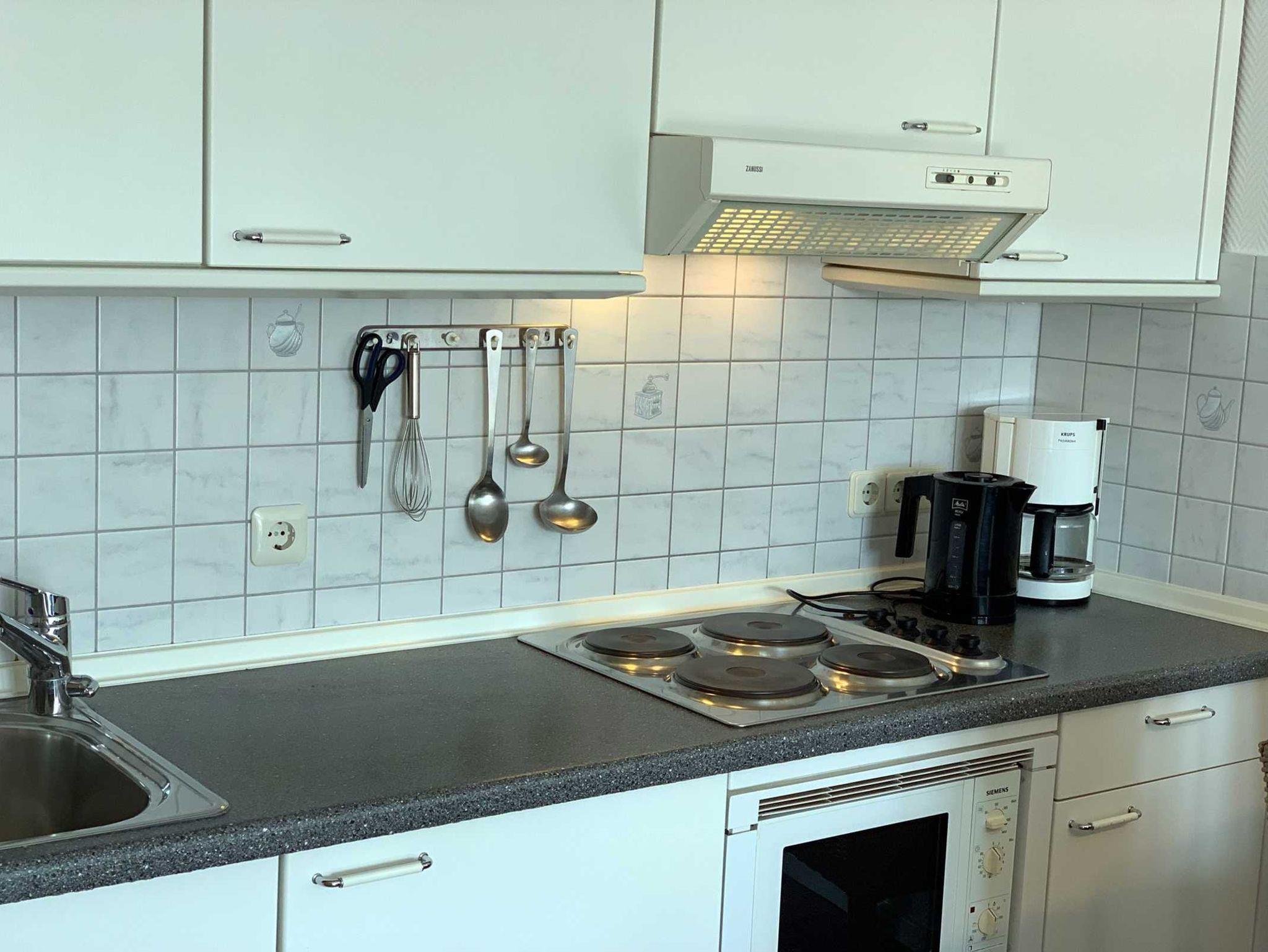 Genießen Sie Ihren Aufenthalt in unserer 2-Zimmer-Ferienwohnung im 4. Obergeschoss mit leichtem Meerblick. Diese helle und freundlich gestaltete Unterkunft bietet einen einladenden Wohnbereich, der nahtlos in die offene Küche übergeht. Die Küche ist mit einem modernen 4-Plattenherd und einer Spülmaschine ausgestattet, um Ihren Aufenthalt so angenehm wie möglich zu gestalten.