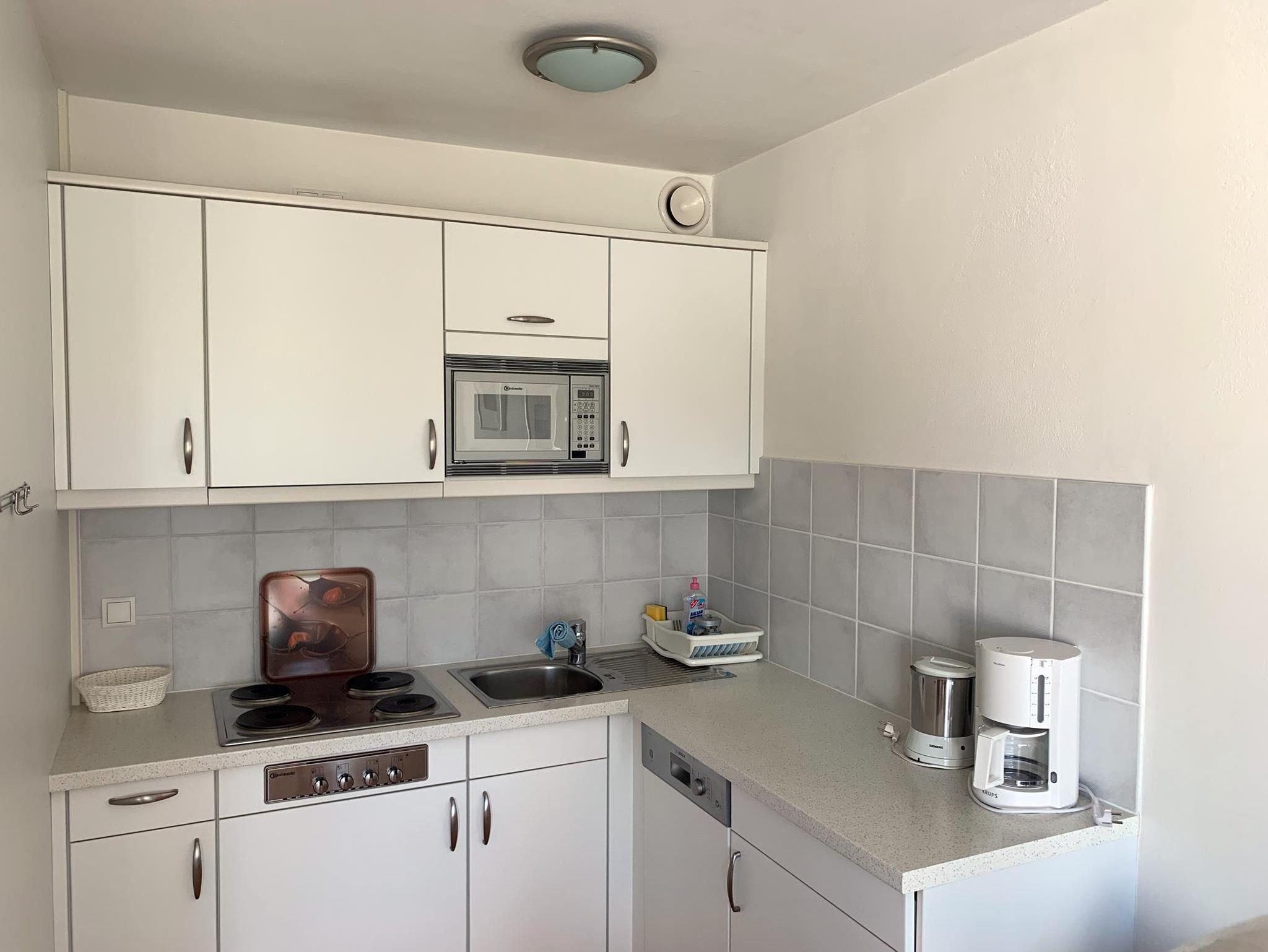 • komplett eingerichtete Küche, Mikrowelle, Geschirrspüler, Kühlschrank mit Gefrierfach, Wasserkocher, Kaffeemaschine (Filter), Toaster.