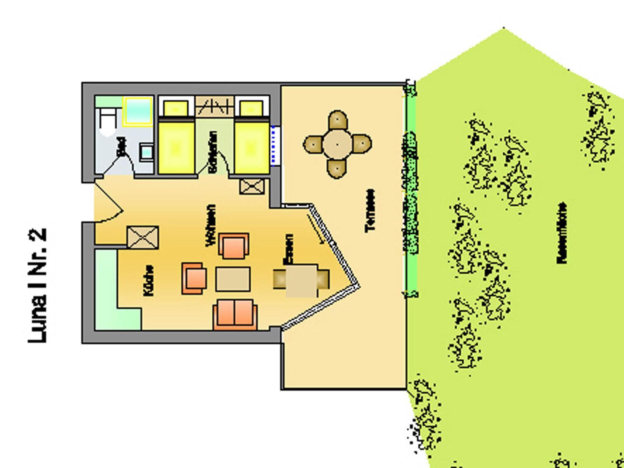 Eingangsbereich mit Garderobe, offene Küche zum Wohnraum mit Essbereich in einem vorgelagerten Wintergarten, direkter Zugang zur Terrasse und Garten, Schlafzimmer mit 2 Einzelbetten (90x200cm), 1 Duschbad mit WC und Waschbecken. Parkplatz und Fahrradständer.