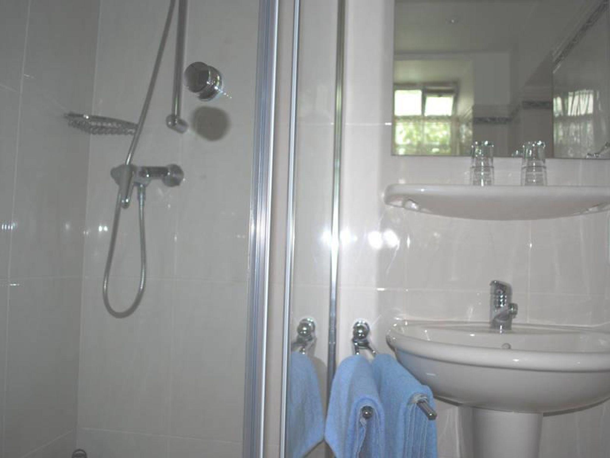 Das Bad ist mit Duschkabine, Wandschrank und Föhn ausgestattet.