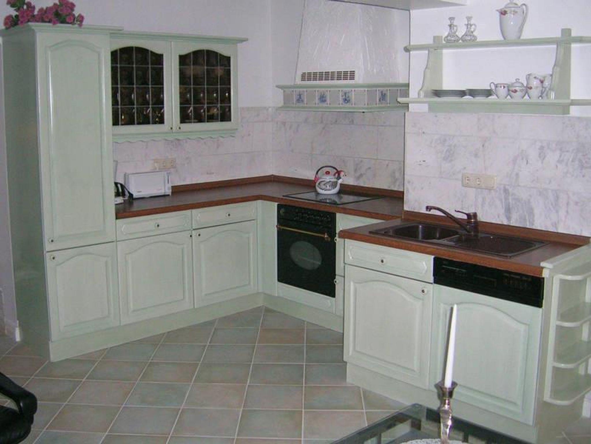 sowie integrierter Landhausküche mit Ceranfeldherd, Backofen, Spülmaschine, Kühlschrank und lindgrün lasierter Eichenholzfront.