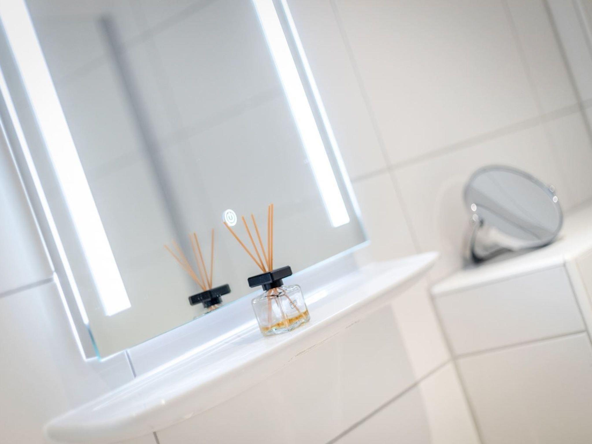 Badezimmer (Duschbad) mit Dusche, WC, Handtuchwärmer und Föhn.