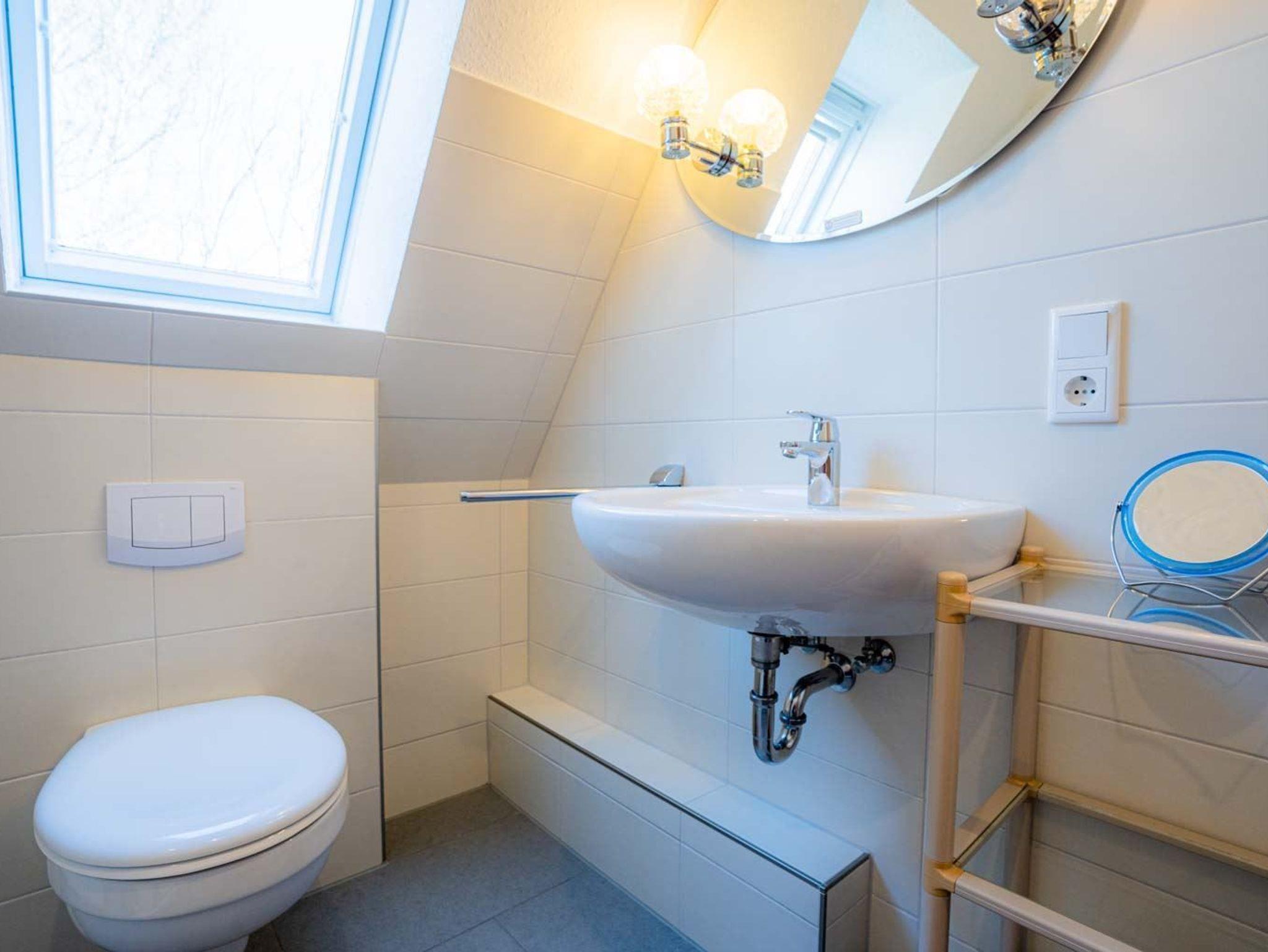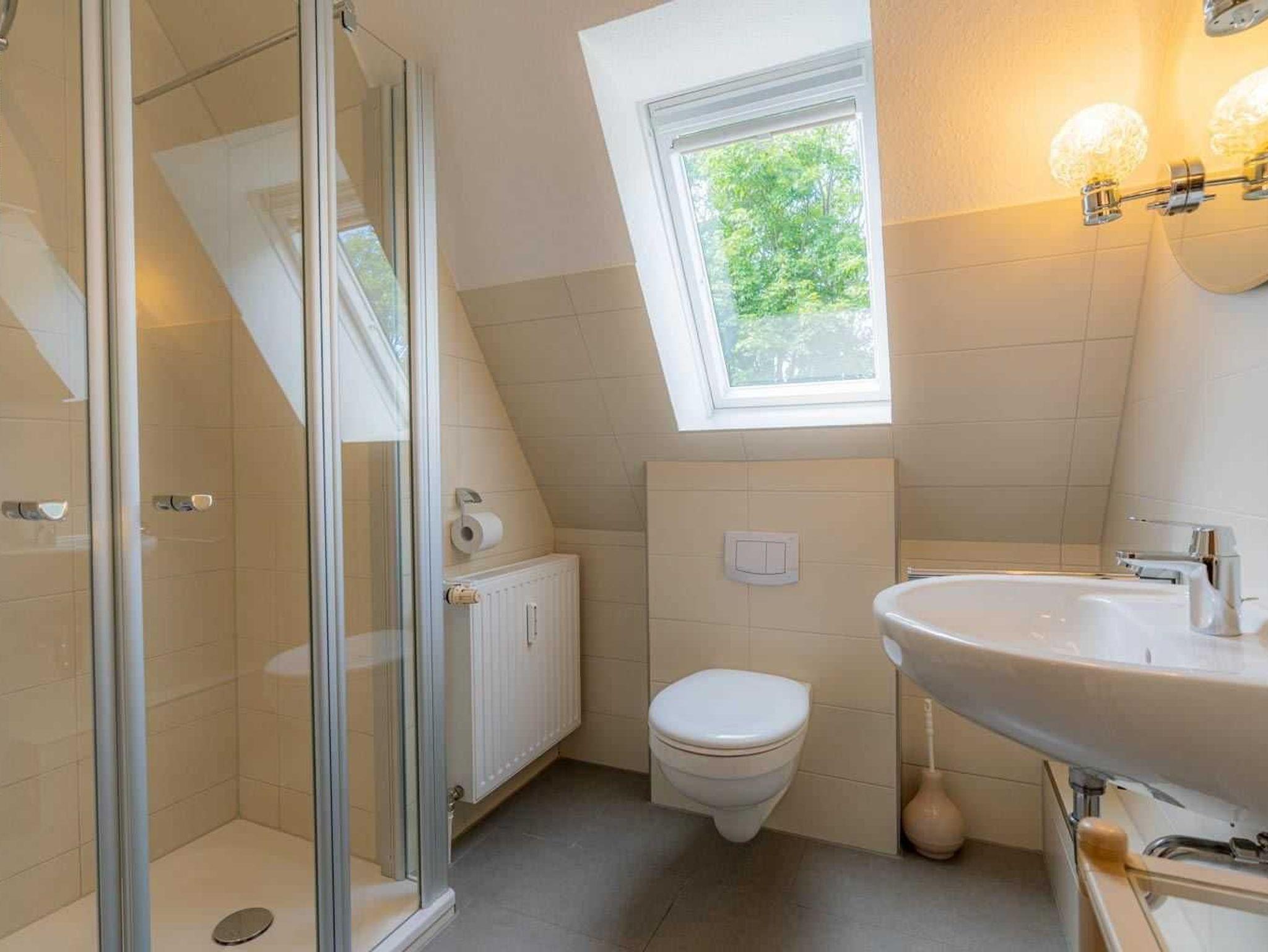 Modernisiertes Badezimmer (Duschbad) mit Dusche (Eintritt: ca. 5 cm), WC, Tageslicht und Föhn.