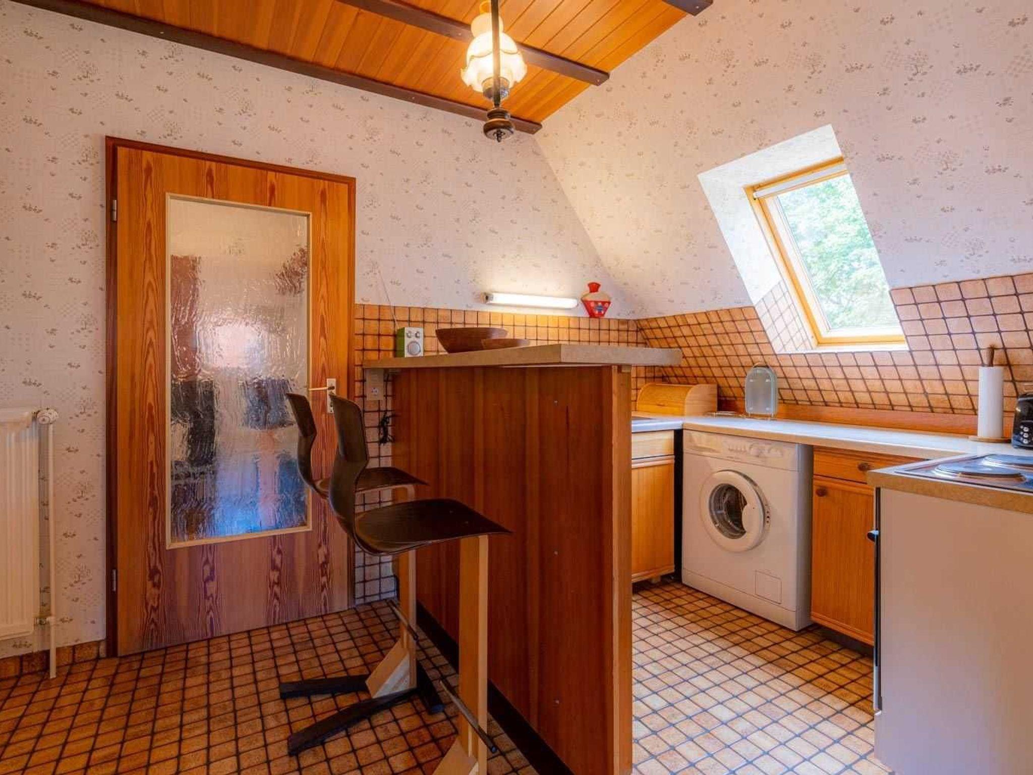 Halboffene Küche mit Backofen, Mikrowelle, Geschirrspüler, Kühlschrank mit Gefrierfach, Radio und Waschmaschine.