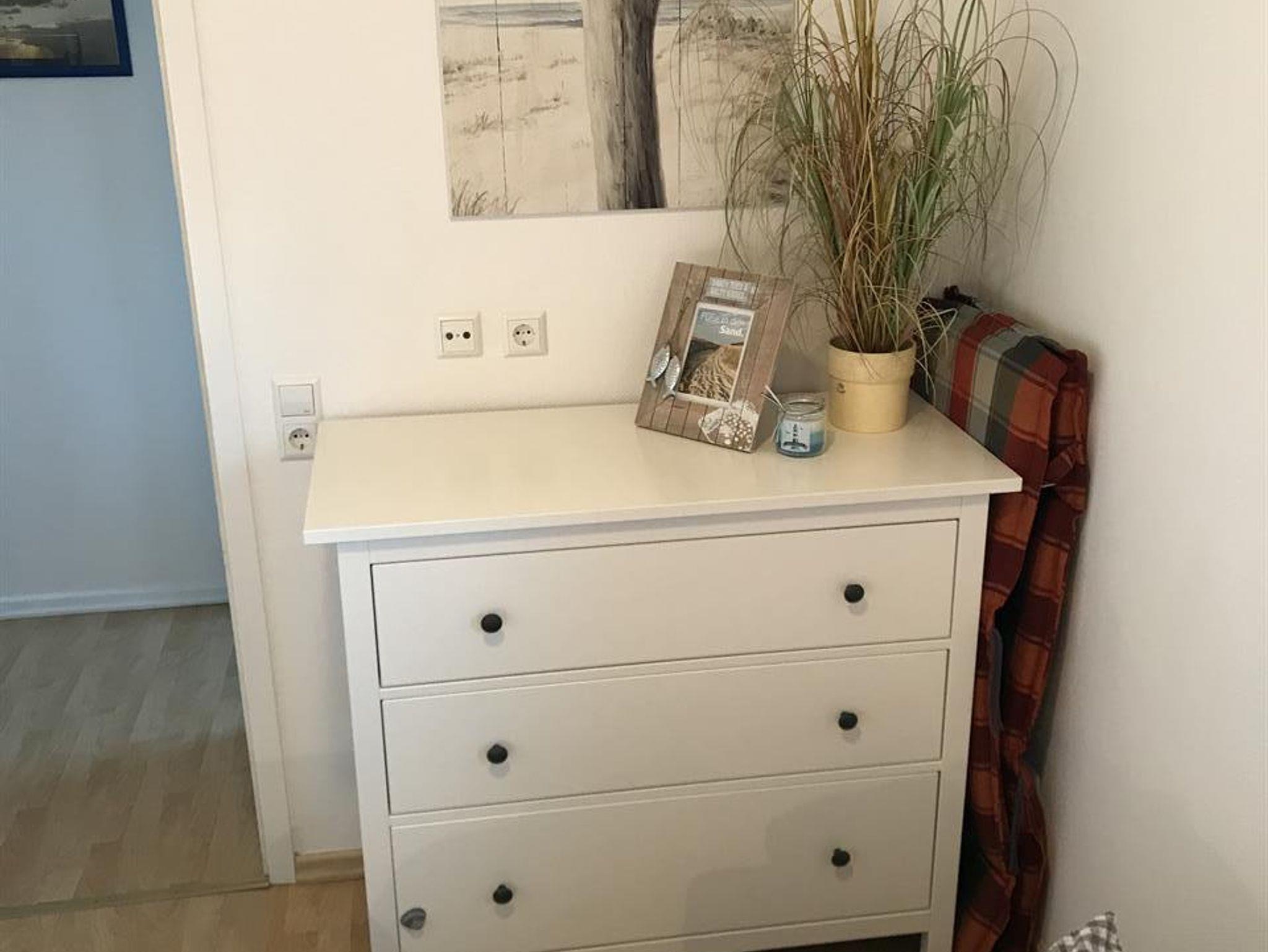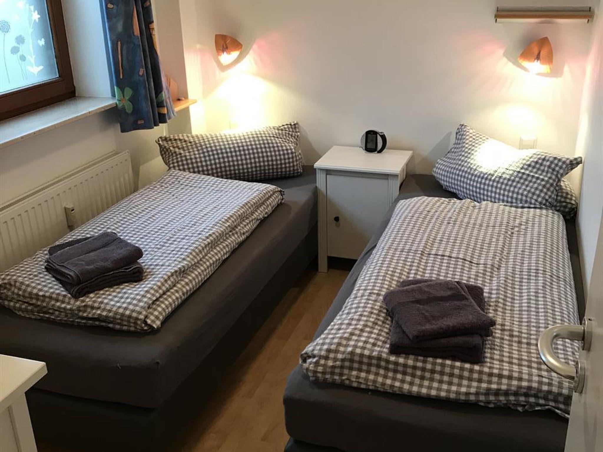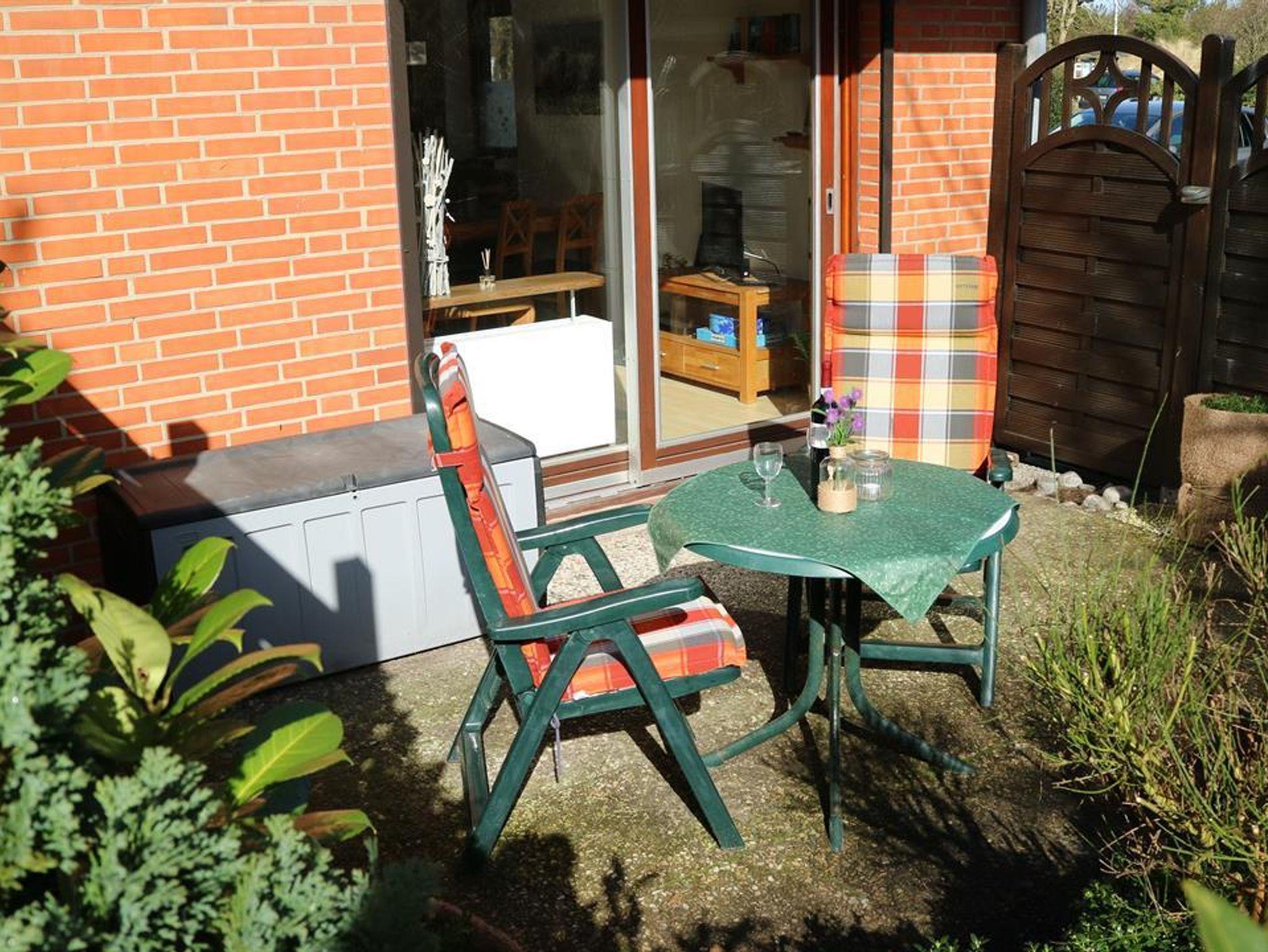 Wir bieten Ihnen eine sehr ansprechende, geschmackvoll eingerichtete Ferienwohnung im Erdgeschoss der kleinen Wohnanlage an. Die Wohnung hat ein Wohn-/Esszimmer mit einer Einbauküchenzeile (4-Platten-Herd, Geschirrspülmaschine und eine Mikrowelle / Backofenkombination (für die Sonntagsbrötchen)), ein Schlafzimmer mit zwei Einzelbetten (die problemlos zusammen geschoben werden können) und einem ebenerdigen Duschbad mit WC (März 2018 renoviert) und Fön. Vom Wohnzimmer gelangen Sie auf eine schöne, windgeschützte Terrasse. Zur Ausstattung gehören SAT-TV, Stereo Anlage und Gartenmöbel, außerdem können Sie gegen Gebühr die Gemeinschaftswaschmaschine und den Trockner nutzen. Abschliessbarer Fahrradabstellraum auf dem Grundstück, Pkw-Stellplatz direkt am Haus.