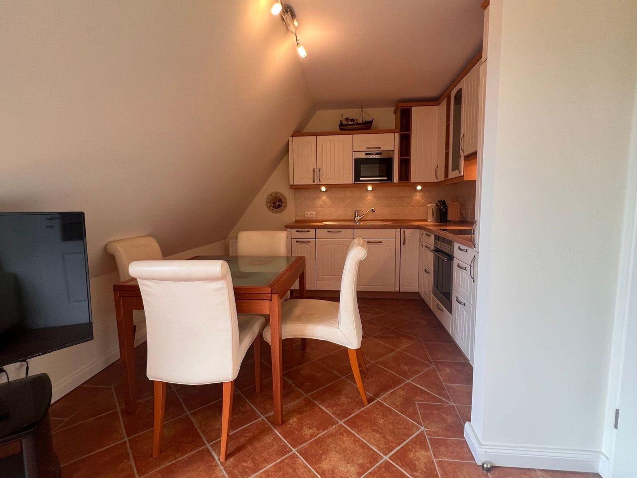 Die Landhausküche grenzt direkt am Wohnzimmer an. Das Duschbad bietet genügend Platz für Ihre Utensilien. Das Schlafzimmer mit einem 180er Doppelbett sorgt für ruhevolle Erholung. Ein weiteres Schlafzimmer befindet sich im Dachgeschoss.