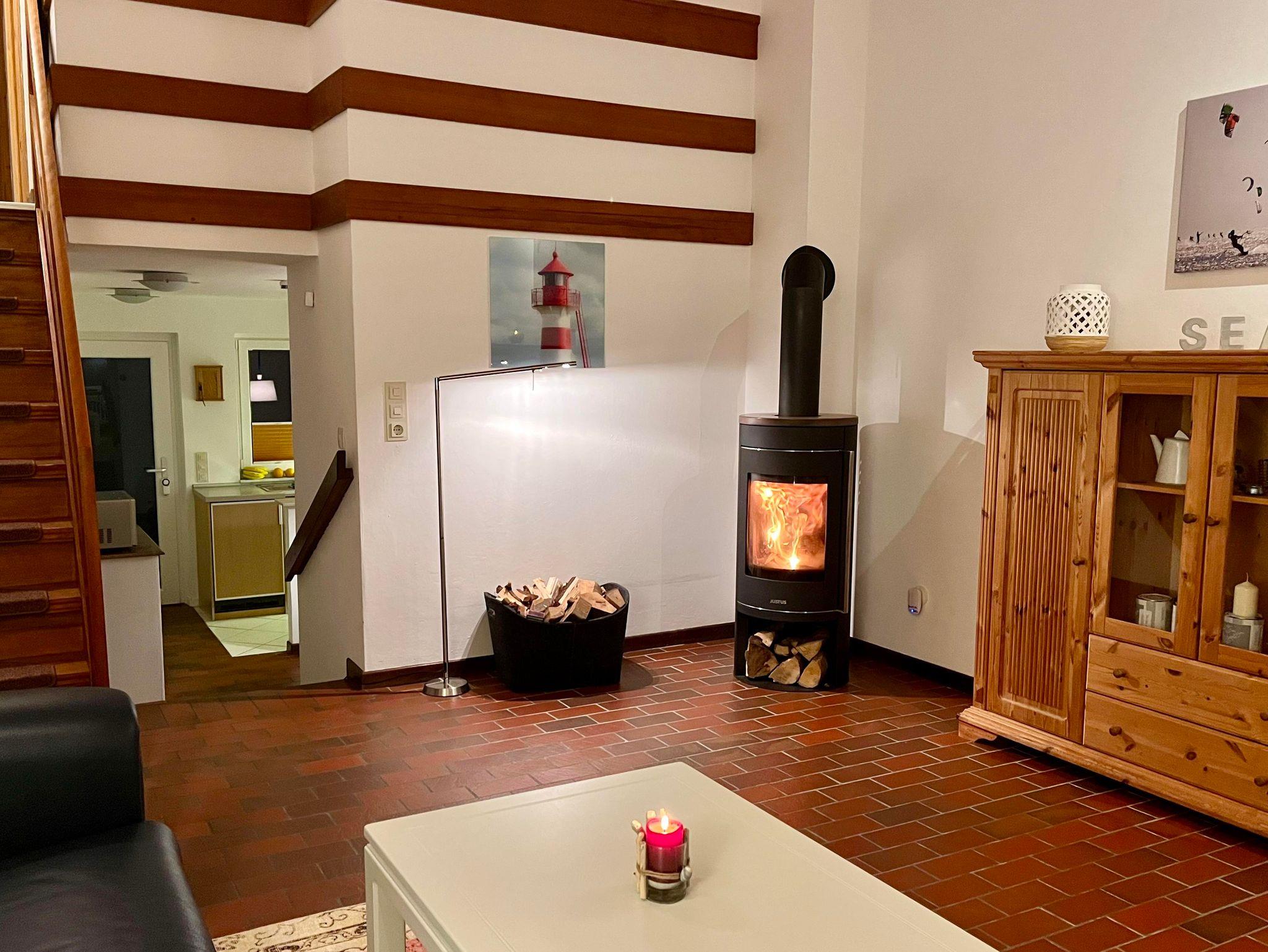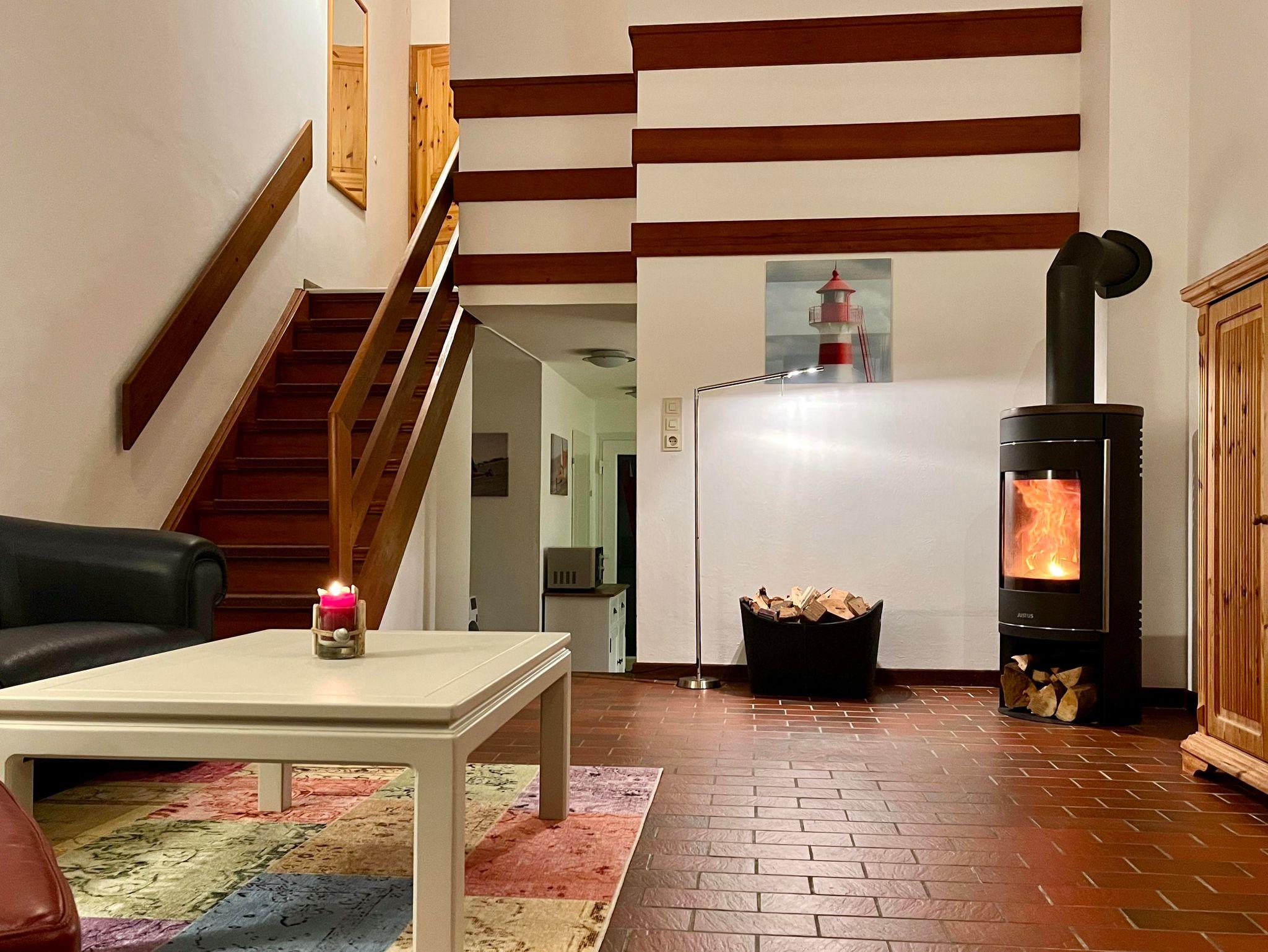 Gemütliches Reihenhaus in St. Peter-Ording mit Kamin, Terrasse und E-Auto-Ladestation für erholsamen Urlaub.