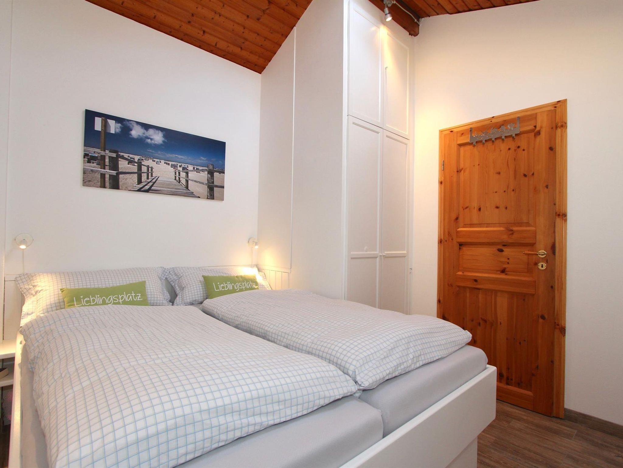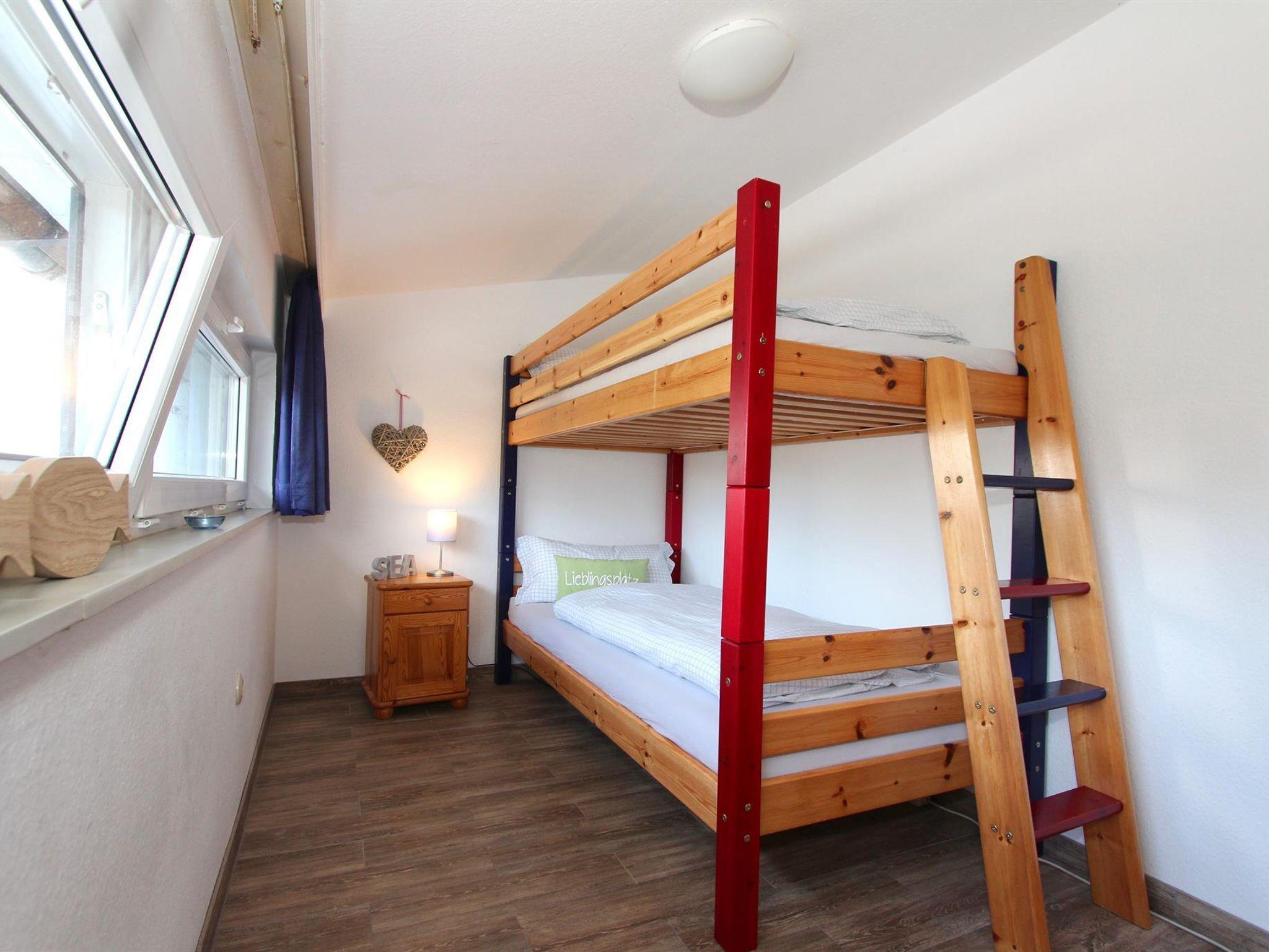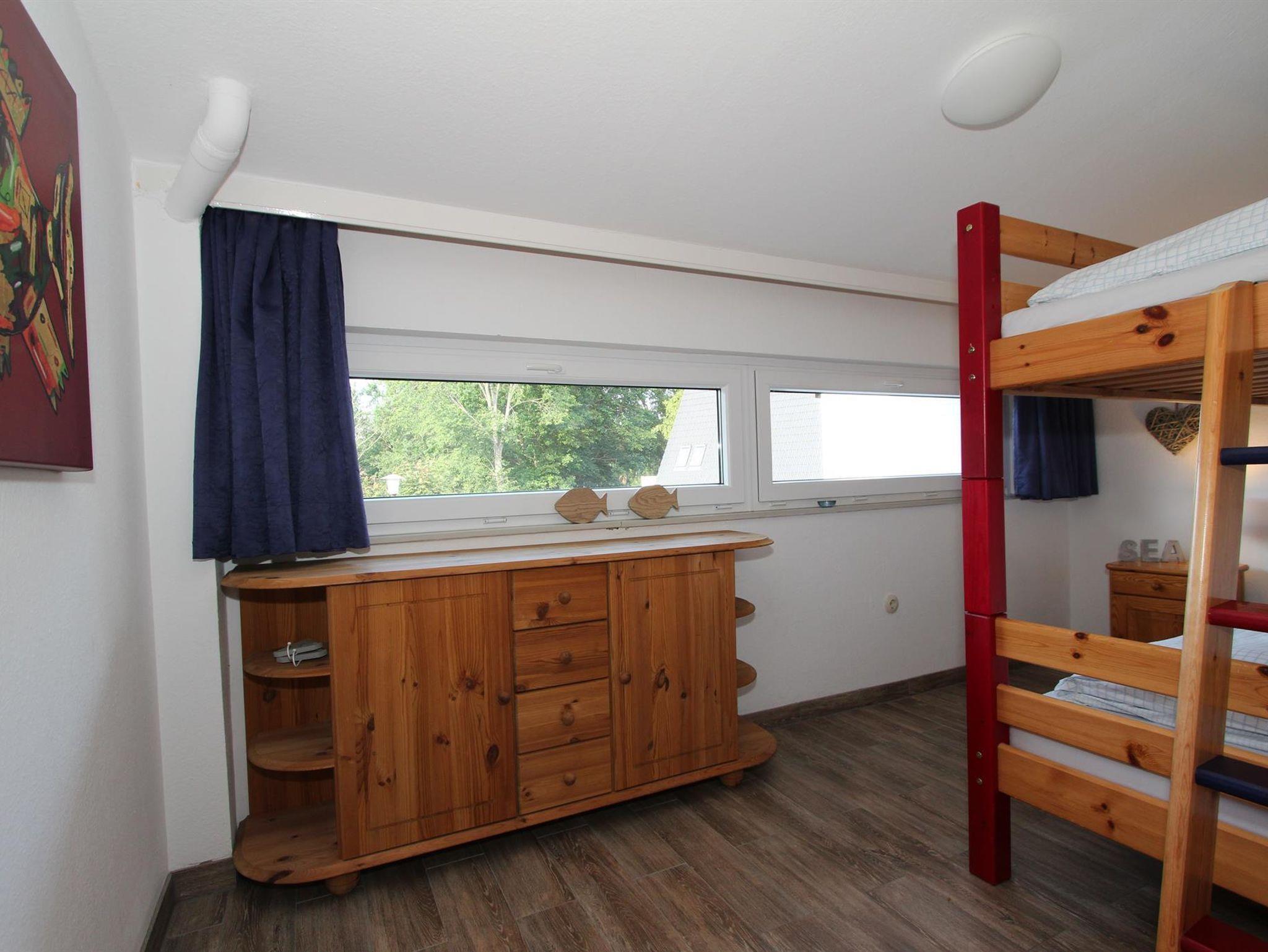 Vom Wohnzimmer gelangen Sie über eine Treppe zur oberen Ebene mit 2 getrennten Schlafzimmern. Ein Schlafzimmer ist mit einem Doppelbett und Kleiderschrank ausgestattet. Im zweiten Schlafzimmer befindet sich ein Etagenbett, welches auch gut für Erwachsene geeignet ist.