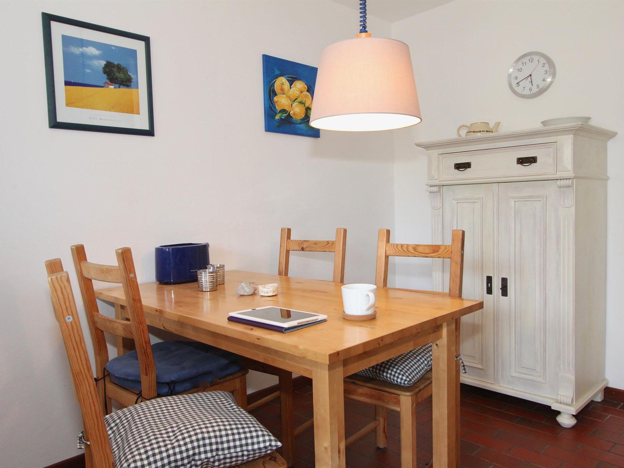 Das Wohnzimmer ist mit einem Sofa, Sessel, Couchtisch, Flachbildfernseher, Radio und einem Kamin ausgestattet. Die offene Küche verfügt über einen Kühlschrank mit 4-Sterne-Gefrierfach, einem Backofen, einer Mikrowelle und einem Ceran-Kochfeld. Der Essbereich ist für 4 Personen ausgestattet. Außerdem gehört zur Wohnung ein kleines Bad mit Dusche.