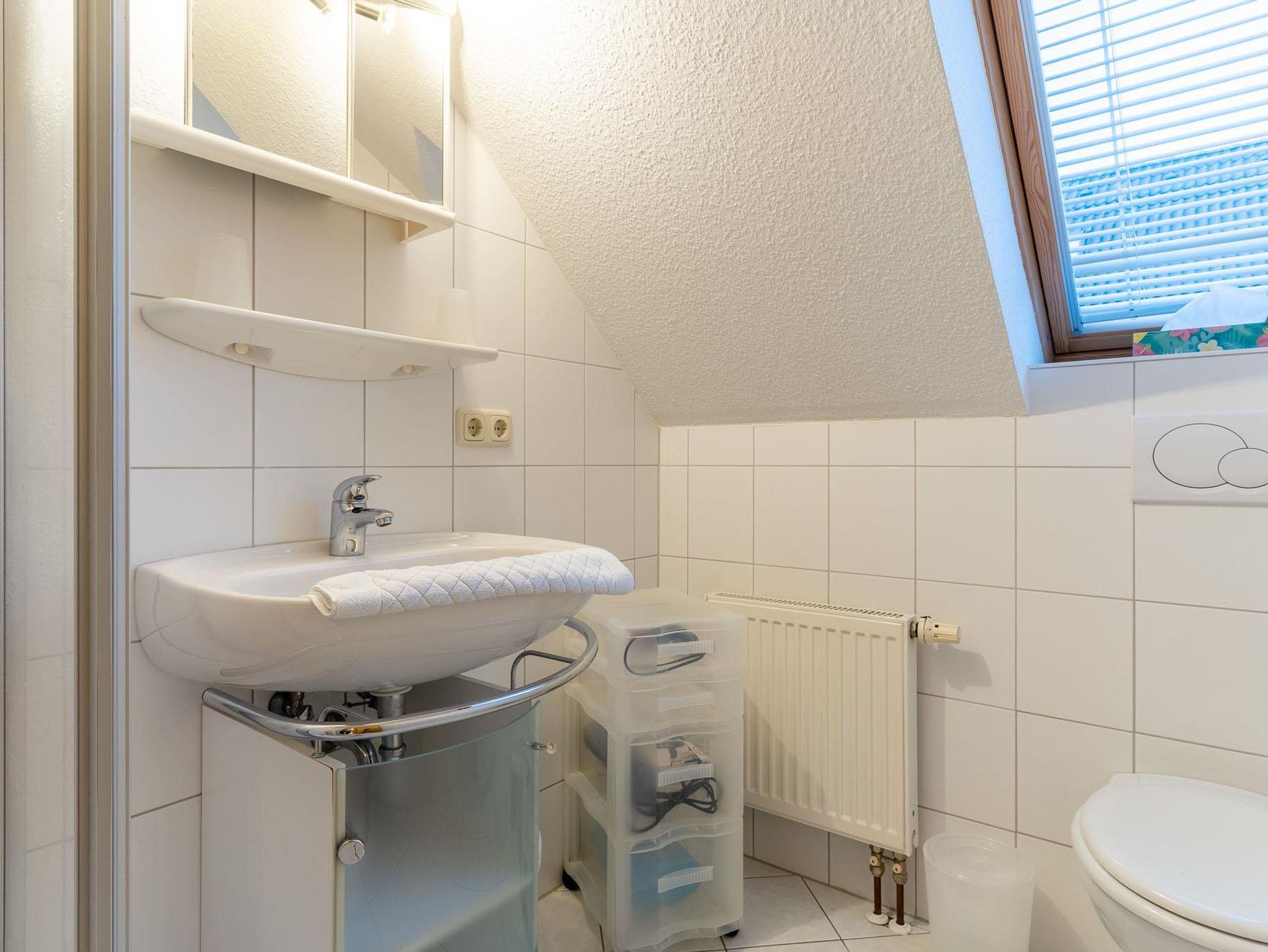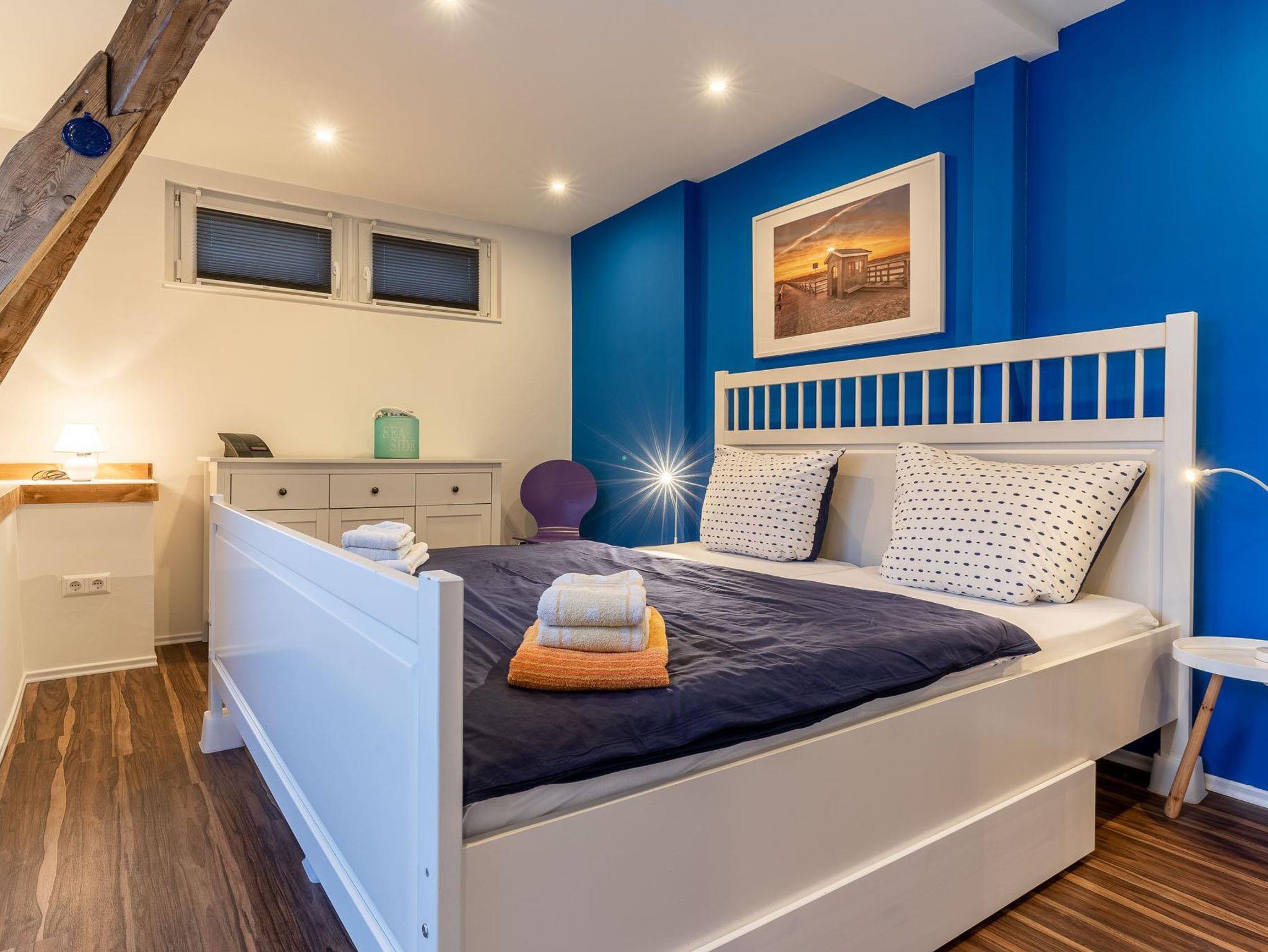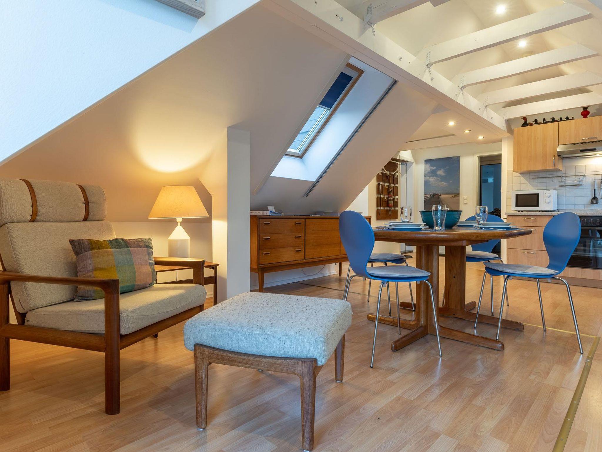 Bis jetzt wurde diese 2-Personen-Ferienwohnung nur privat genutzt. Man erreicht sie über eine fünfzehnstufige Treppe. Diese Wohnung auf der Ostseite des OG hat einen hellen und sehr großzügigen Hauptwohnbereich mit Küche und einem Balkon auf der Ostseite, sowie ein kleines Schlafzimmer und ein kleines Bad. Die offizielle Größe beträgt 45 qm, aber der Hauptwohnbereich wirkt groß, auch durch die bis unter den Dachfirst gezogene Decke. Der Balkon hat eine Fläche von knapp 8 qm. Der Wohnraum und der Essbereich mit der Küche beinhalten eine dreifenstrige Gaube, durch die viel Licht eindringt. Die Helligkeit der Wohnung wird durch den Fußboden (Buchenlaminat) noch weiter betont. Im Wohnraum befinden sich auch ein Flachbildschirm-Fernseher und eine Radioanlage. Die vollständig eingerichtete Küche verfügt neben der üblichen Ausstattung wie Herd und Backofen, Mikrowelle, Kühlschrank, Toaster, Wasserkocher, Eierkocher, Kaffeemaschine auch über einen Geschirrspüler. Das Schafzimmer ist klein mit zwei Einzelbetten (Liegefläche von je 90 X 200 cm). Das Badezimmer, in zurückhaltenden maritimen weißen Kacheln, beinhaltet Dusche, WC, und Waschbecken. Ein eigener PKW-Stellplatz ist direkt vor dem Haus vorhanden, und der Balkon steht zur Ihrer privaten Nutzung bereit. Bettwäsche und Handtücher sind einmalig inklusive. Ein Kinderhochstuhl und ein Kinderbett sind bei Bedarf verfügbar. Die Kosten für die Nutzung des WLAN-Zugangs zum Internet, Strom, Ölheizung und Wasser sind im Mietpreis enthalten. Die Benutzung der Waschmaschine und des Trockners im Hauswirtschaftsraum, der auch von den Gästen der anderen Wohnungen genutzt werden kann, erfolgt über einen Euromünzenautomat. Das Mitbringen von Haustieren und das Rauchen sind in der Wohnung nicht gestattet. Die Mindestmietdauer beträgt 7 Übernachtungen. Bei Buchungen von 5 und 6 Übernachtungen wird ein Kurzbucherzuschlag i.H.v. einmalig 9,50 € pro Person erhoben.