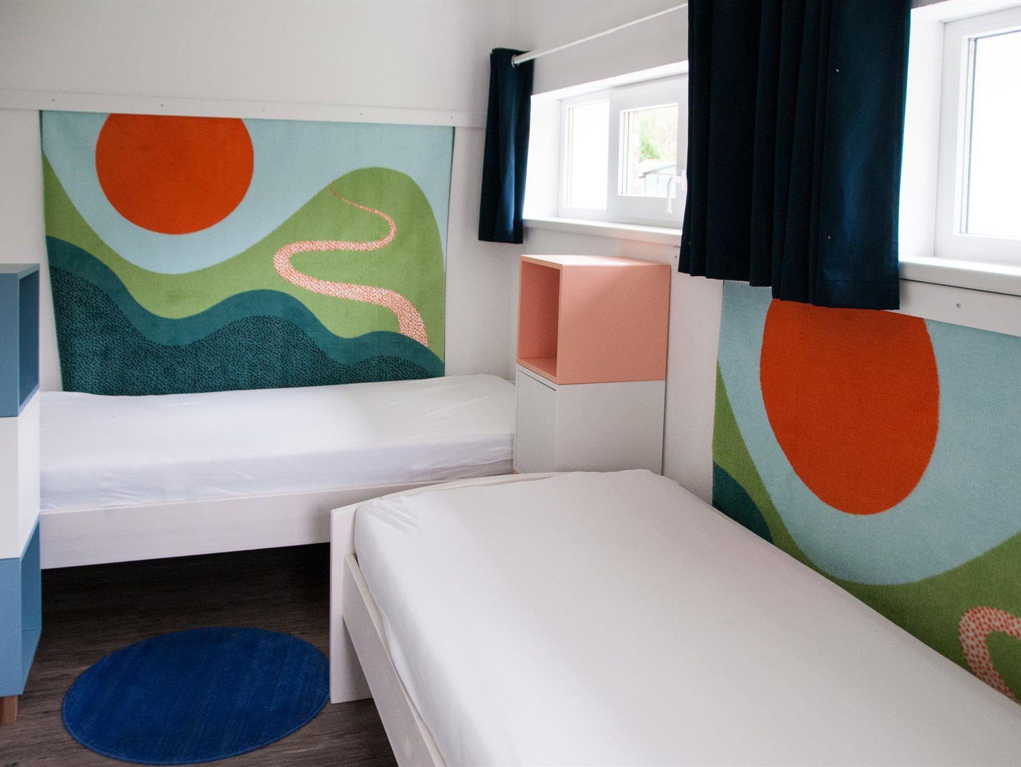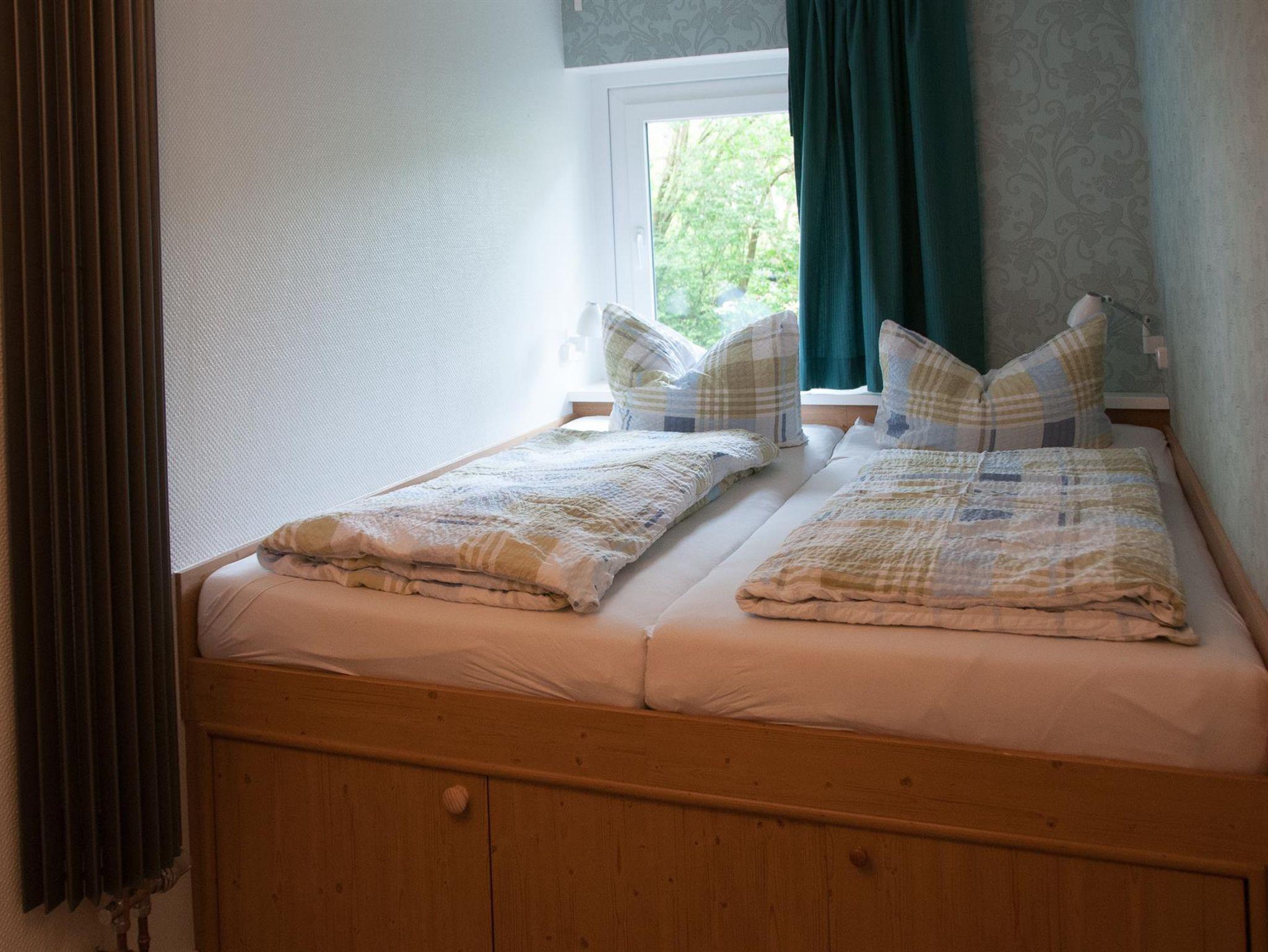 Ein Schlafraum mit erhöhtem Doppelbett (60cm hoch) mit 2 Einzelmatratzen 90 x 200 cm und Dank des fehlenden Fußteils finden auch Großgewachsene viel Fußfreiheit.