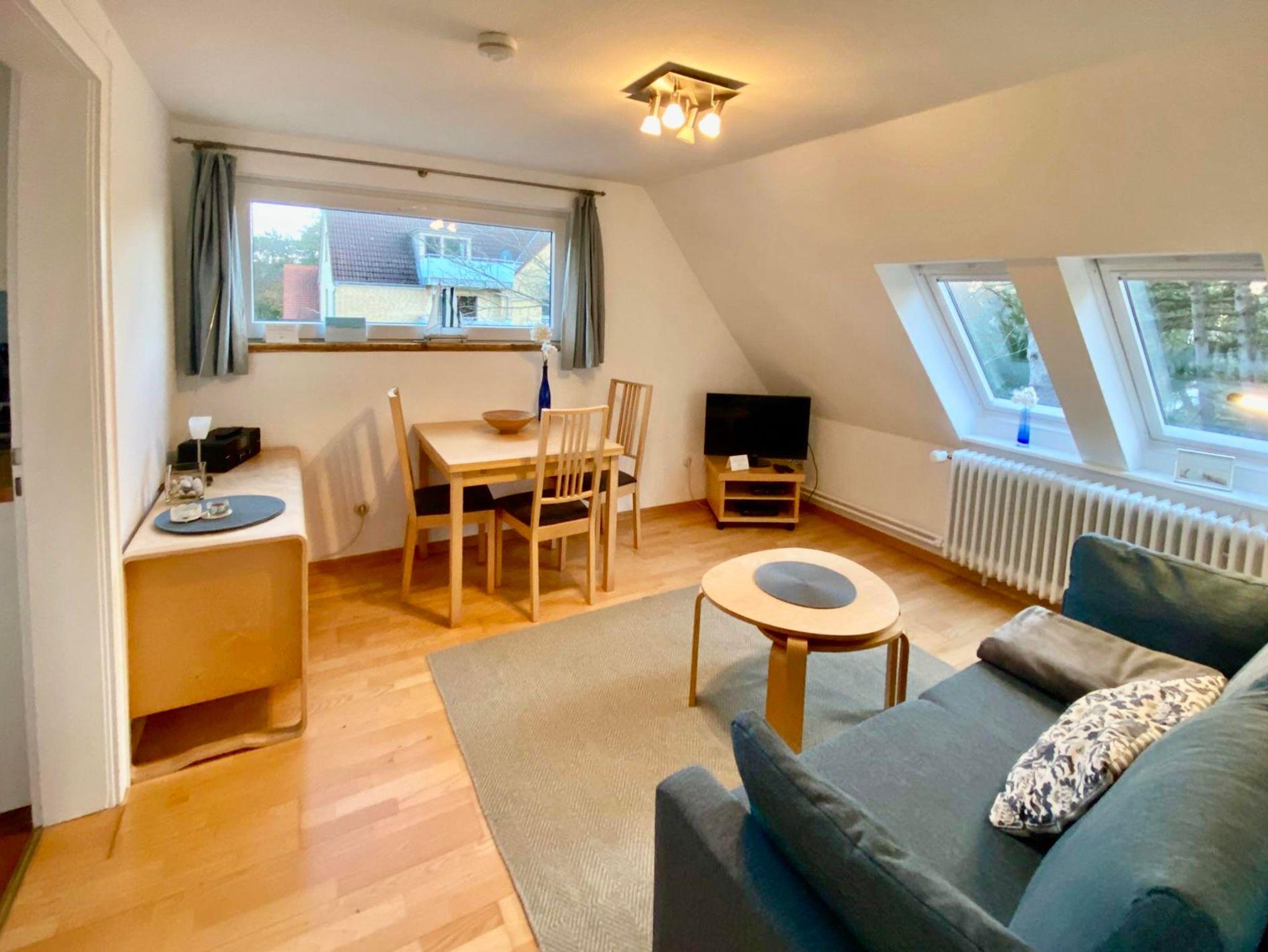 Im ersten Obergeschoss sind zwei Apartments. Das Apartment 1 ist ca. 38 m² groß. Es besteht aus einem Wohn-Esszimmer, einem Schlafzimmer, Küche und Bad. Zu diesem Apartment gehört ein großer Terassenbalkon zur sonnigen Süd-Westseite. Das Apartment ist komfortabel ausgestattet: Einbauküche mit Spülmaschine, Kochfeld und Mikrowelle; Duschbad, Föhn und Kosmetikspiegel; im Wohnzimmer Schlafcouch, Kabel-TV, WLAN Internet-zugang, Radio mit CD-Player; Balkonmöbel. Kinderbett und Hochstuhl werden auf Wunsch bereit gestellt. Die Wohnung ist sehr gut für zwei Personen geeignet oder auch für zwei Erwachsene mit einem Kind. Eine Belegung mit 4 Personen empfehlen wir nicht.