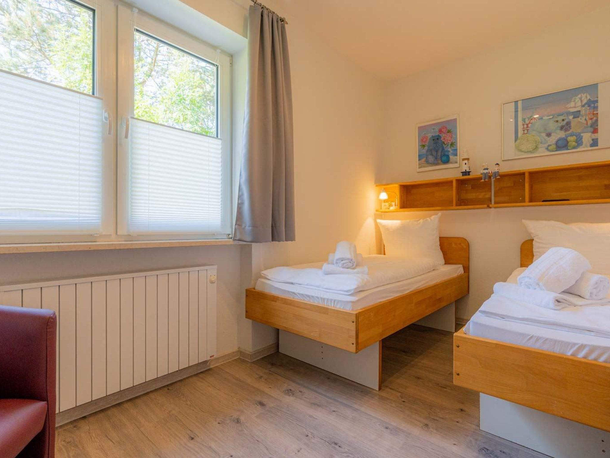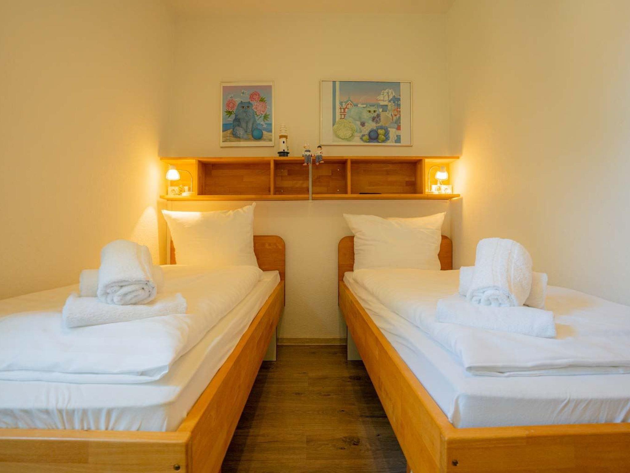 Schlafzimmer mit 2 Einzelbetten (je 90x200cm), kleinem Kleiderschrank und SMART-TV (Kabel).