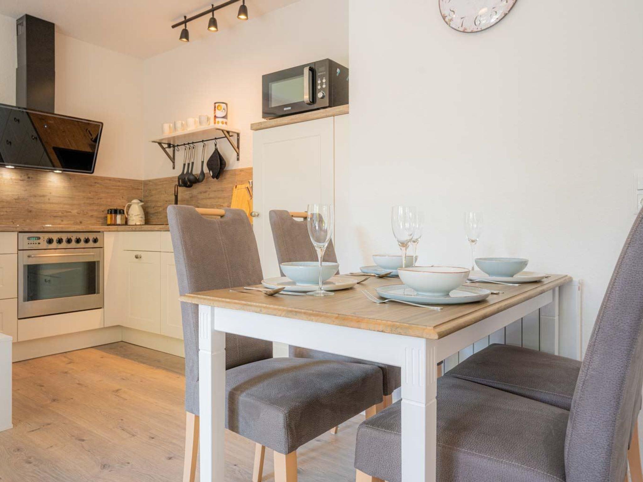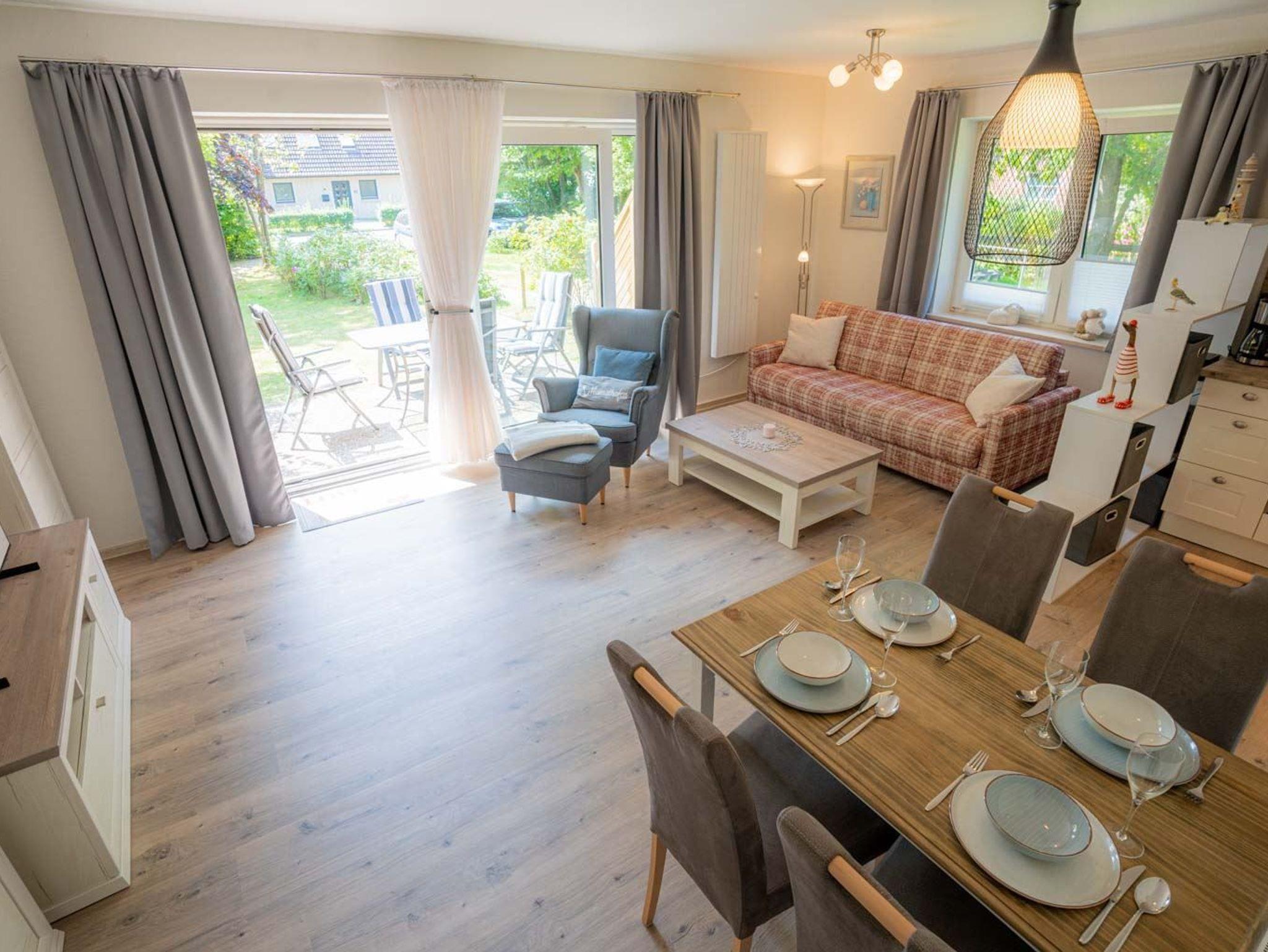 Wohnzimmer mit (ausklappbarem Schlaf-) Sofa (160x200cm), bequemem Ohrensessel mit Fußhocker, SMART-TV (Kabel), Bluetooth-Soundanlage mit CD-Player und Esstisch mit 4 Stühlen. Direkter Zugang zur möblierten Gartenterrasse nach Süden. Halboffene Küche mit Backofen, Mikrowelle, Geschirrspülmaschine und Kühlschrank mit Gefrierfach.