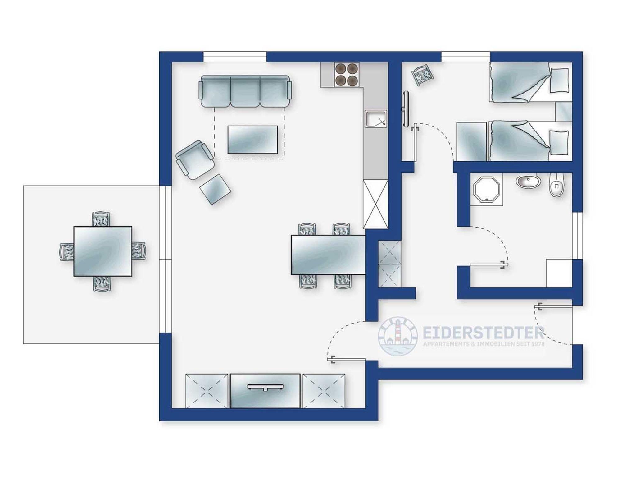 Ruhige 2-Zimmer-Ferienwohnung mit Gartenterrasse in St. Peter-Ording, ideal für erholsamen Nordseeurlaub.
