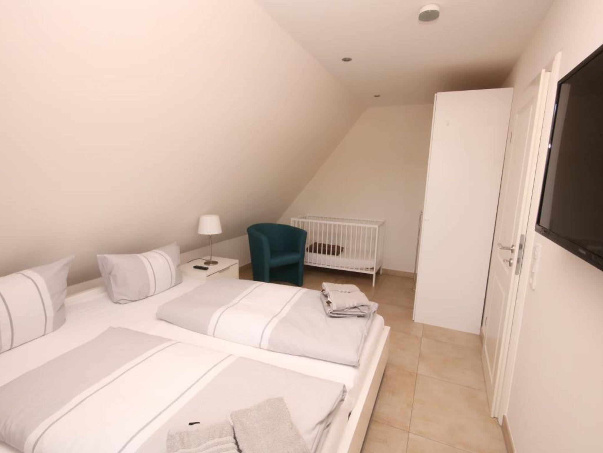 im 1. OG: im Schlafzimmer mit Doppelbett und TV, einem weiteren Schlafzimmer mit zwei Einzelbetten, sowie in dem 3. Schlafraum im Dachgeschoss mit 2 Einzelbetten.