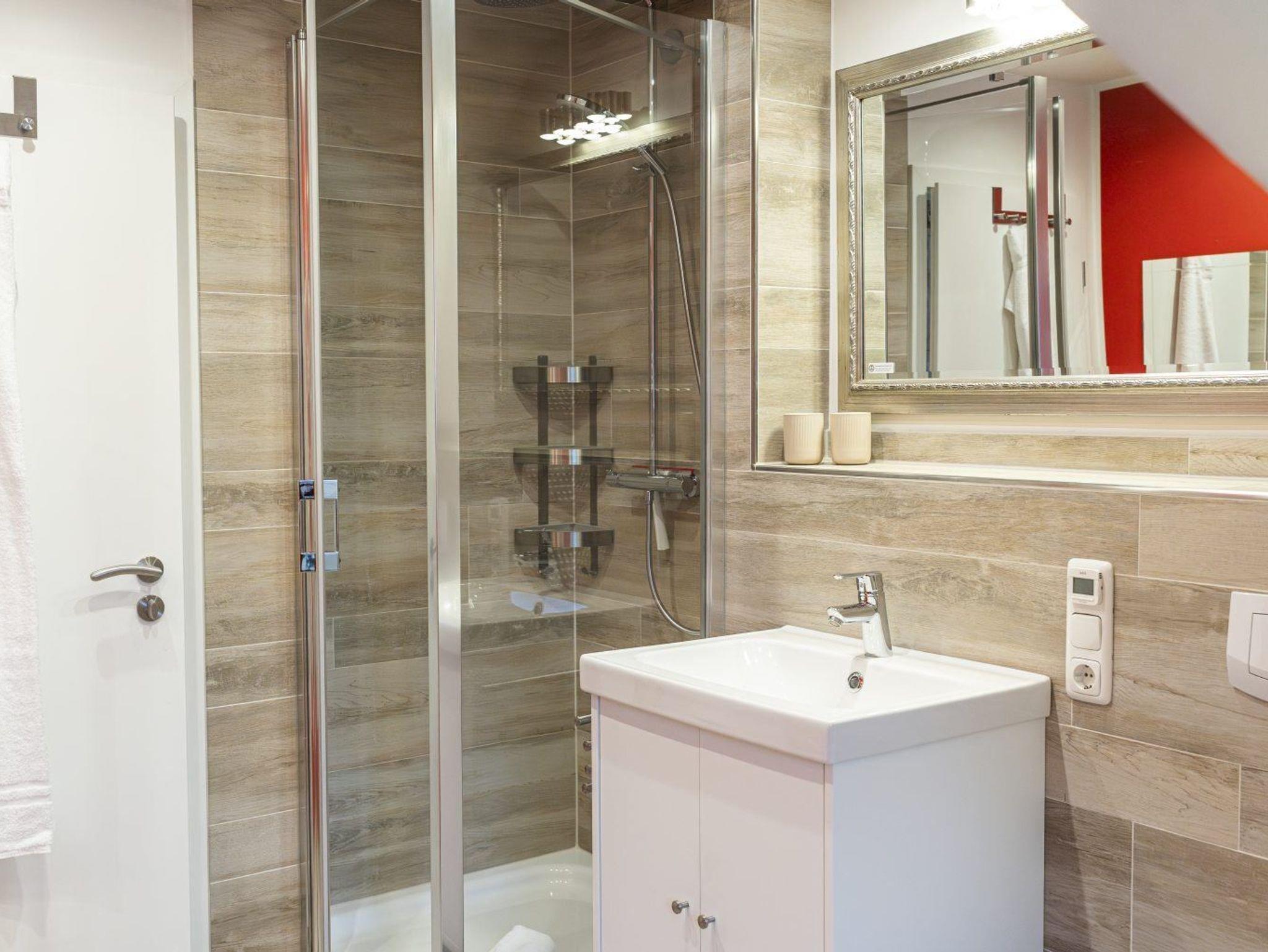 Modernes Badezimmer (Duschbad) mit Dusche (niedriger Eintritt: ca. 15cm), WC, Handtuchwärmer, Waschmaschine, Föhn, Haushaltsschrank mit Staubsauger und Tageslicht.