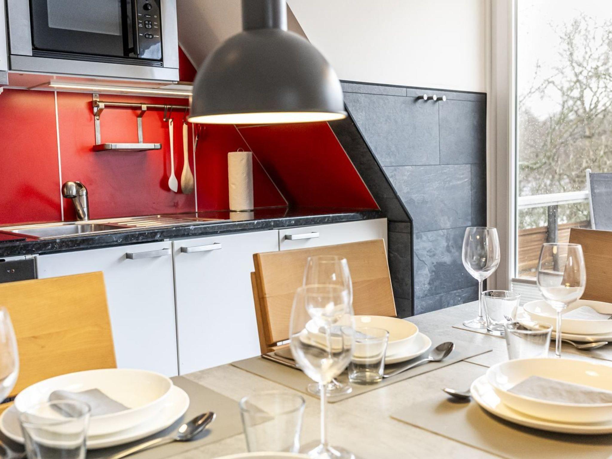 Wohnzimmer mit großem Ecksofa für bis zu 4 Personen, Sessel, SMART-TV (Kabel), Stereo-Kompaktanlage mit CD-Player und Bluetooth-Funktion und Esstisch für 5 Personen (ausziehbar). Für die besondere Behaglichkeit sorgt der Kamin (Bioethanol). Direkter Zugang zum möblierten Südbalkon mit Blick auf den Garten. Halboffene Küche mit Backofen, Mikrowelle, Geschirrspüler, Kühlschrank mit Gefrierfach und Nespresso Kapsel-Kaffeemaschine.