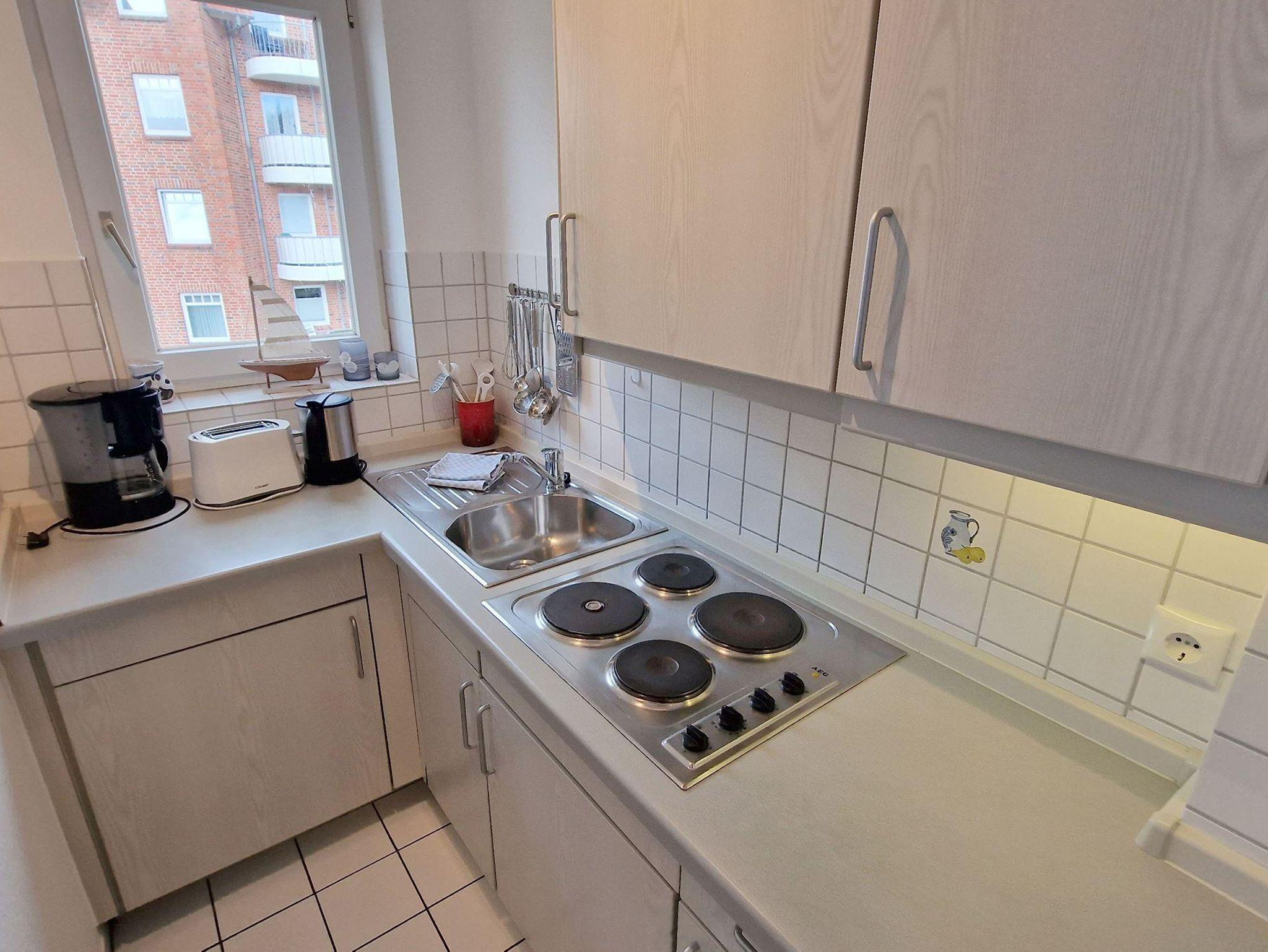 In einer Nische gibt es eine Einbauküche mit einem 4-Platten-Herd, gleich um die Ecke vom Esstisch. Das Bad ist schön hell gefliest. Nachts ruhen Sie auf dem Schrankdoppelbett im Wohnzimmer oder im Doppelbett im Schlafzimmer, tagsüber entspannen Sie auf dem Balkon in Nord-West-Ausrichtung. Duschbad. Nichtraucherdomizil.