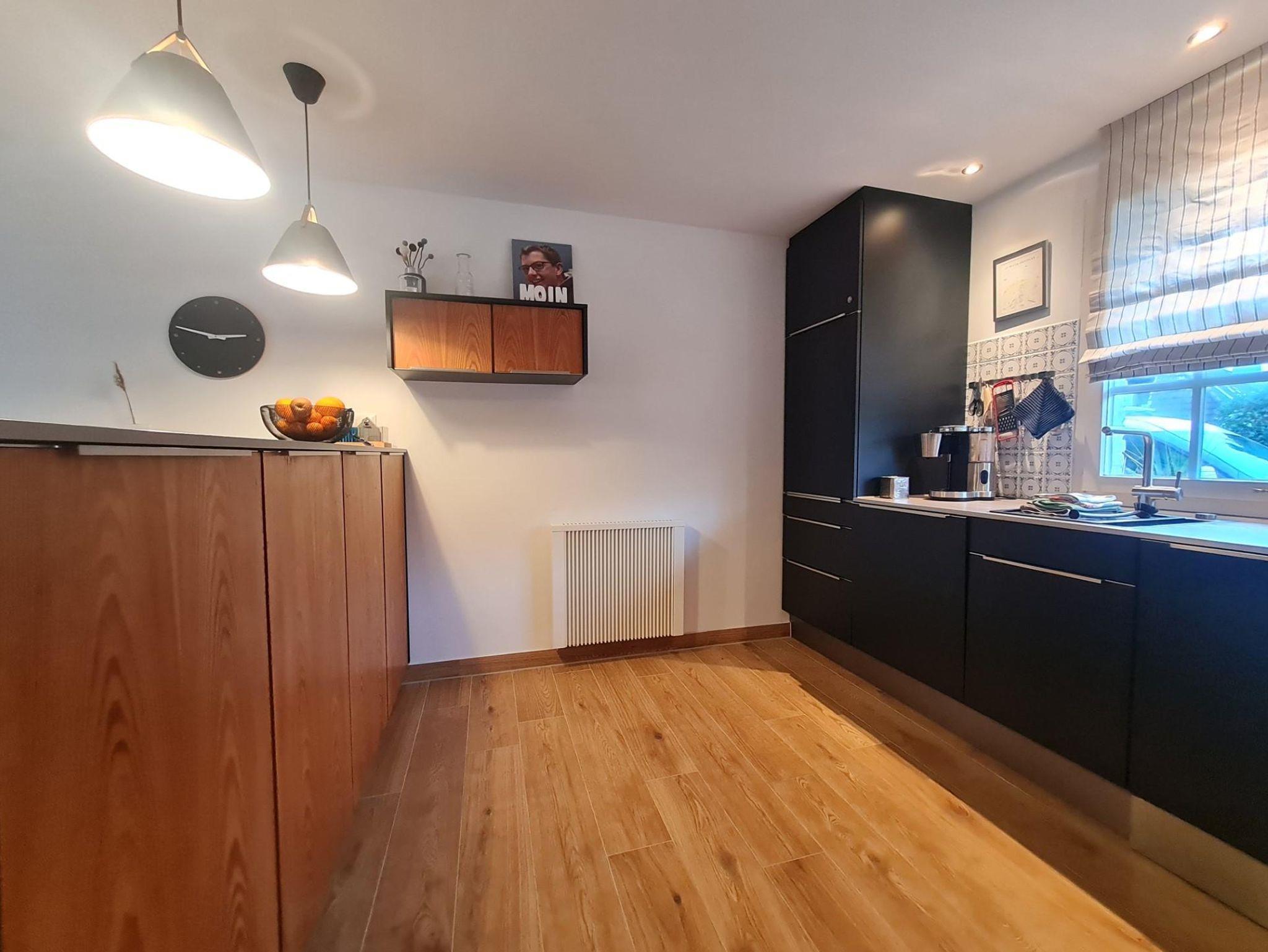 Die gemütlich eingerichtete Haushälfte verfügt über ca. 90m² Wohnfläche. Im Erdgeschoss befindet sich das Wohnzimmer mit dänischem Ofen und offener Küche, der Flur und ein Gäste-WC.
