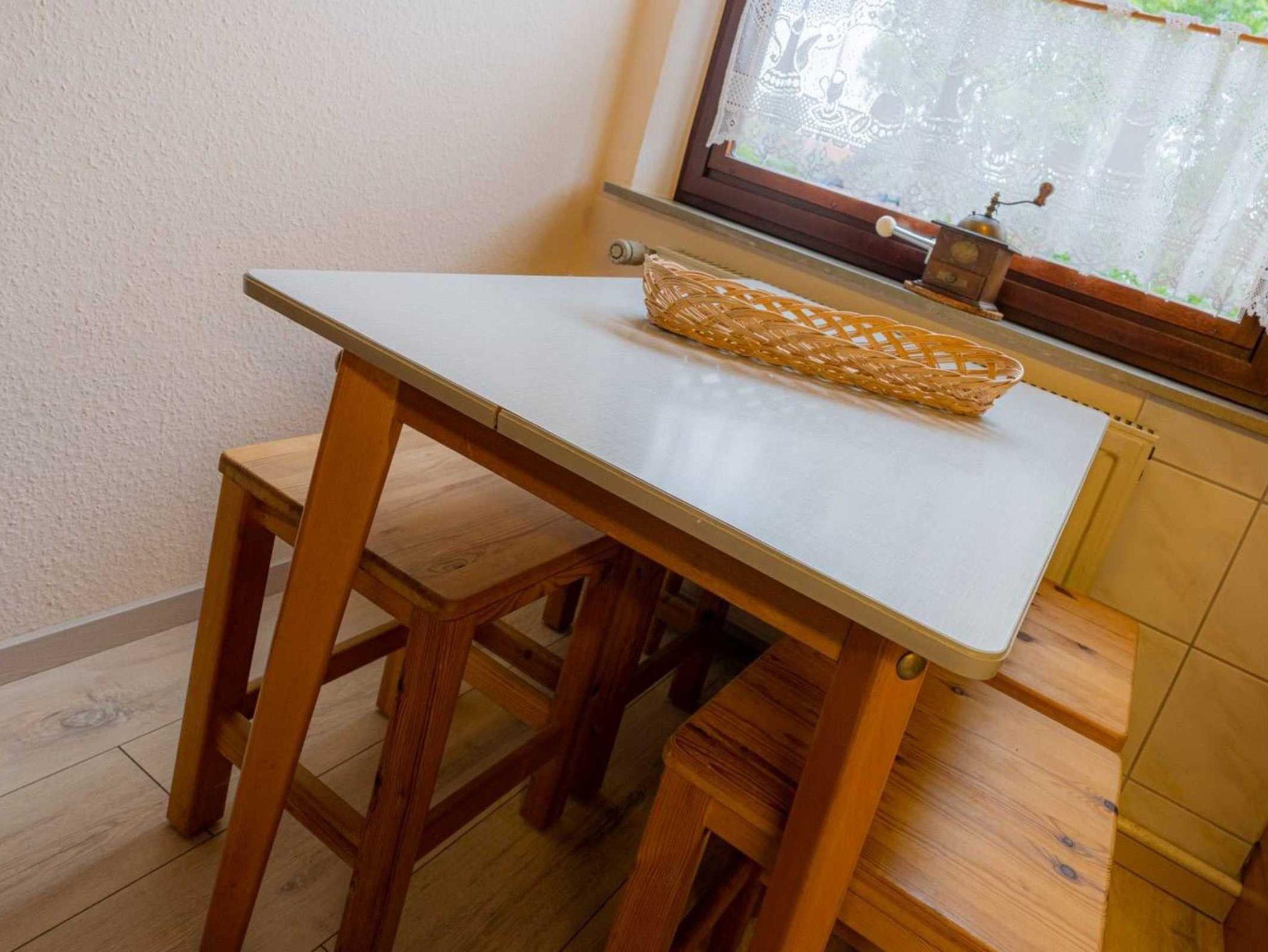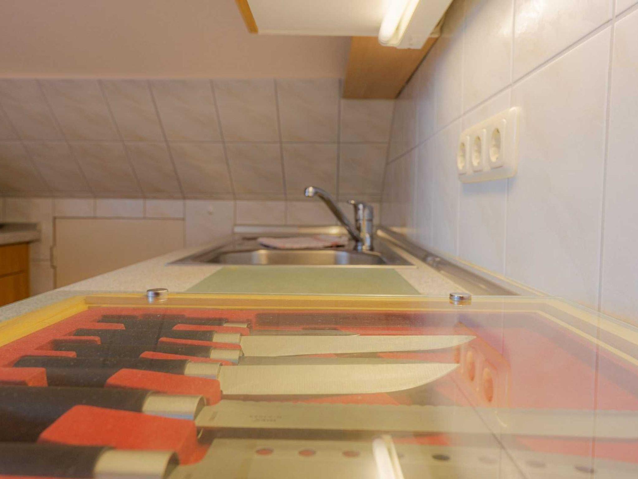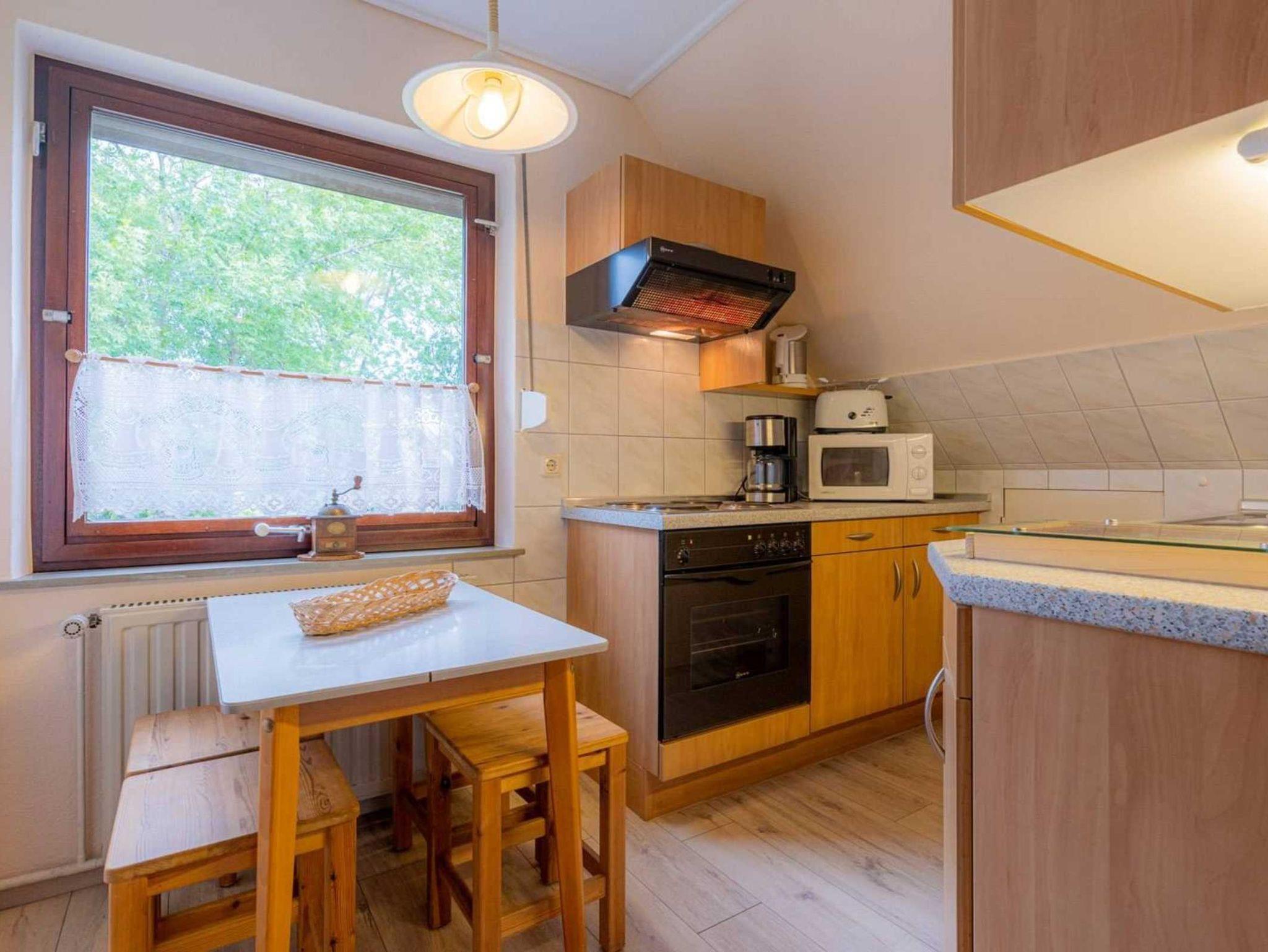 Separate Küche mit Backofen, Mikrowelle, Kühlschrank mit Gefrierfach, kleinem Esstisch und 4 Hockern.