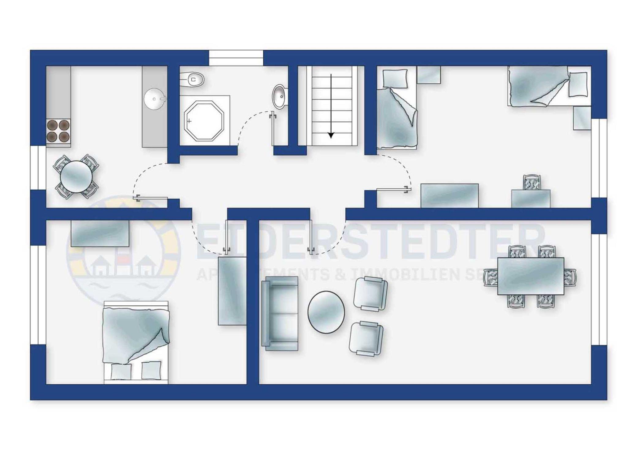 Gemütliche 3-Zimmer-Ferienwohnung mit ca. 60 qm auf 1 Ebene (OG) für bis zu 4 Personen. Naturnahe, ruhige Lage mit Fernblick nahe den Wiesen im Ortsteil Böhl in St. Peter-Ording. Hunde sind herzlich willkommen!