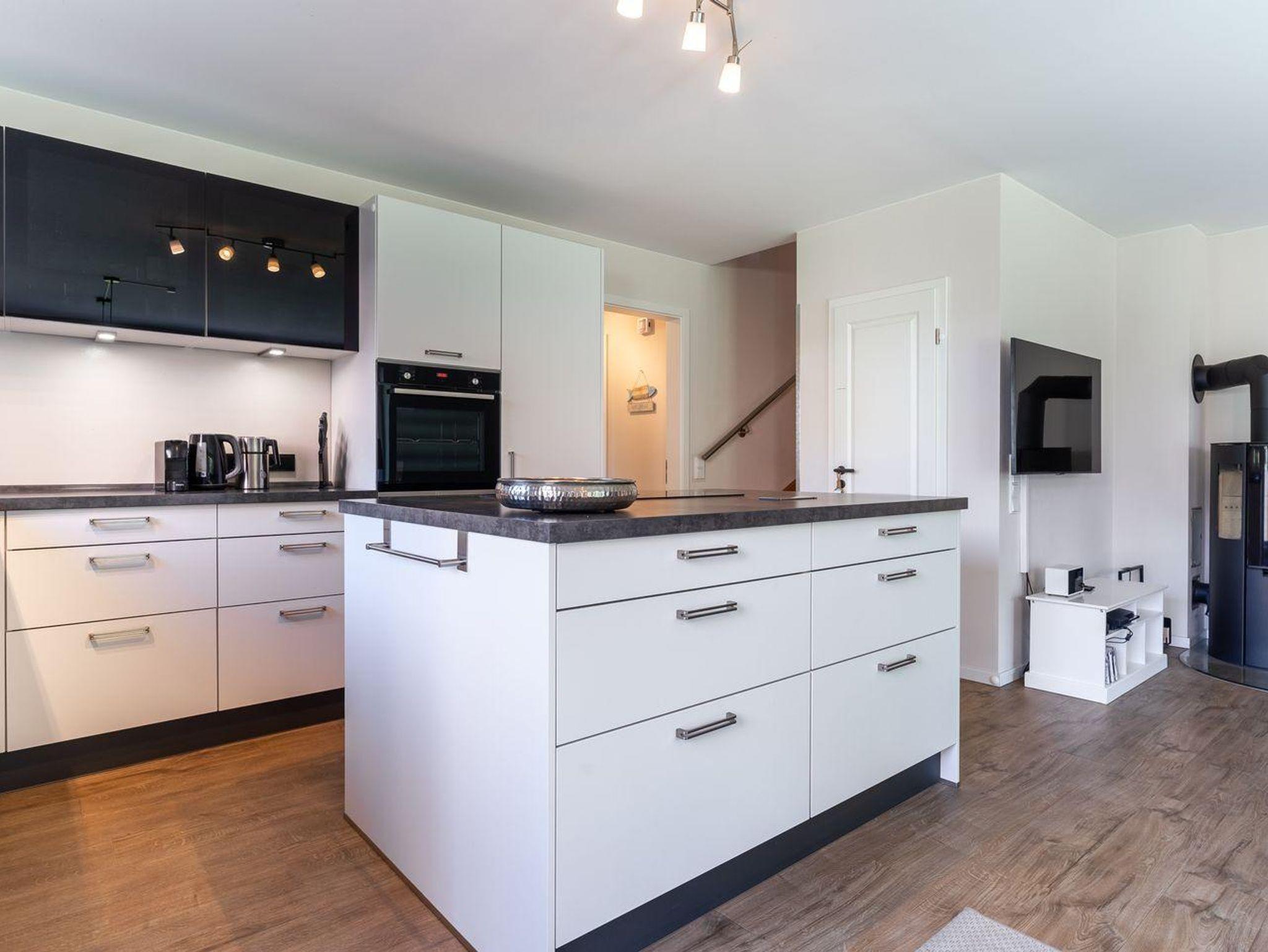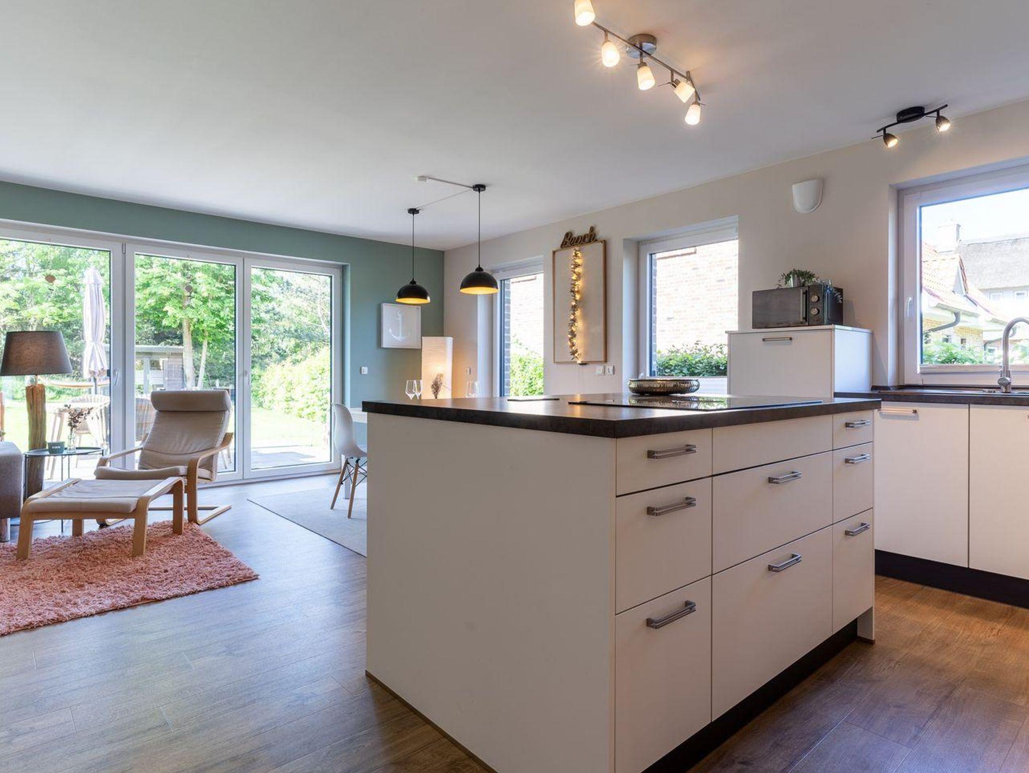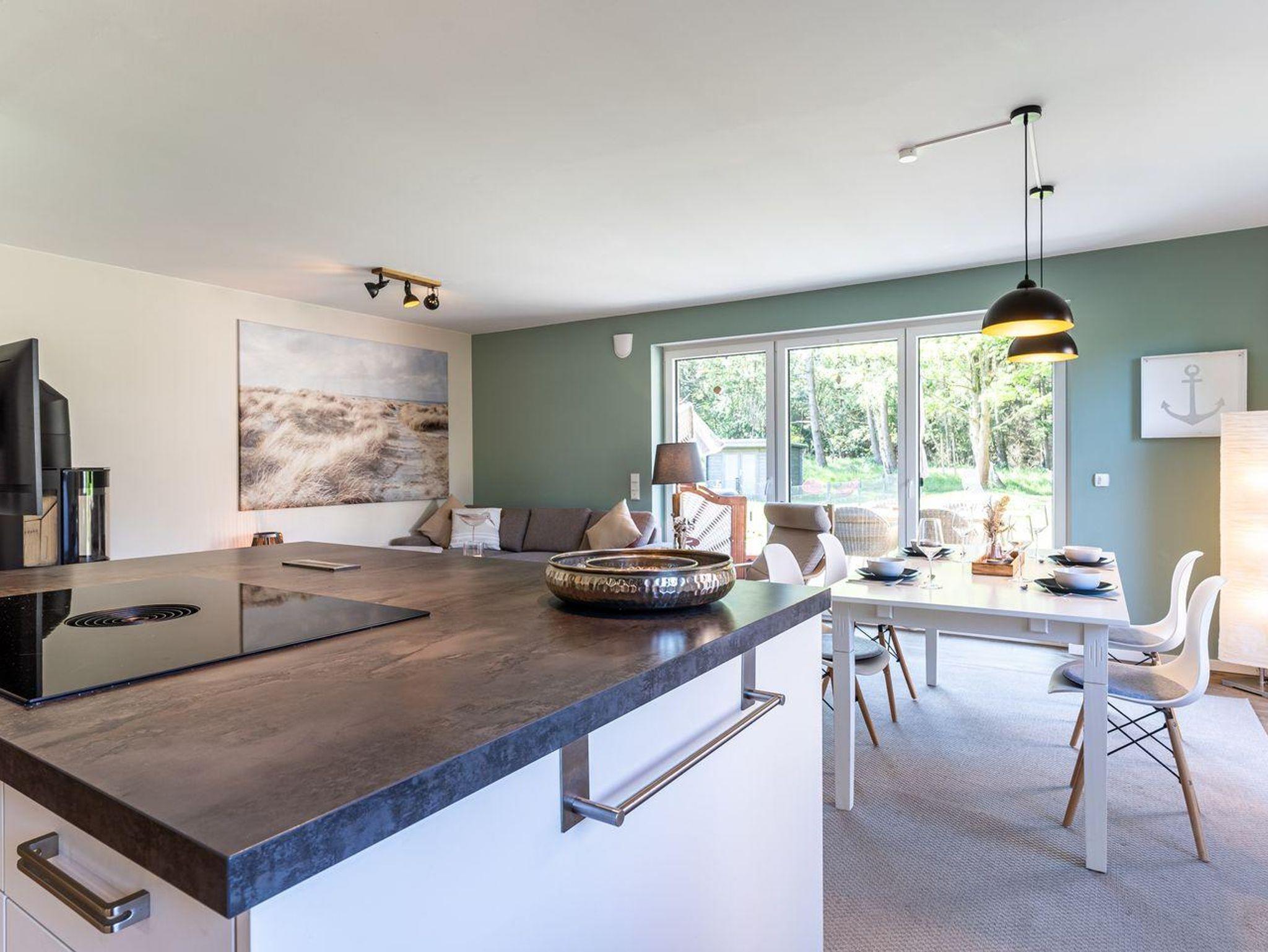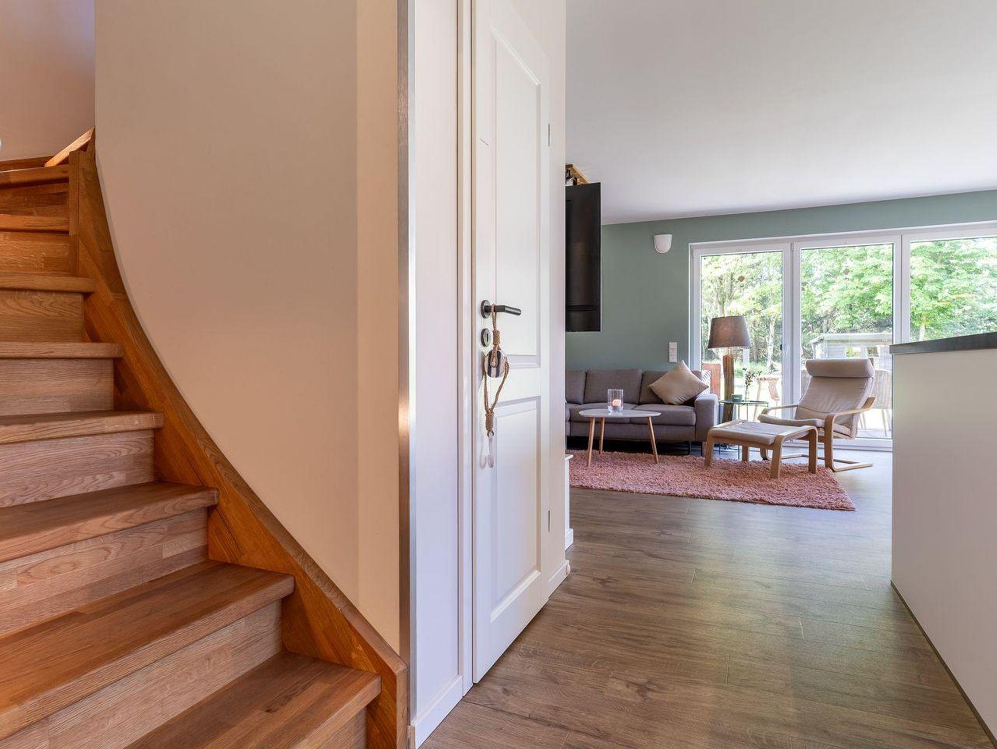 Das Ferienhaus besticht durch hochwertige Möbel und ein harmonisches Ambiente. Im lichtdurchfluteten Wohnzimmer mit TV können Sie herrlich entspannen und die offene Küche mit hochwertigen Elektrogeräten lädt zum gemeinsamen Kochen ein. Hier befindet sich außerdem ein gemütliches Esszimmer. Ob Morgensonne oder Abendsonne - vom Küchenbereich, sowie vom Wohnzimmer gelangen Sie jeweils auf eine große Terrasse mit hochwertigen Gartenmöbeln. Im Erdgeschoss befindet sich ebenso ein Doppelschlafzimmer (180 x 200 cm) und ein angrenzendes, modernes Duschbad. Vom großzügigen Flur mit Hauswirtschaftsraum und Gäste WC gelangen Sie über eine Holztreppe ins Obergeschoss. Hier befinden sich drei weitere gemütlich eingerichtete Schlafzimmer mit komfortablen Boxspringdoppelbetten Ein geräumiges Badezimmer mit Dusche und Badewanne sorgt für zusätzlichen Komfort.