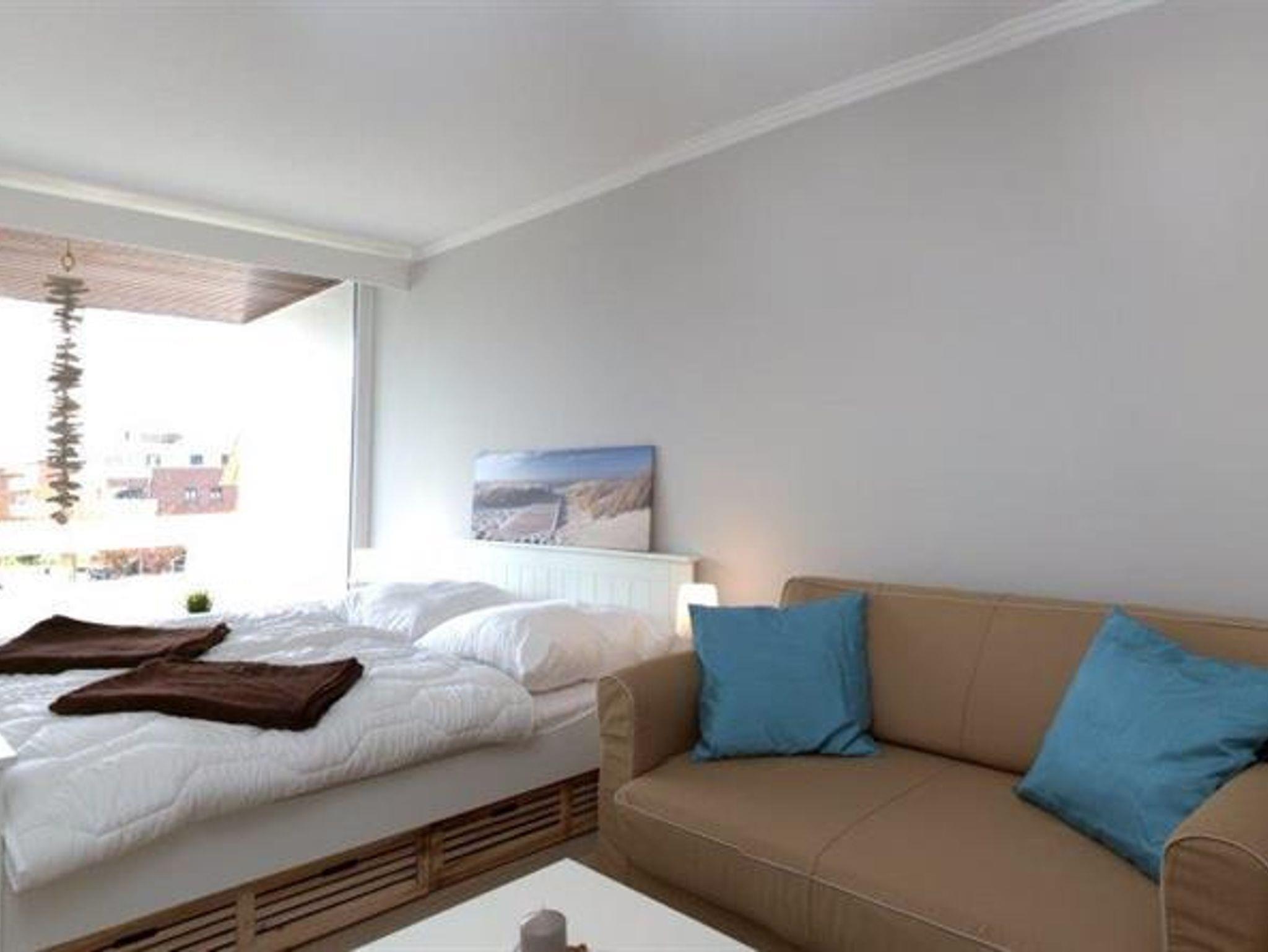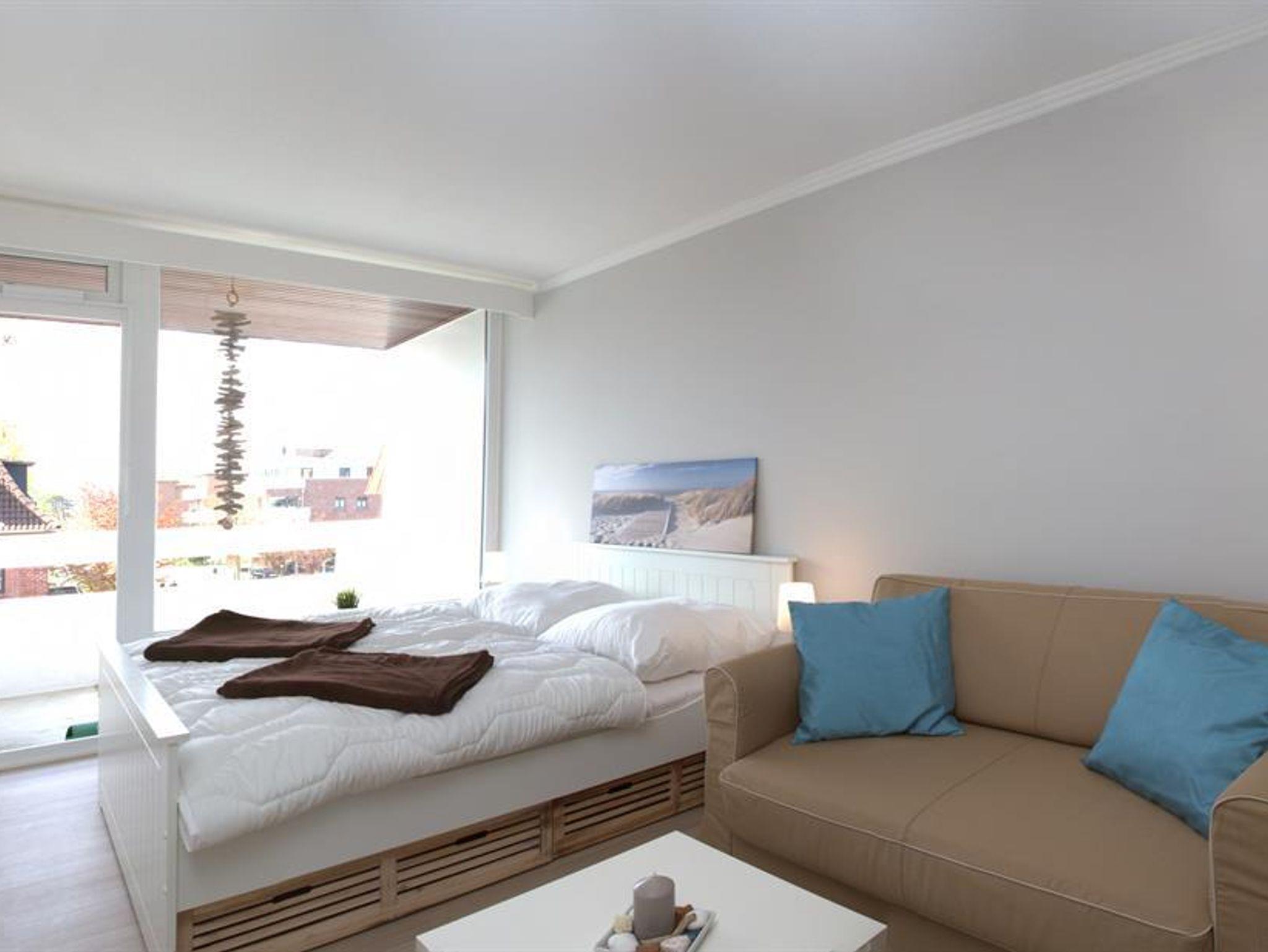 Schlafcouch und südseitigem Balkon in Richtung Seebrücke und Promenade.