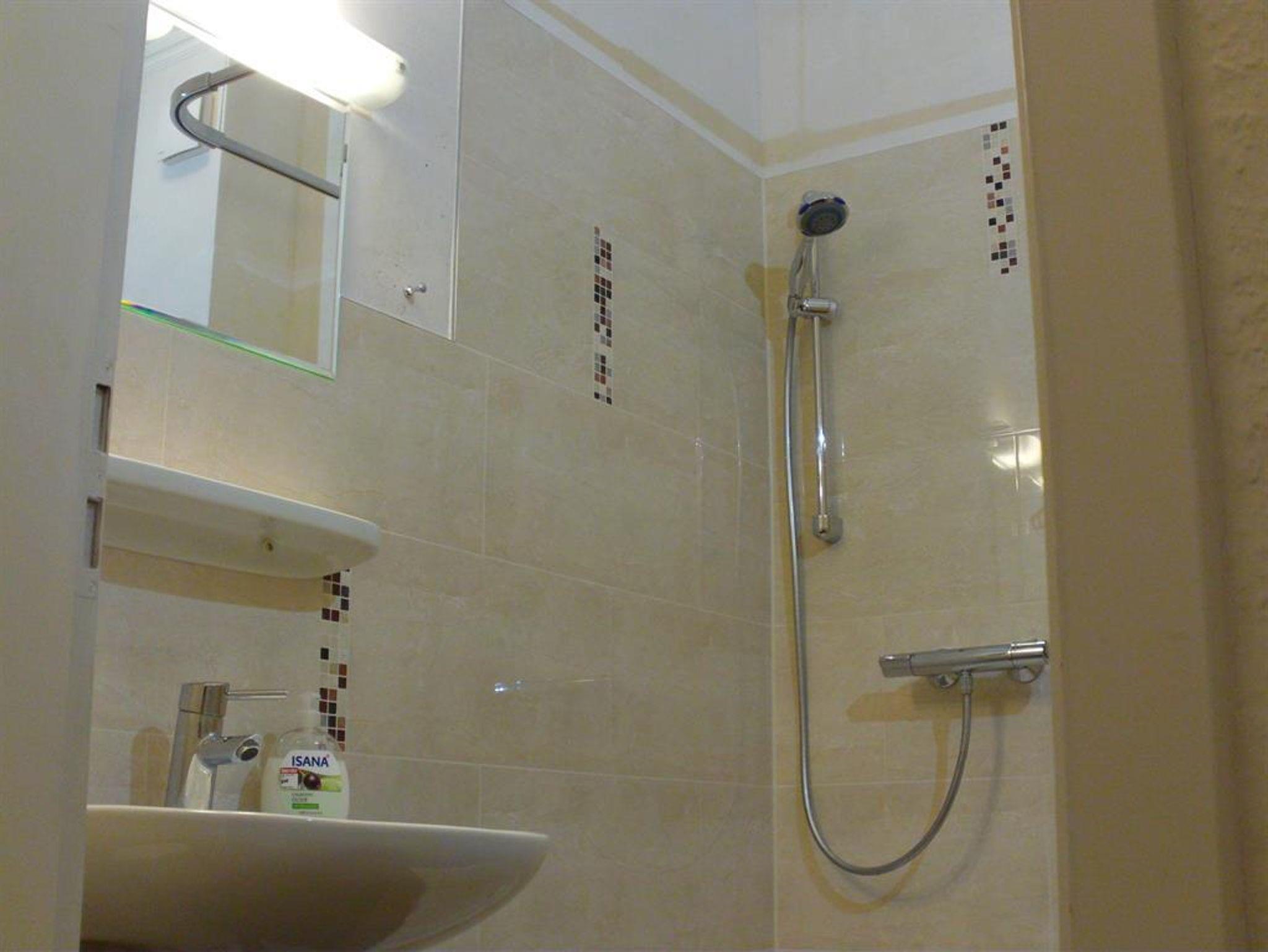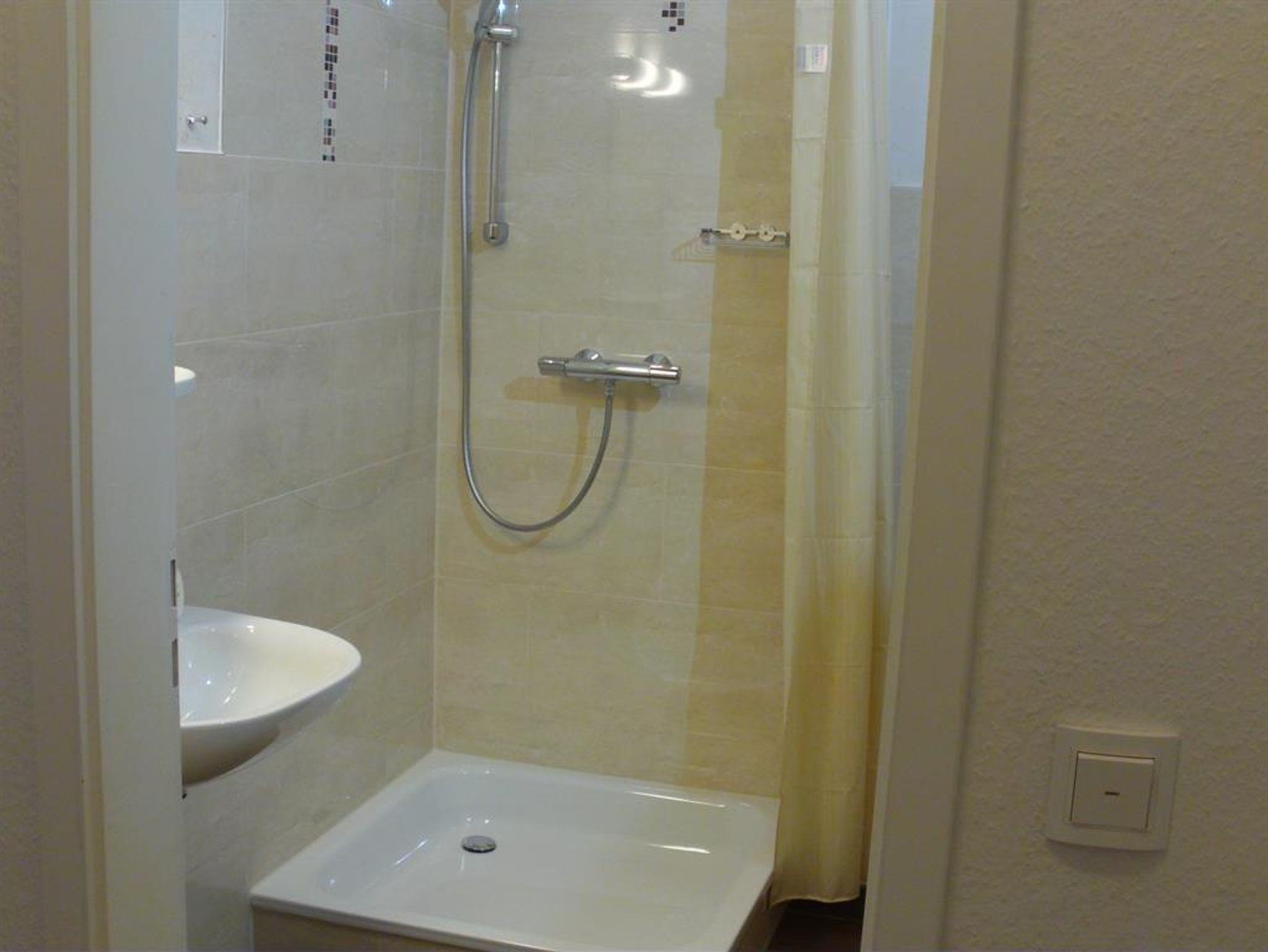 Das Duschbad mit WC ist ausreichend groß und hat eine hohe Deckenhöhe.