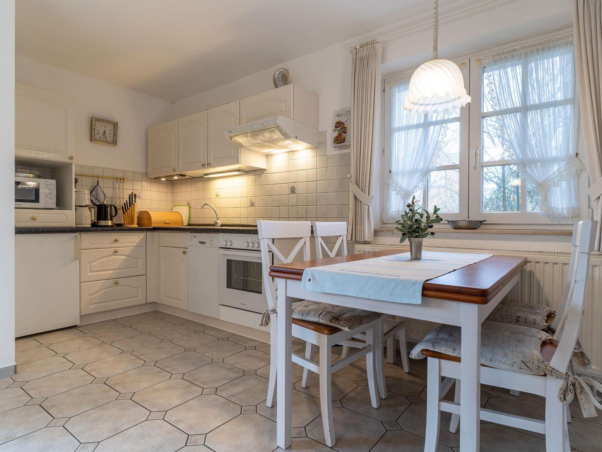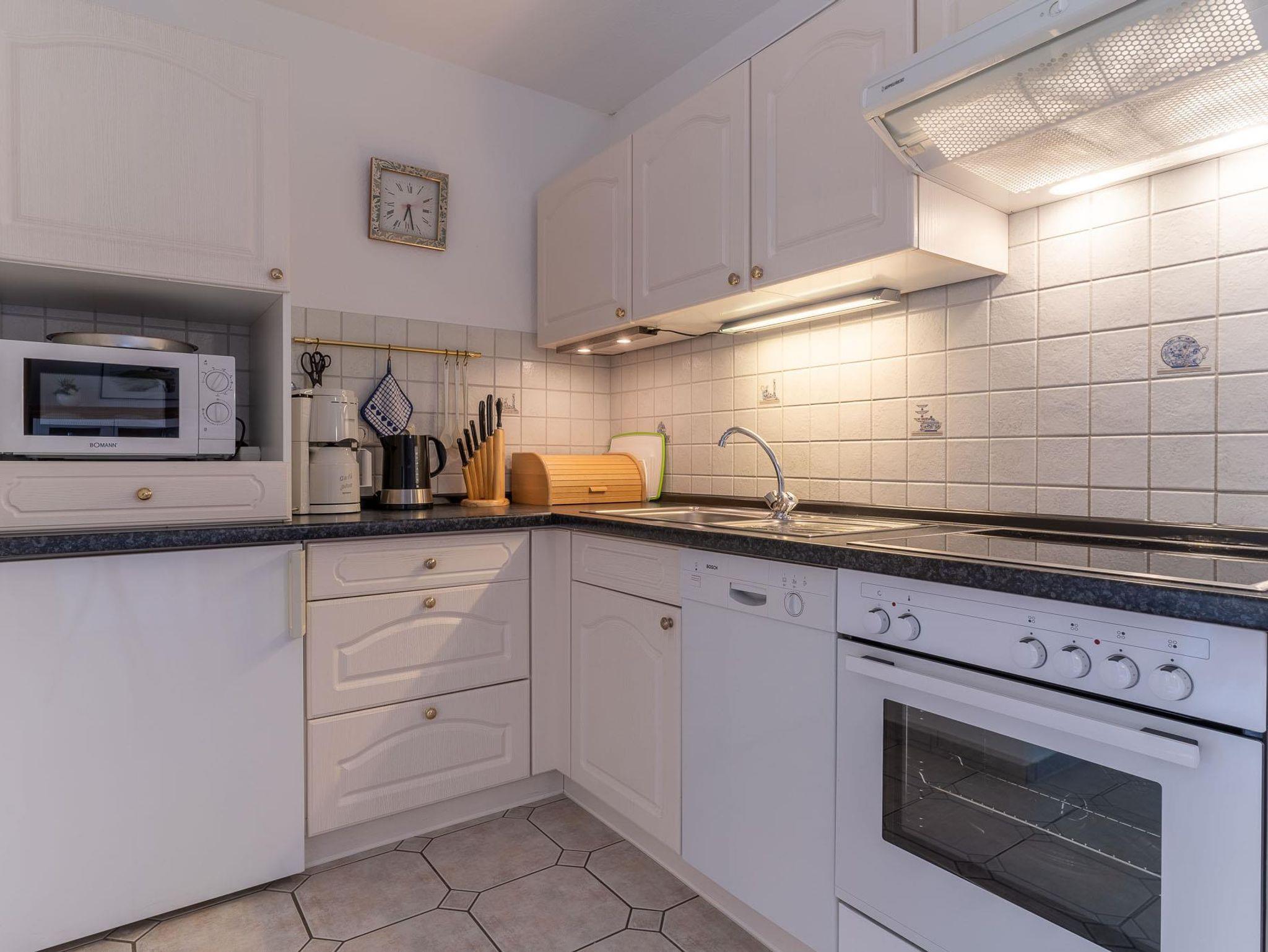 Die Einbauküche ist mit komplettem Geschirr ausgestattet und hält neben neuem E-Herd mit Ceran- Kochfeld und Backofen alle Elektrogeräte bereit, um sich problemlos im Urlaub selbst versorgen zu können. (Kühlschrank, Mikrowelle, Spülmaschine, Kaffeemaschine , Toaster, Wasser- und Eierkocher )