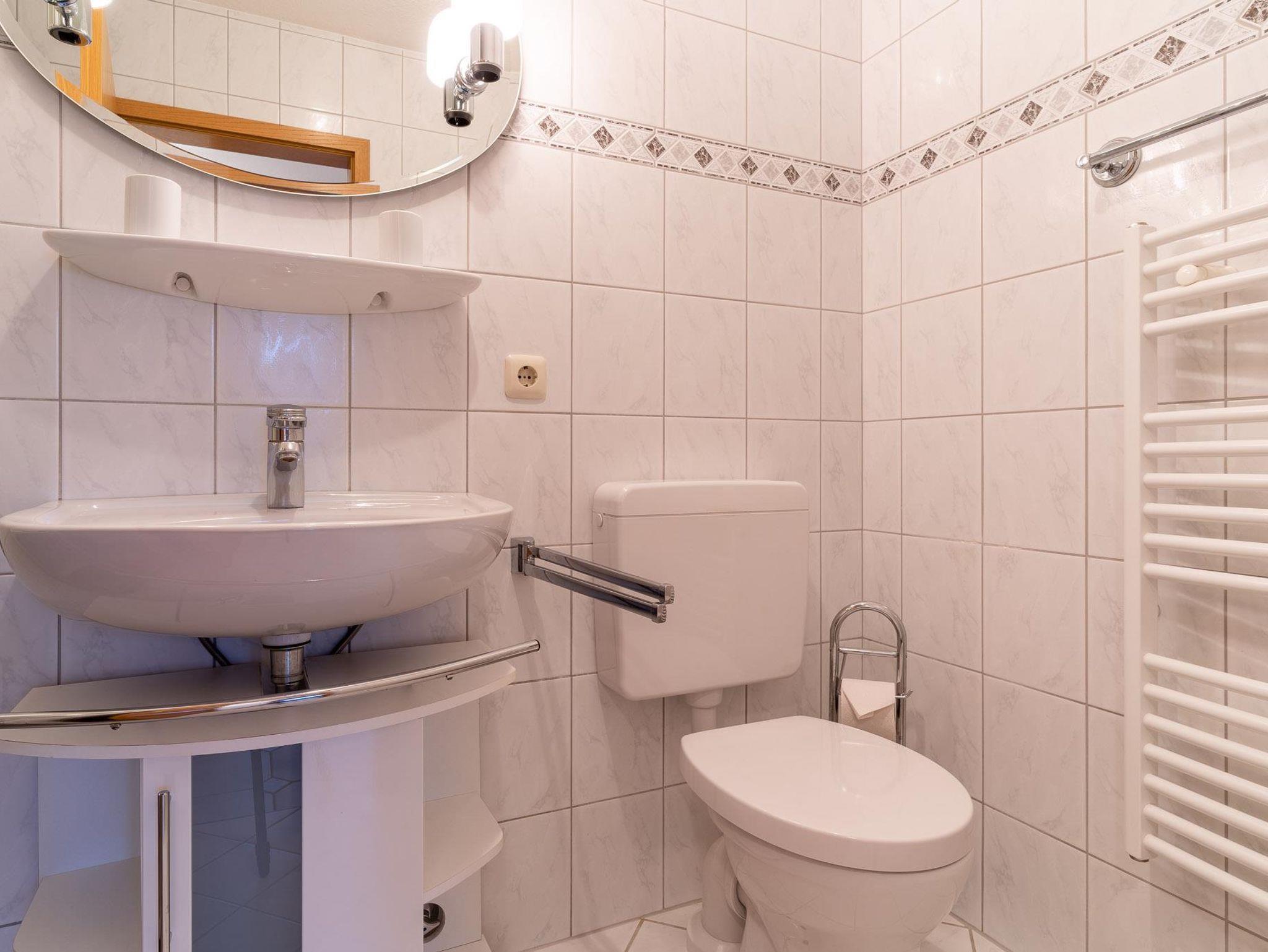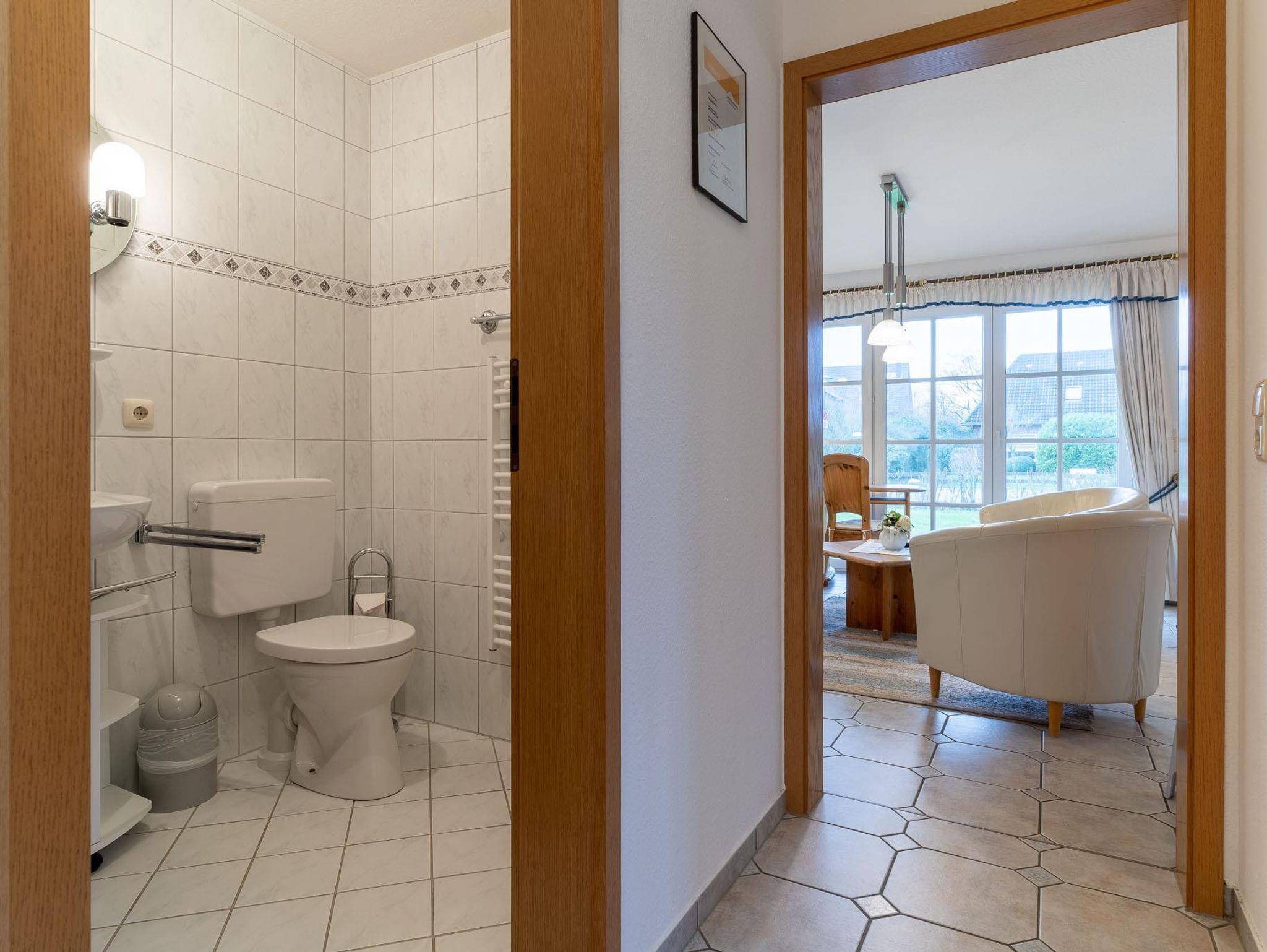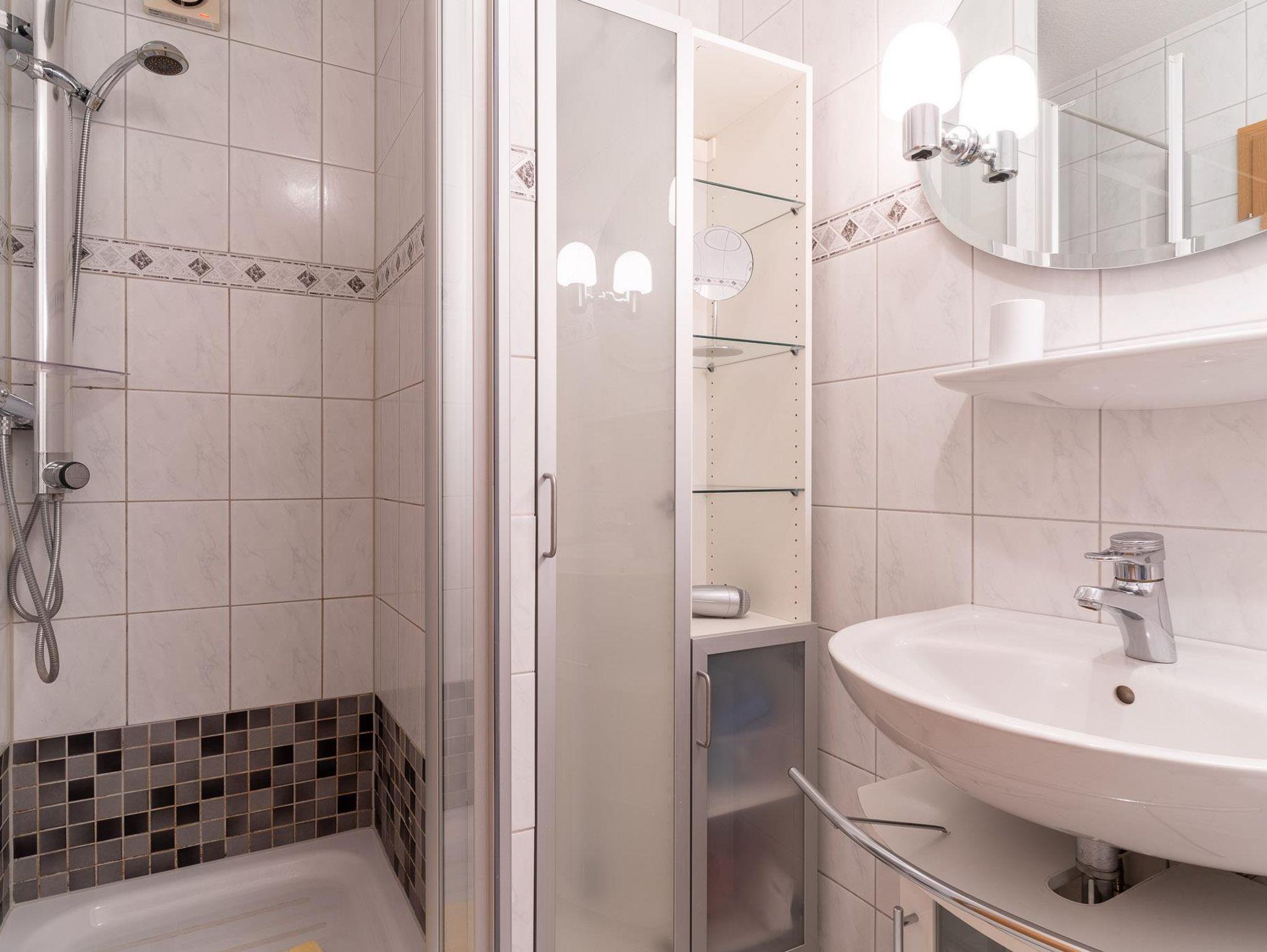 Die Fußböden der Schlafräume weisen Laminat auf, Wohnraum, Flur und Duschbad sind gefliest. Nach der Renovierung 2015 hat die Dusche jetzt einen flachen Einstieg, ein Handtuch- Trockner und ein neuer Waschtisch mit Unterschrank werten das Bad auf. Handtücher (1 gr. und 2 kl. je Person) und Bettwäsche sind einmalig inklusive.