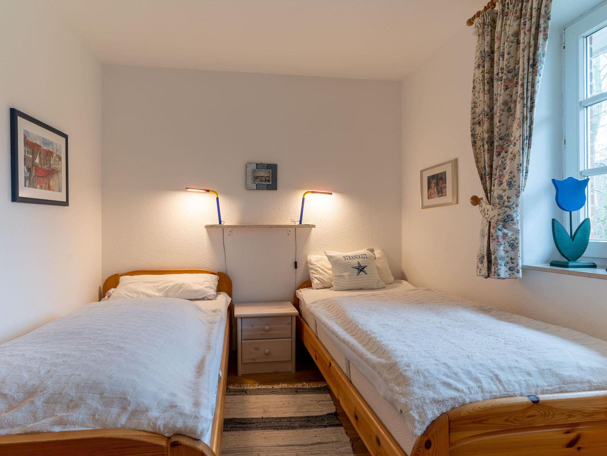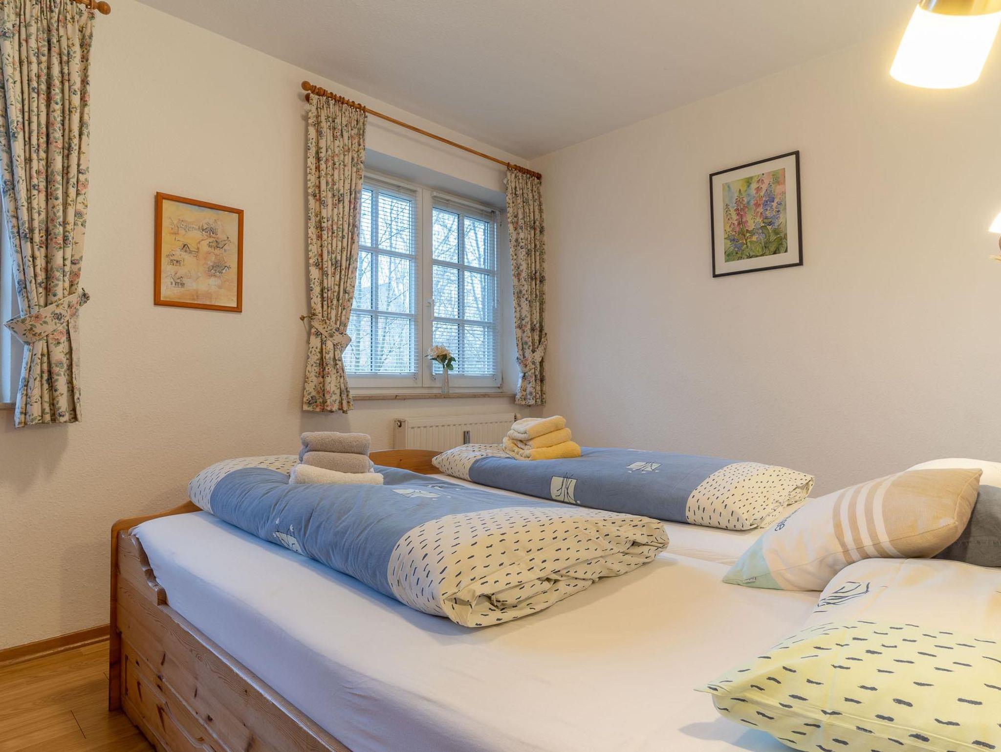 Den Schlafräumen geben helles Kiefer-Mobiliar mit ausreichend Stauraum und geschmack-voll ausgewählten Accessoires eine persönliche Note. Der größere der beiden verfügt über ein Doppelbett (180×200 cm), einen Herrendiener mit Sitz und einen Tresor für Wertsachen; der andere über 2 Einzelbetten (90 x 200 cm) und eine kompakte Stereoanlage mit CD-Player. Die Betten haben verstellbare Lattenroste mit allergiegerechten Auflagen.