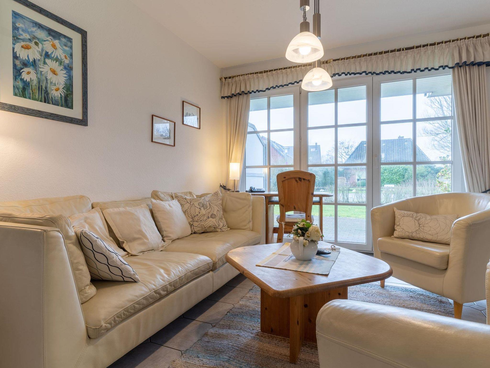 Vom Wohnraum aus gelangen Sie ebenerdig auf die SW/ W ausgerichtete Terrasse mit Sitzgruppe , Sonnen- Liegen und -Schirm. Hier können Sie einen langen Strandtag bei Sonnenuntergang stimmungsvoll ausklingen lassen.