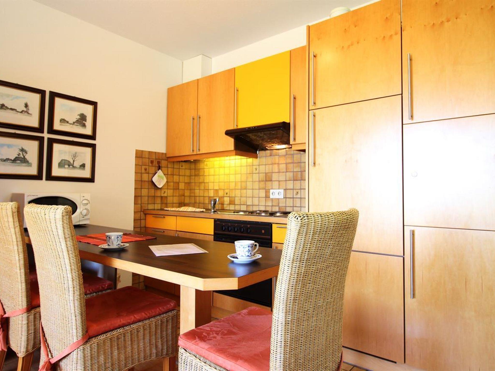 Die angrenzende Küche ist komplett ausgestattet mit Wasserkocher und Geschirr.